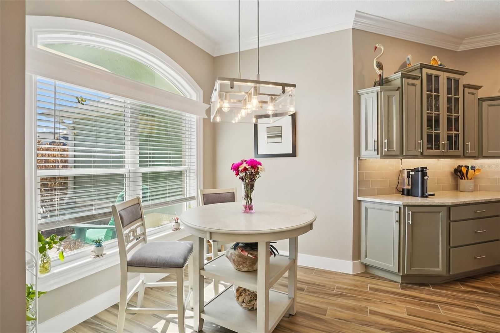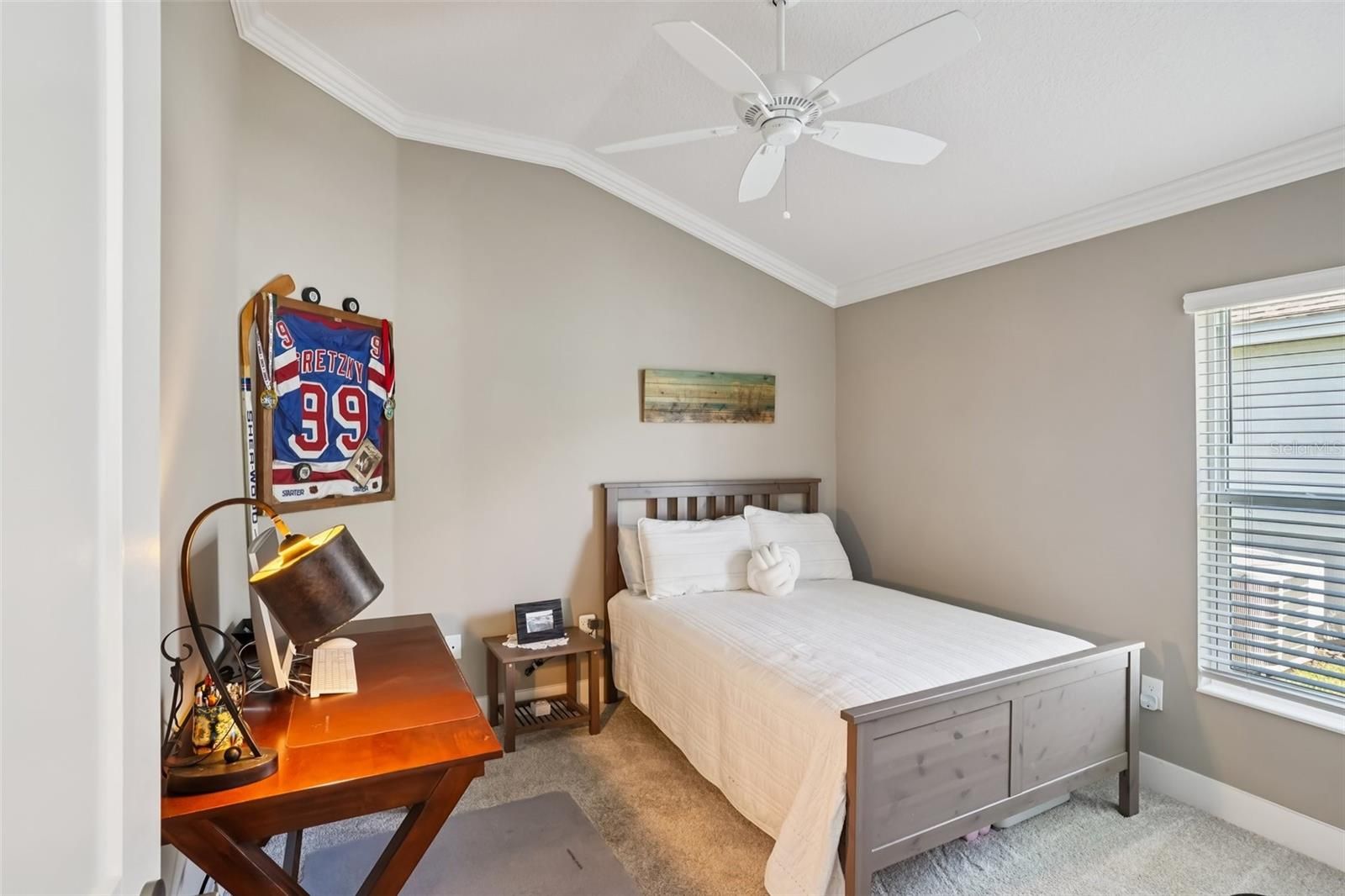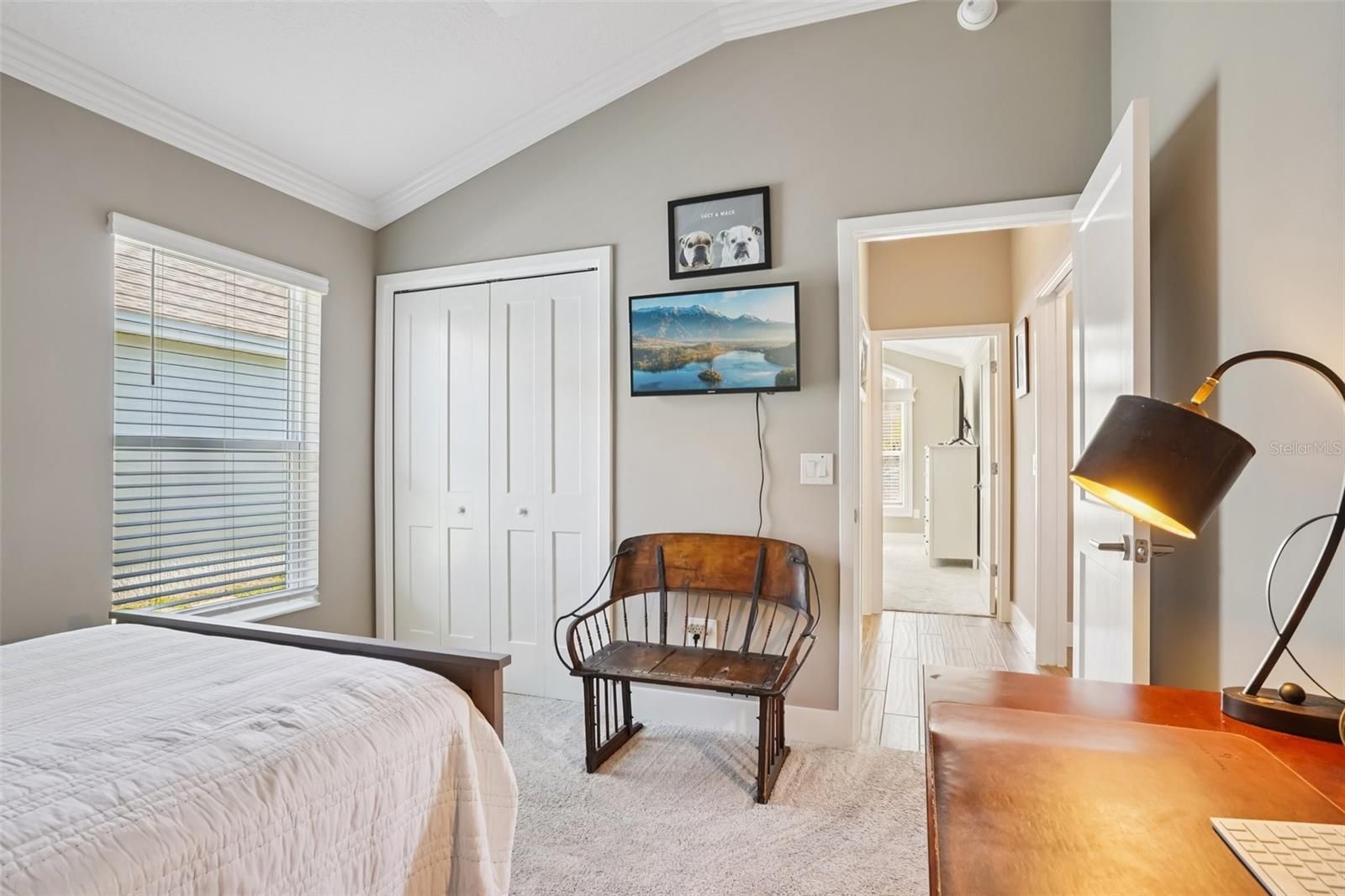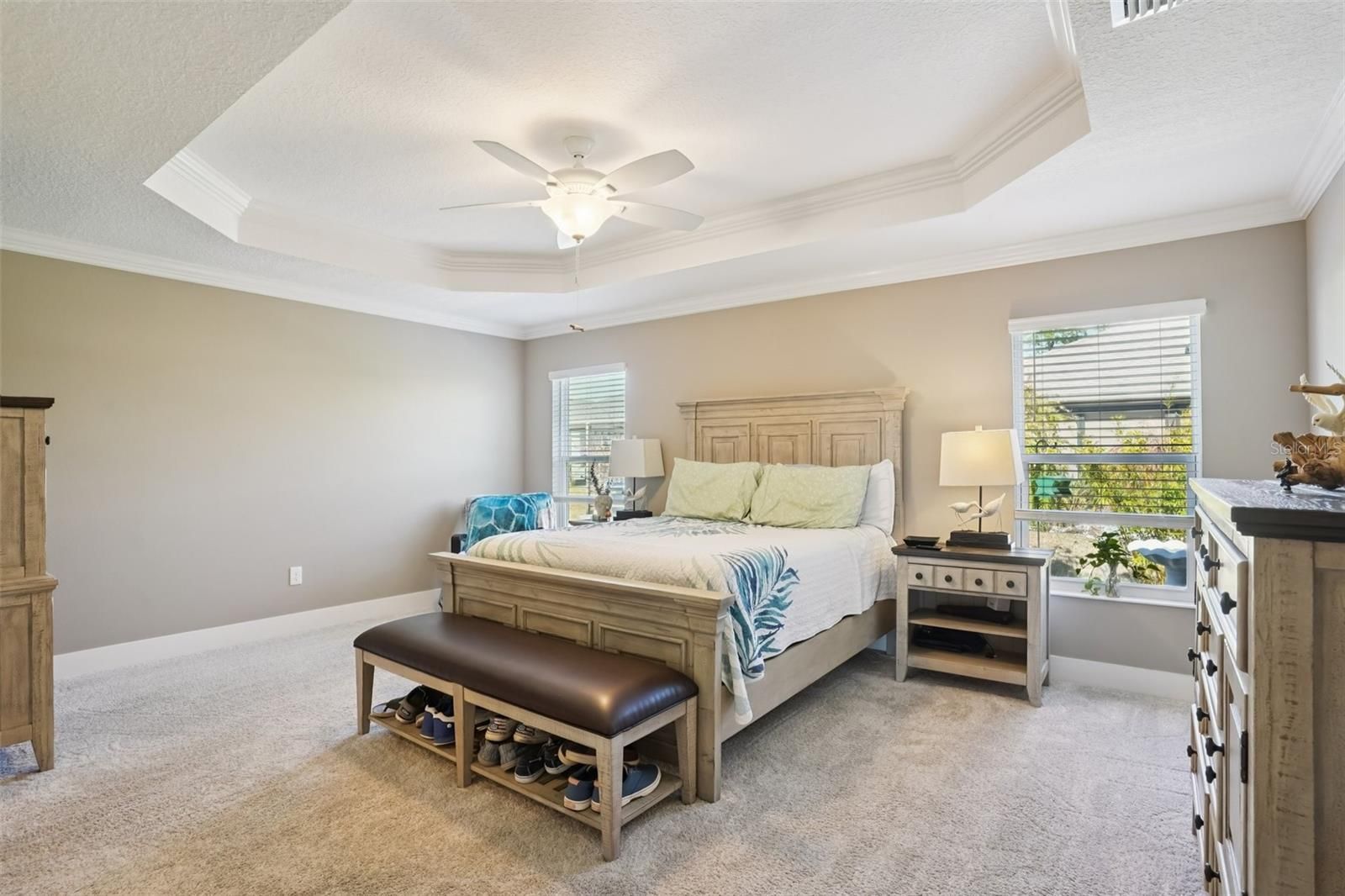 - Ceiling Fan(s), Crown Molding, Eat-in Kitchen, Living/Dining Room, Open Floorplan, Main Level Primary, Solid Surface Counters, Split Bedrooms, Stone Counters, Walk-In Closet(s), Window Treatments