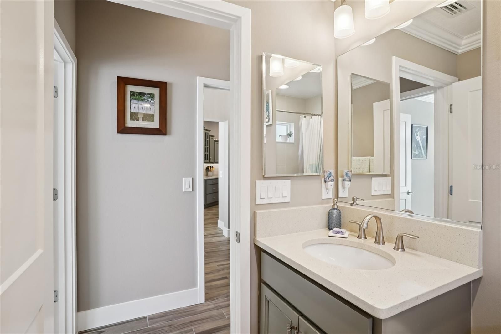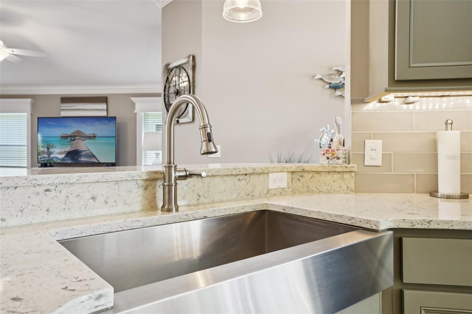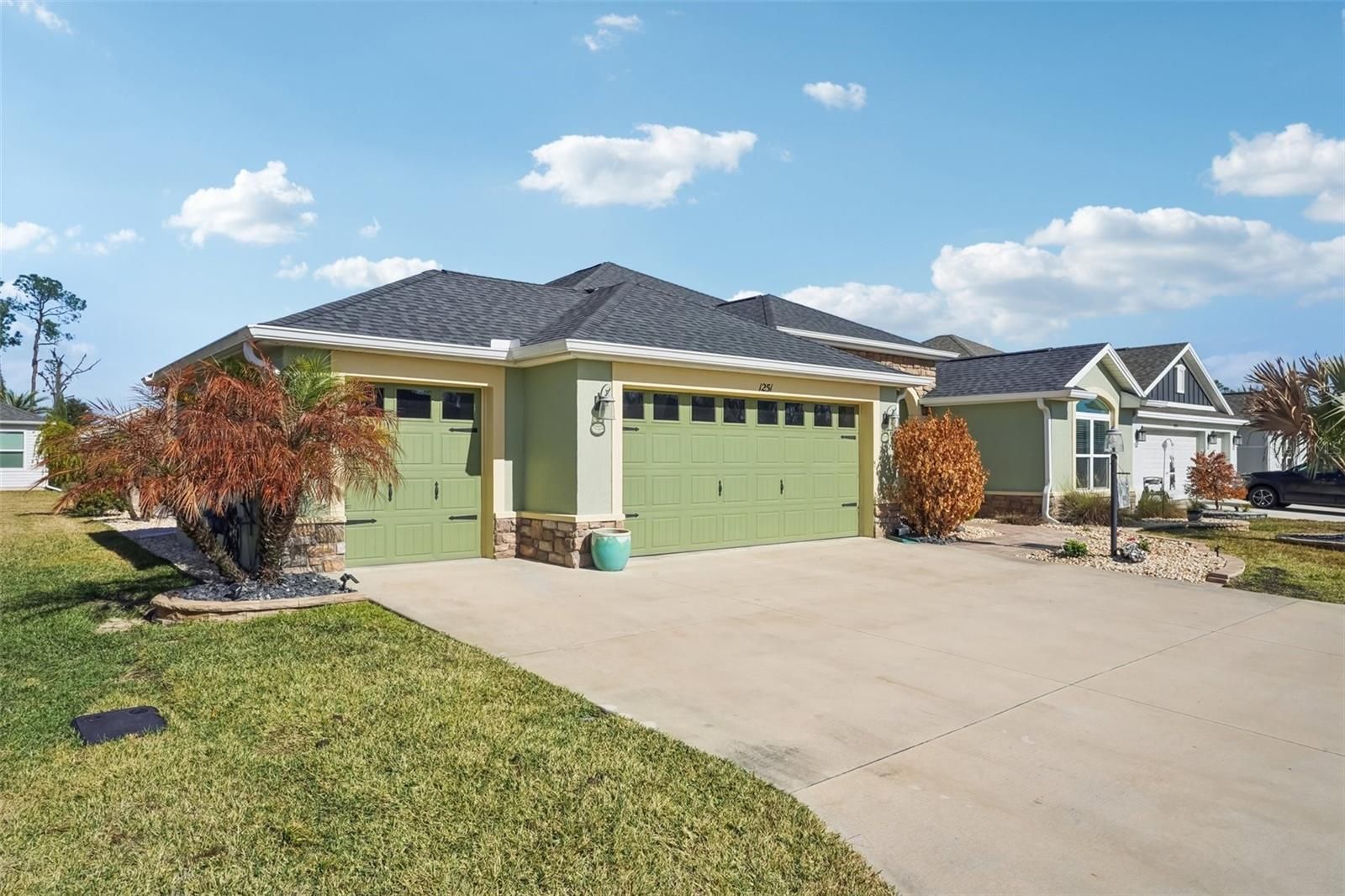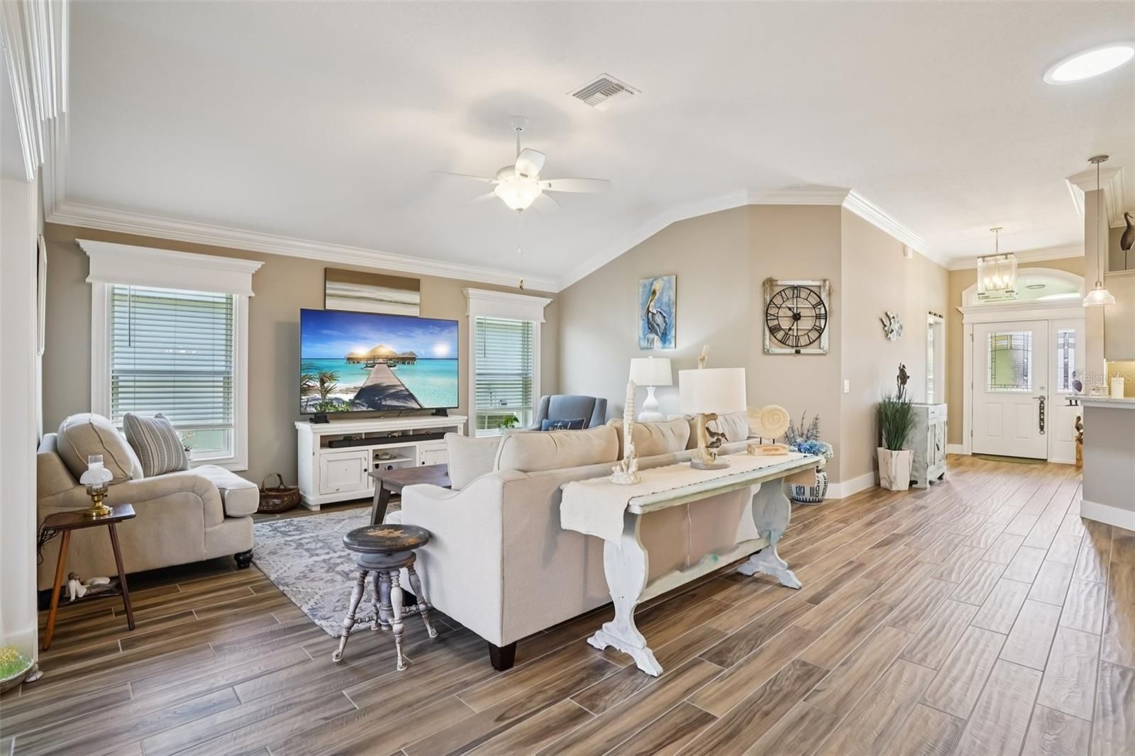 LOCATION, LOCATION, LOCATION!!! Presenting this exquisite Gardenia Designer Model in the highly sought-after Village of Hawkins, perfectly positioned in the vibrant heart of The Villages. This central location offers exceptional convenience to shopping, dining, recreation, and nightly entertainment, making it one of the most desirable areas in the community. Constructed with solid concrete block and stucco, this beautifully maintained 3 bedroom, 2 bathroom home showcases a thoughtfully designed open floor plan ideal for both everyday living and entertaining. Ceramic tile flows throughout the main living areas and bathrooms, complemented by crown molding through out the entire home. The home has a split bedroom floor plan that provides a private wing for guests. The kitchen is tastefully appointed with quartz countertops and stainless steel appliances, and a natural gas range, creating a stylish and functional space for cooking and gathering. While a solar tube in the living area bathes the space with soft natural light. The spacious 28' x 10' enclosed lanai features premium glass windows and sliding doors, providing additional year-round living space. Step outside to enjoy the expanded birdcage enclosure wraparound paver patio and lush landscaping, offering a private and inviting setting for relaxation or entertaining friends. The home also features fresh exterior paint, full property rain gutters, an expanded front patio with a storm door, and an epoxy-coated garage floor. Complementing the property is a 2 car garage plus a golf cart garage, delivering ample storage and convenience. Also a Nuvo H2O water filtration system ensures high quality water throughout the home. The location is truly unbeatable, just minutes from live entertainment, restaurants, and market options at Sawgrass Grove. You are centrally positioned with effortless golf cart access to Brownwood Paddock Square and the exciting New Eastport area which features a hotel, waterfront dining, nightly entertainment, and walking paths/ trails. Nearby recreation options include state of the art Ezell Recreation Center, along with Aviary and Homestead Centers offering family pools, astronomy pads, and a variety of indoor activities such as darts, pool tables, shuffled board, and more. Residents enjoy access to championship and executive golf courses, neighborhood pools, and over a 100 miles of golf cart friendly trails, and the vibrant lifestyle that makes The Villages one of Florida's premier active adult communities. Welcome home to your already upgraded property!!! This is more than a home - it's the lifestyle you've been waiting for!
