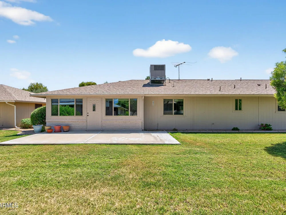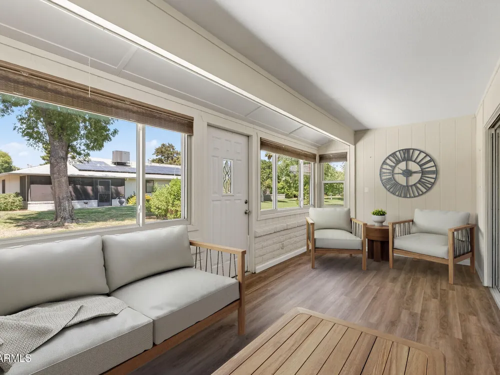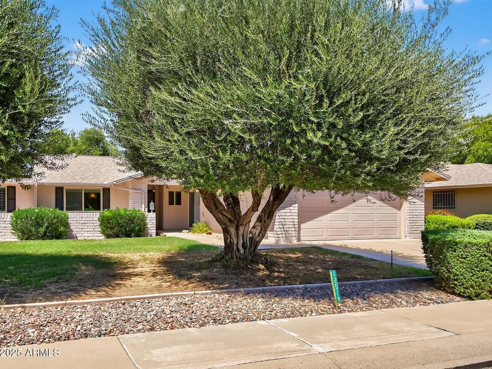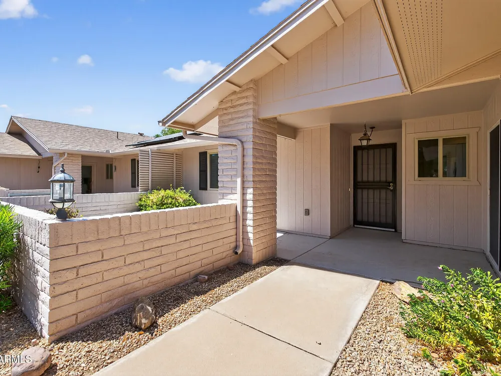 Almost like living on the golf course with Lush Grass front & backyards! This Gemini Twin is super clean & well maintained. New 50gal water heater in 2025. Luxury Vinyl plank installed in the kitchen and traffic areas in 2020. Roof replaced in 2017. New comfort height bathroom vanities with quartz counter tops, new sink, faucet features, lights and mirrors installed in both bathrooms. Windows, slider, garage door and garage door opener were all replaced in the past few years. Bali honeycombed shades throughout that open from the bottom and the top. Solar tubes provide natural light. Primary bedroom is spacious with an ensuite bath has a walk-in shower and HUGE walk-in closet. Fully enclosed patio/AZ room with dual paned windows. BIG utiltiy room with Whirlpool front load Washer & Dryer on pedestals AND plenty of room for an office space or hobby room. 2 car garage with additional storage cabinets. Charming front courtyard entrance with a partially covered patio. Low maintenance as the HOA covers the front and backyard landscape, trash collection, exterior paint, trash and water. Easy cart ride to all SCW golf courses, rec centers and shopping.