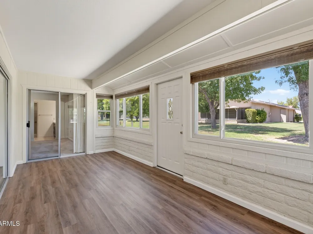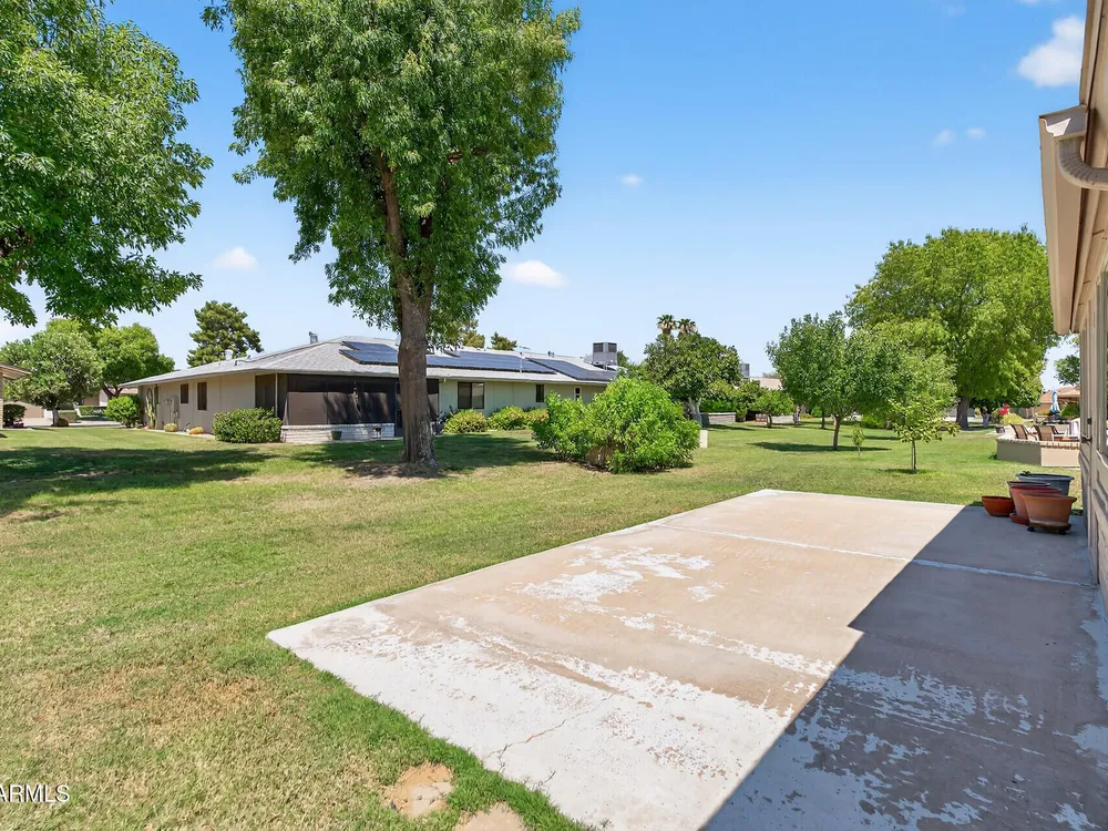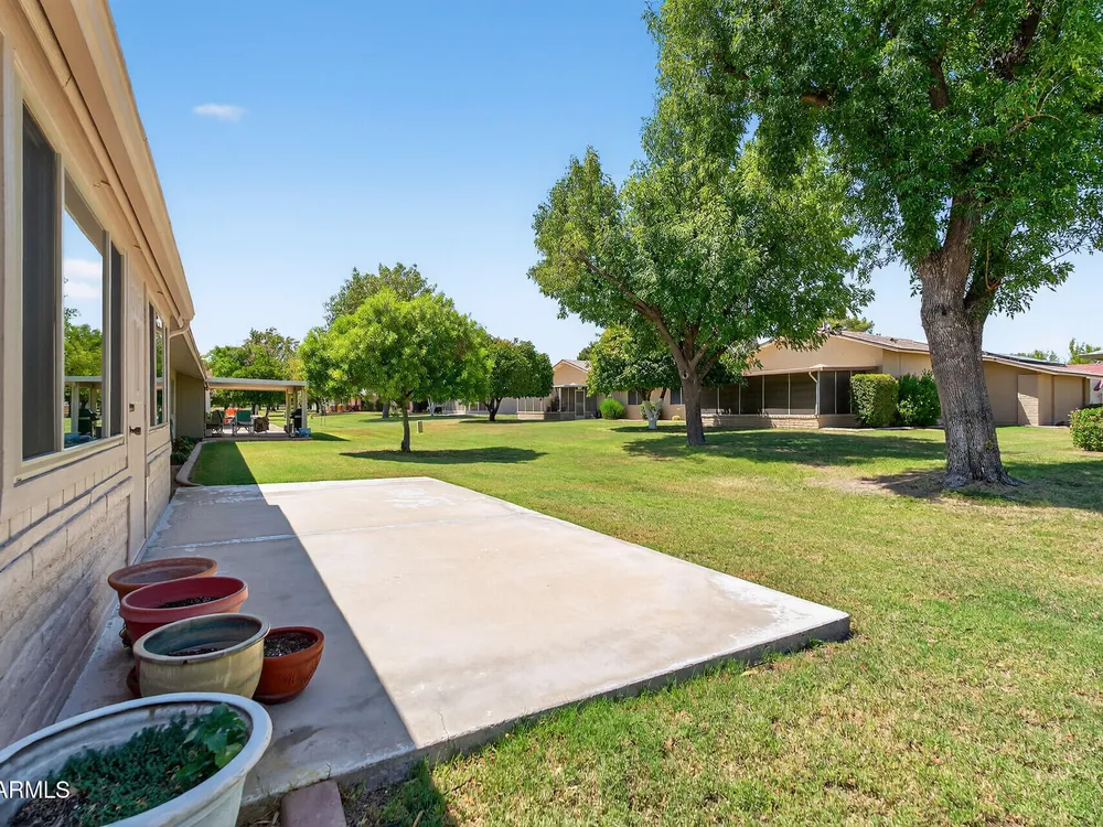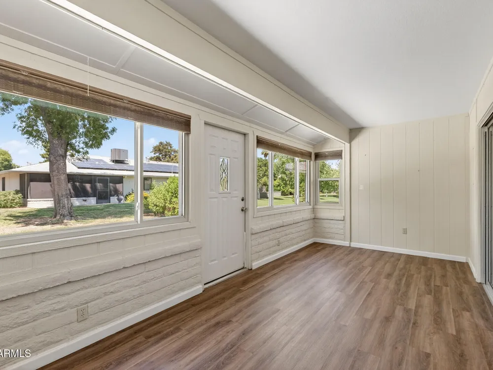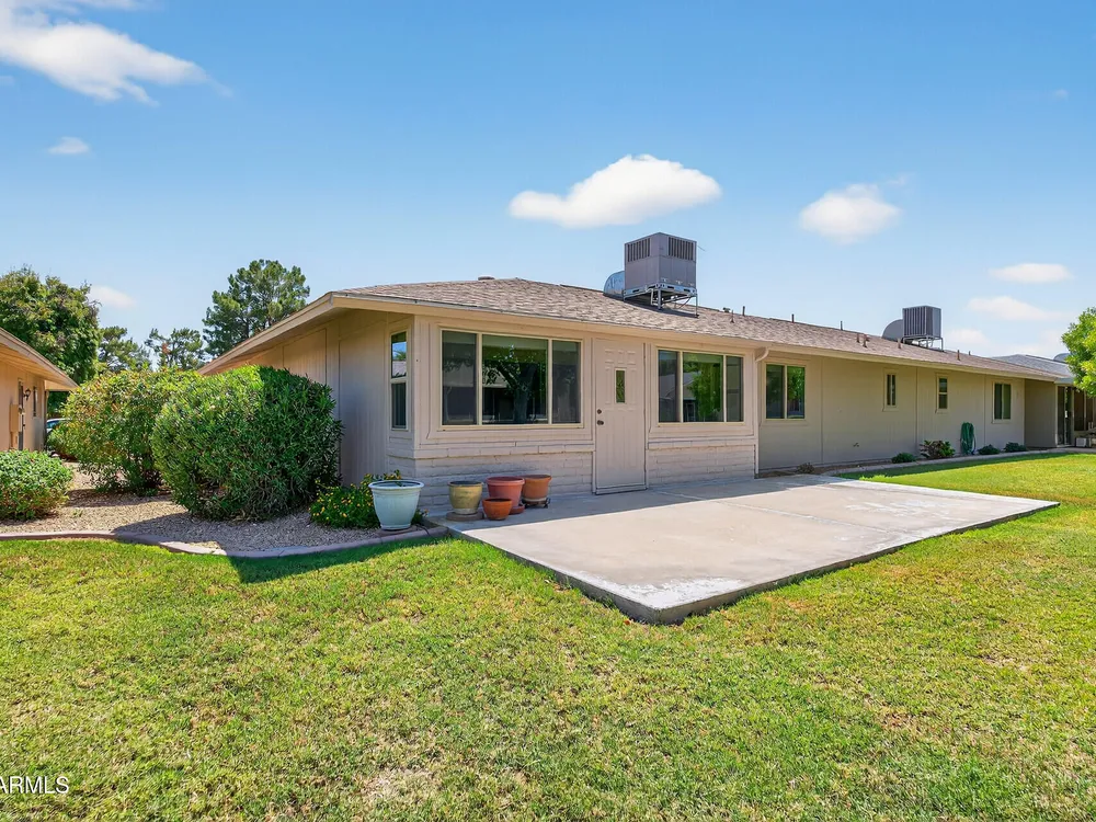 Almost like living on the golf course with Lush Grass front & backyards! This Gemini Twin is super clean & well maintained. New 50gal water heater in 2025. Luxury Vinyl plank installed in the kitchen and traffic areas in 2020. Roof replaced in 2017. New comfort height bathroom vanities with quartz counter tops, new sink, faucet features, lights and mirrors installed in both bathrooms. Windows, slider, garage door and garage door opener were all replaced in the past few years. Bali honeycombed shades throughout that open from the bottom and the top. Solar tubes provide natural light. Primary bedroom is spacious with an ensuite bath has a walk-in shower and HUGE walk-in closet. Fully enclosed patio/AZ room with dual paned windows. BIG utiltiy room with Whirlpool front load Washer & Dryer on pedestals AND plenty of room for an office space or hobby room. 2 car garage with additional storage cabinets. Charming front courtyard entrance with a partially covered patio. Low maintenance as the HOA covers the front and backyard landscape, trash collection, exterior paint, trash and water. Easy cart ride to all SCW golf courses, rec centers and shopping.