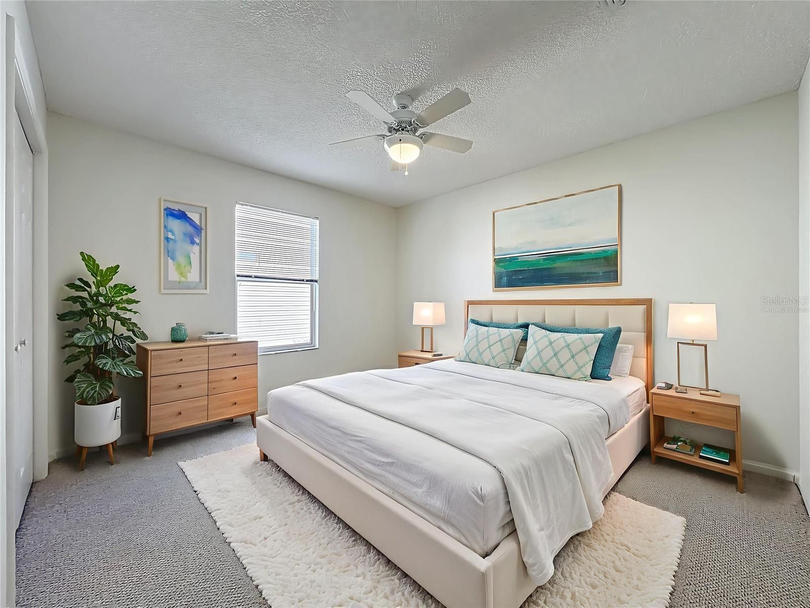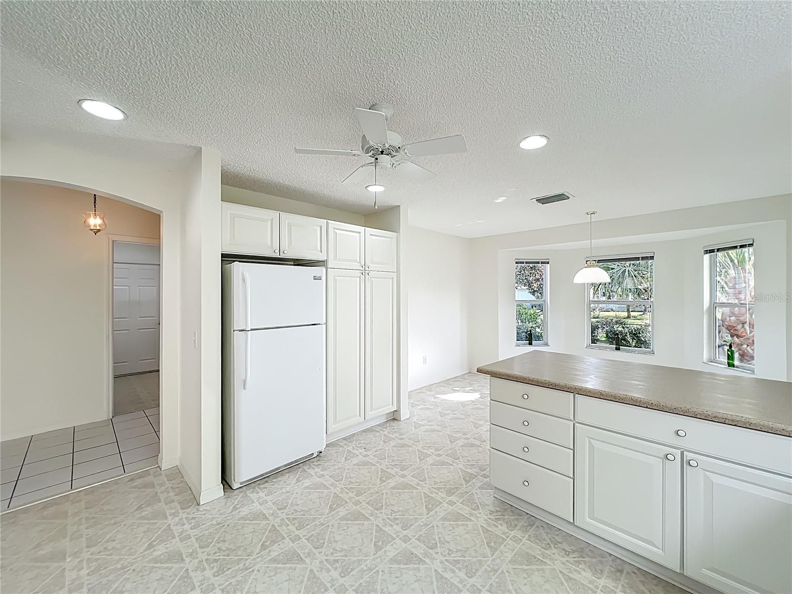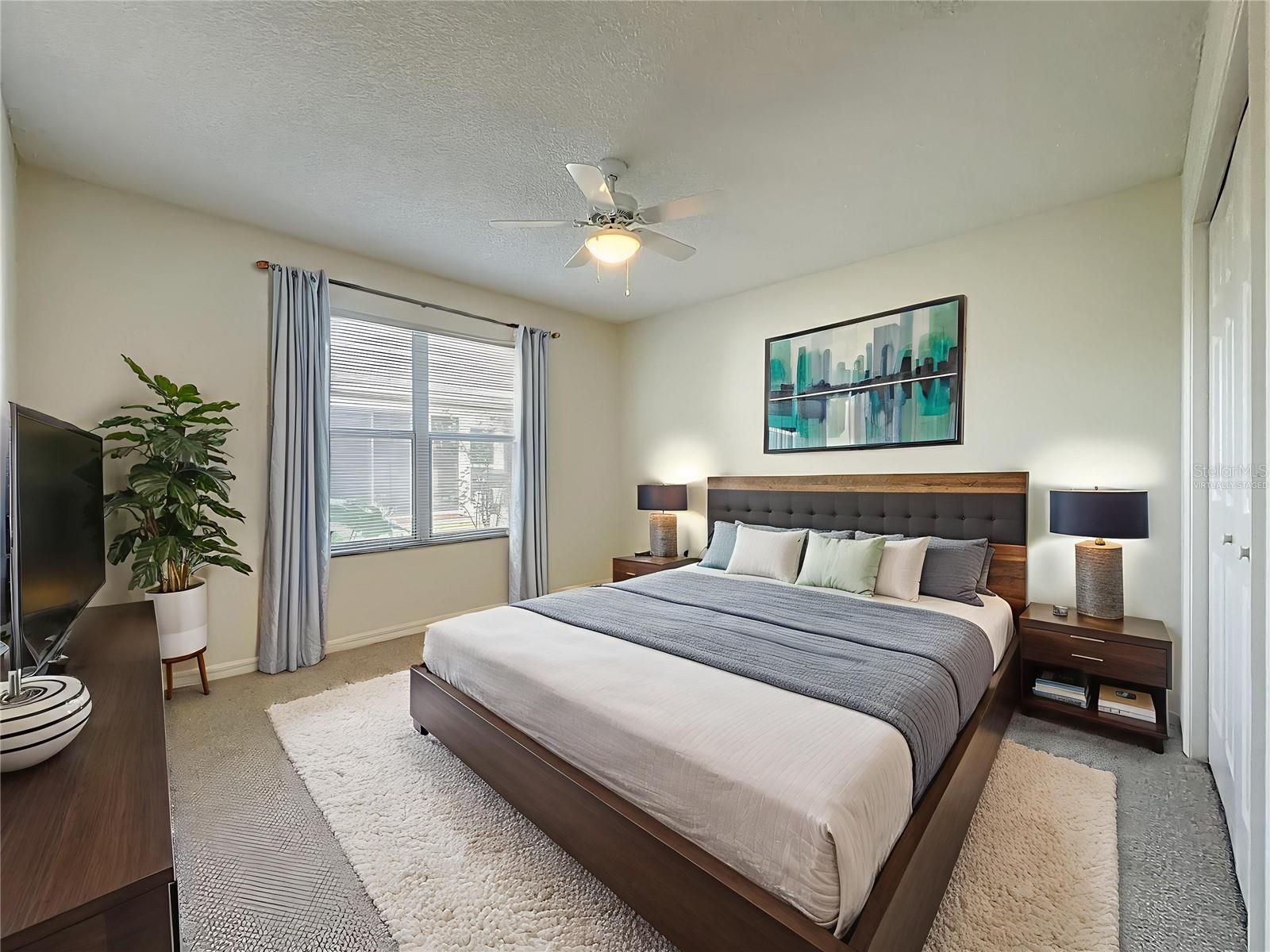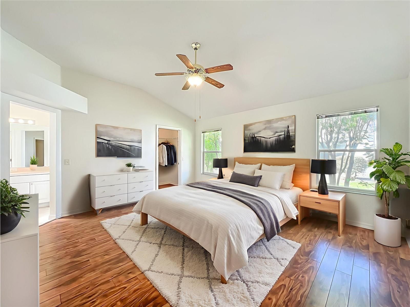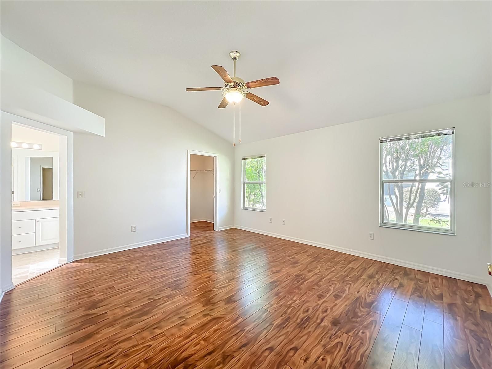 - Ceiling Fan(s), Eat-in Kitchen, High Ceilings, Open Floorplan, Split Bedrooms, Walk-In Closet(s), Window Treatments