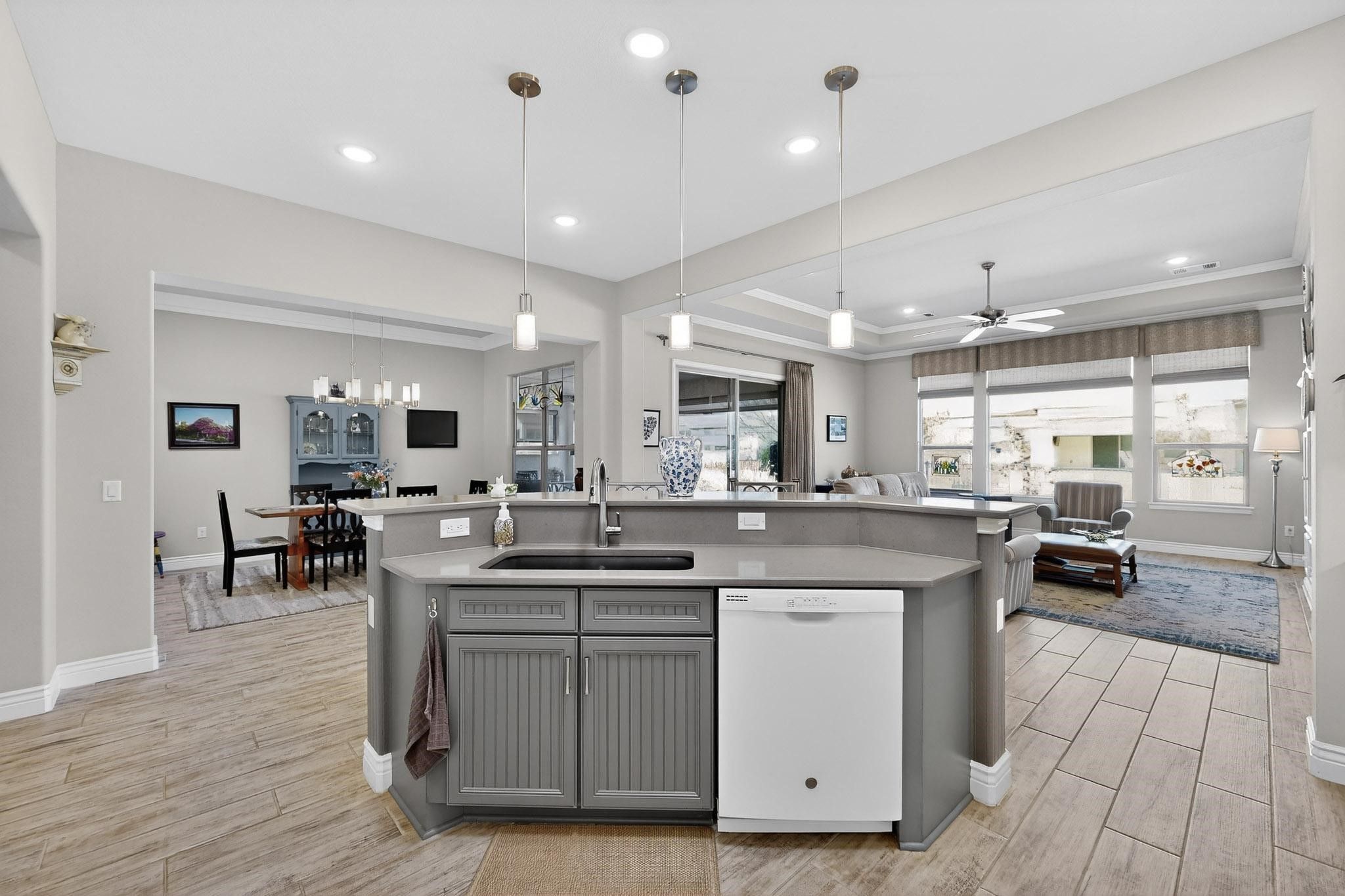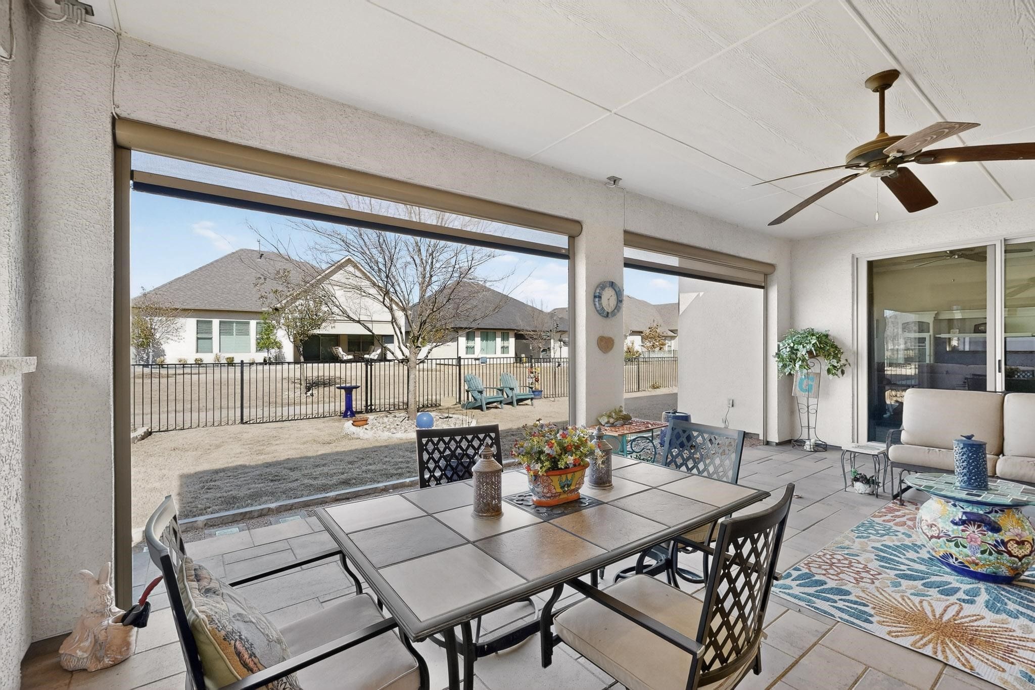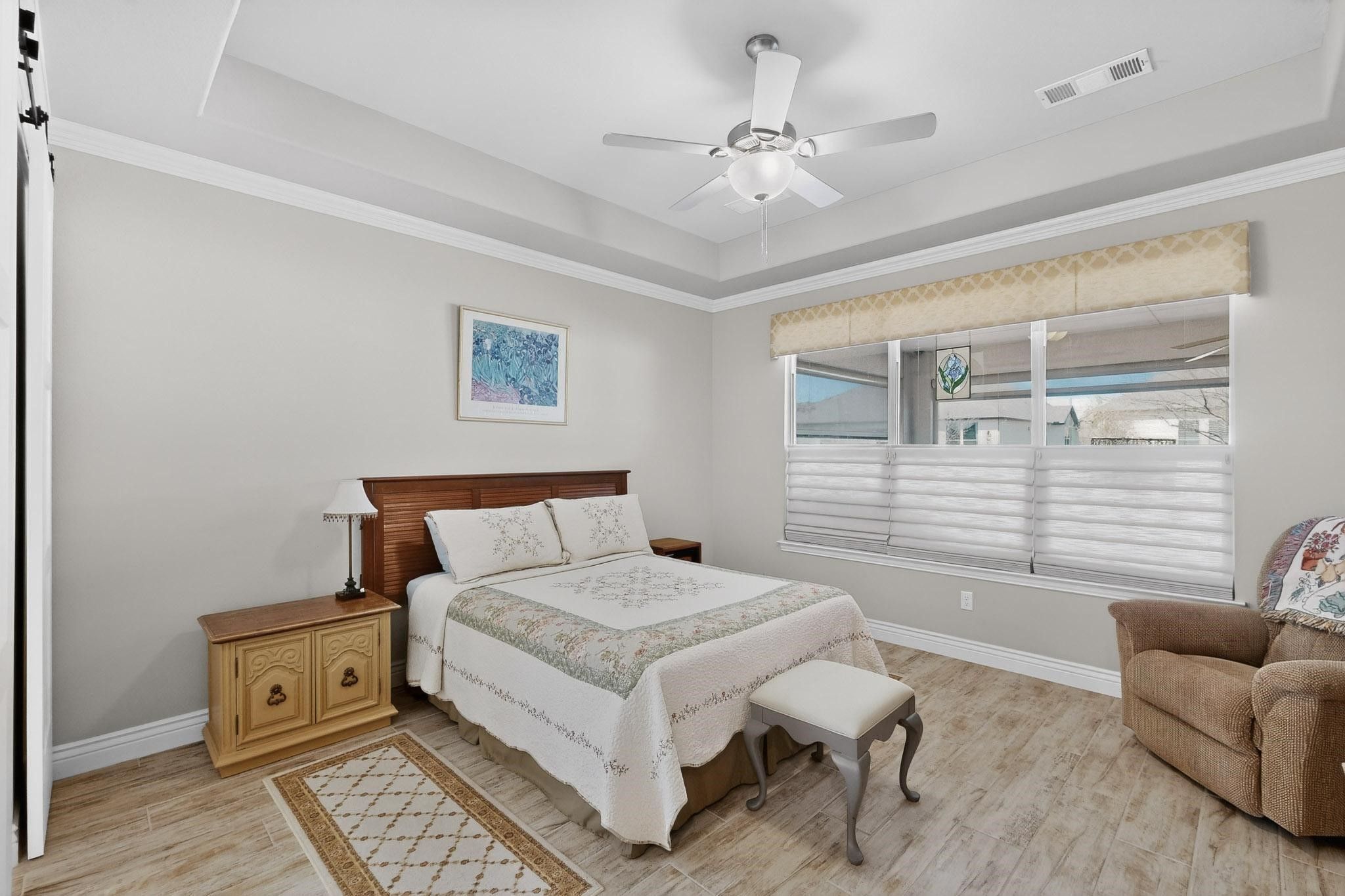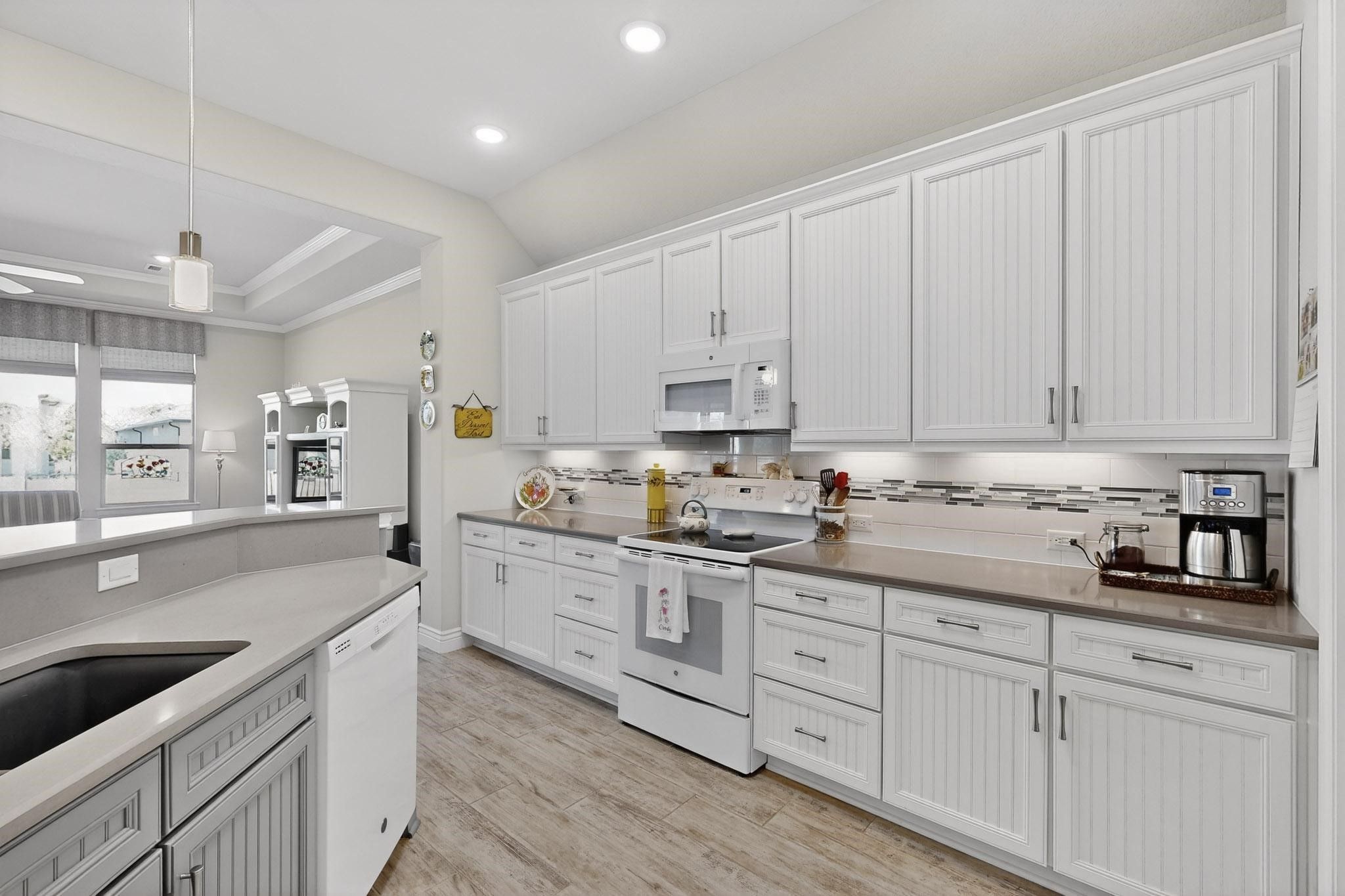 Welcome to this beautiful Fresco model home with a golf cart garage. Stone and stucco exterior. Stone landscape borders front and back. Fenced yard, extended patio, remote shades, a fan, privacy wall and a fountain. Upgraded entry door. Bright and neutral interior. No carpet. Wood-look tile throughout. Living room with a tray ceiling. The kitchen has beadboard-style wood cabinets, quartz counters, a solar tube light, an island with pendant lighting, a granite sink, roll-out shelves, a pantry, tiled backsplash with a deco band. Dining room with crown molding and a solar tube light. The primary bedroom has crown molding, a tray ceiling, and a fan. Barn doors for bathroom privacy, spacious granite countertops. Tiled shower with seat and deco band. Bedroom two has plantation shutters, a fan, double closets, and a private bath. The office has a closet so it could be used as a bedroom, and it features French doors. The laundry room has storage cabinets. Bonus: washer, dryer, and kitchen fridge stay with the property.