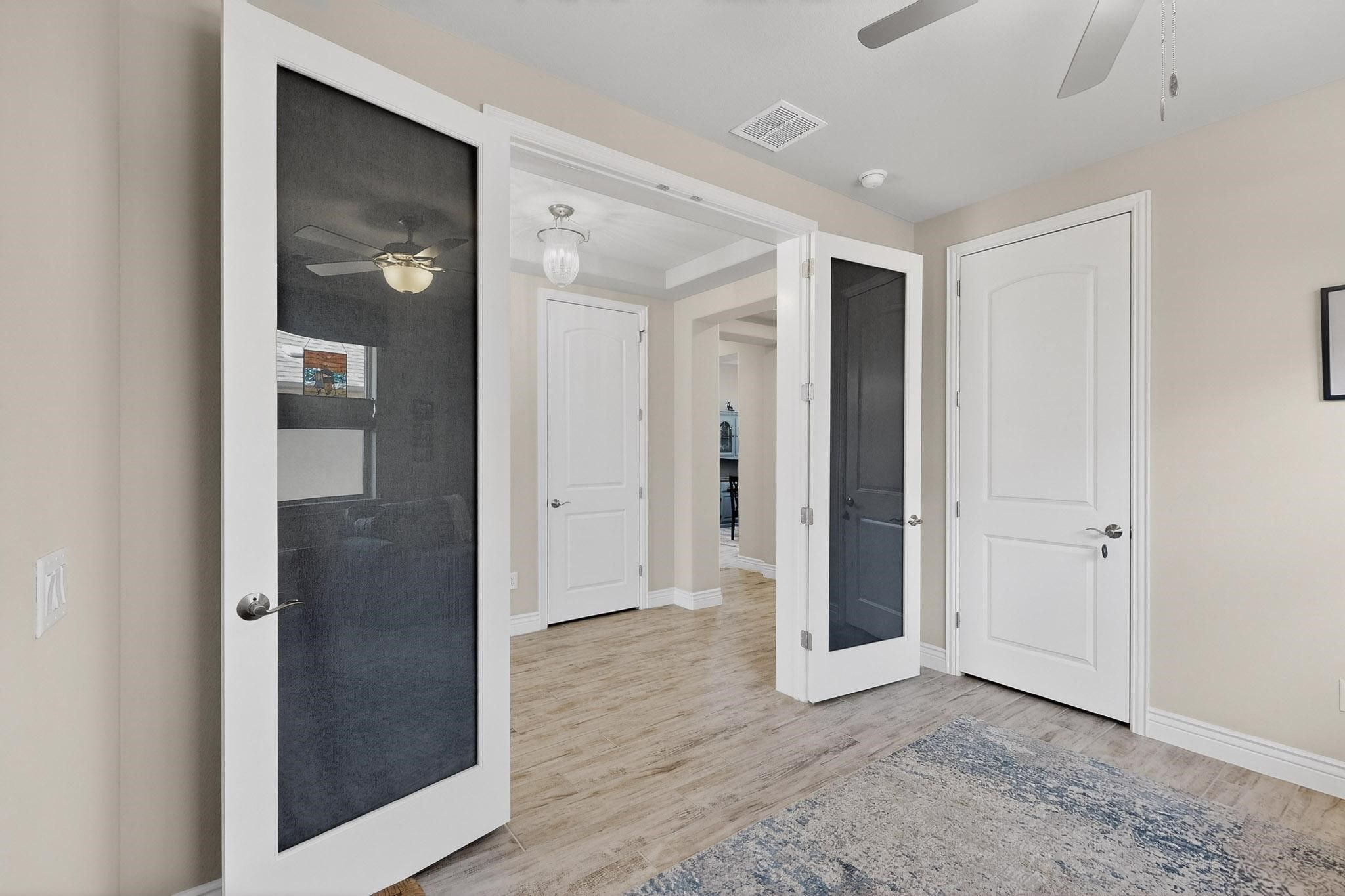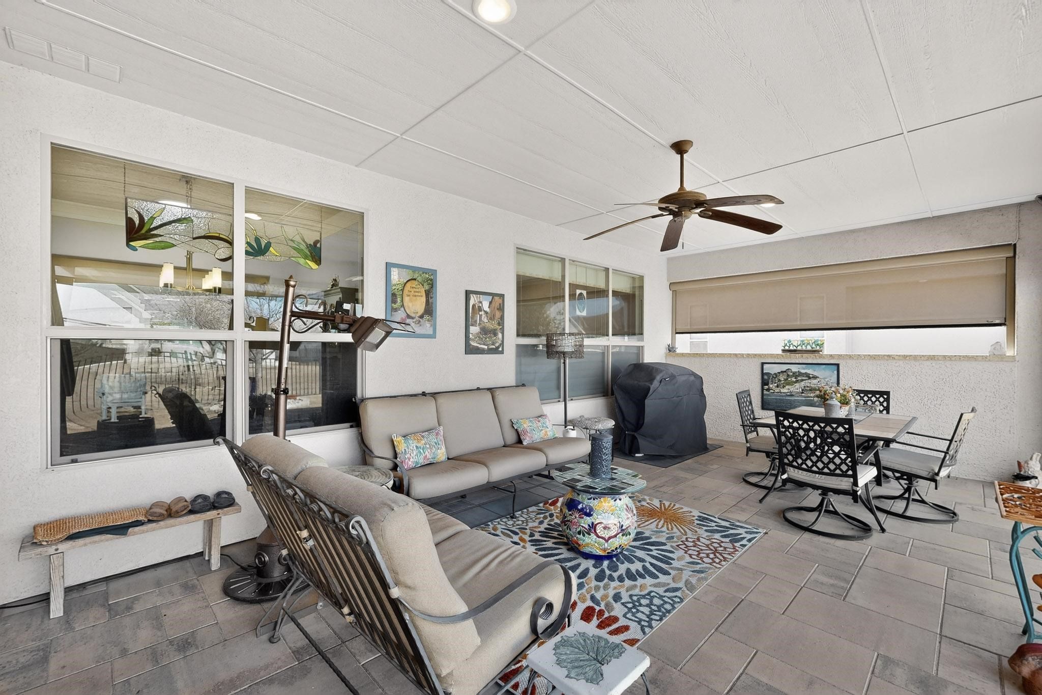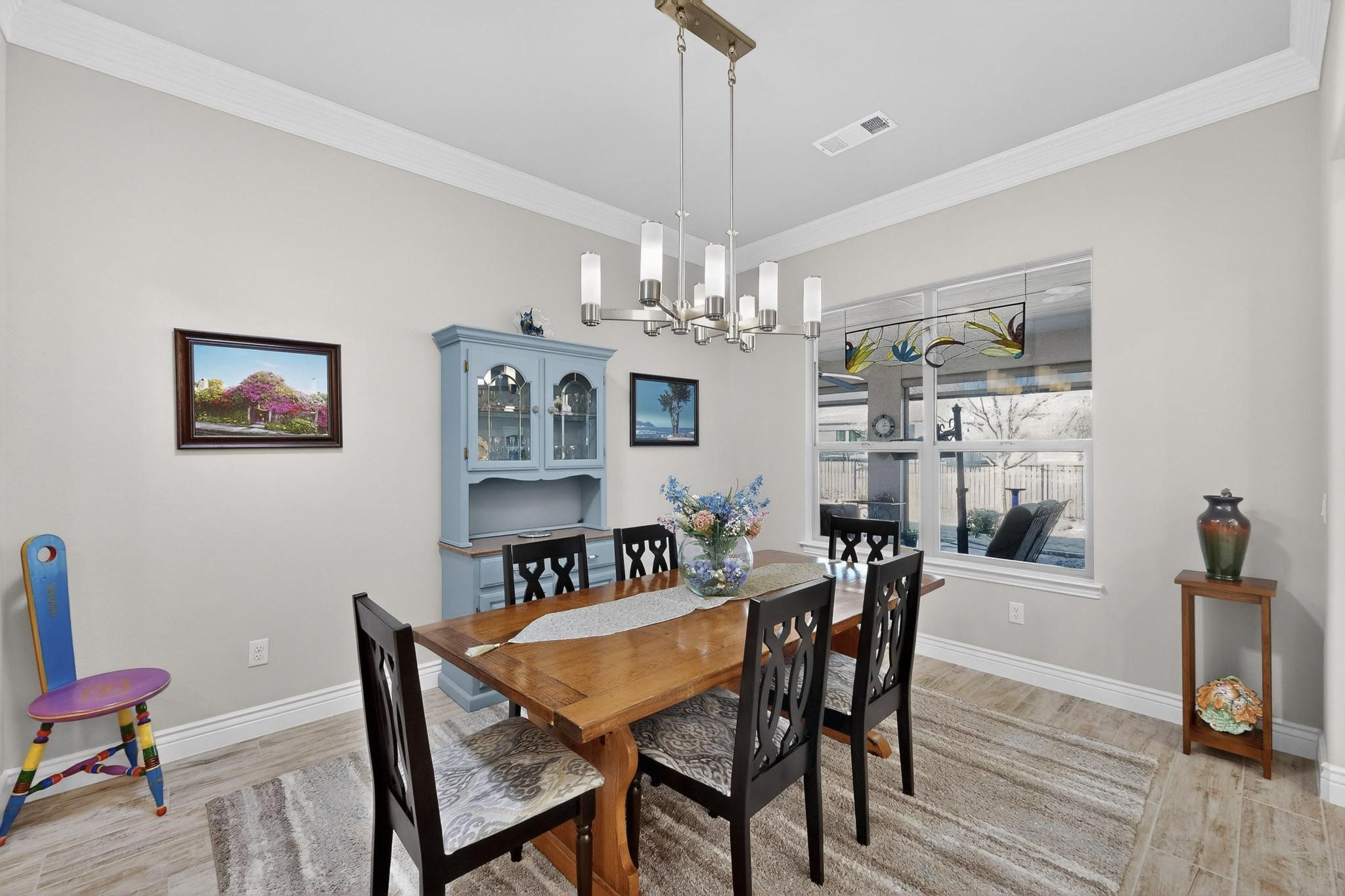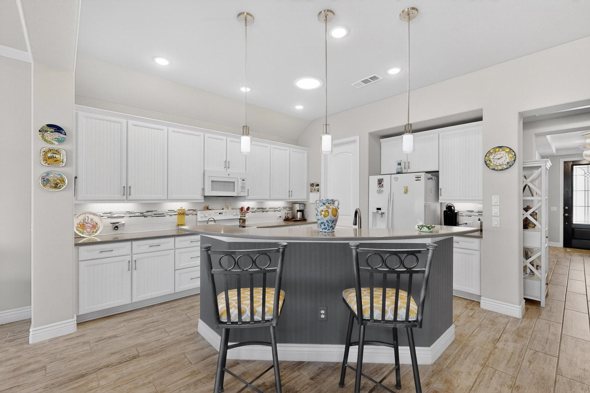 Welcome to this beautiful Fresco model home with a golf cart garage. Stone and stucco exterior. Stone landscape borders front and back. Fenced yard, extended patio, remote shades, a fan, privacy wall and a fountain. Upgraded entry door. Bright and neutral interior. No carpet. Wood-look tile throughout. Living room with a tray ceiling. The kitchen has beadboard-style wood cabinets, quartz counters, a solar tube light, an island with pendant lighting, a granite sink, roll-out shelves, a pantry, tiled backsplash with a deco band. Dining room with crown molding and a solar tube light. The primary bedroom has crown molding, a tray ceiling, and a fan. Barn doors for bathroom privacy, spacious granite countertops. Tiled shower with seat and deco band. Bedroom two has plantation shutters, a fan, double closets, and a private bath. The office has a closet so it could be used as a bedroom, and it features French doors. The laundry room has storage cabinets. Bonus: washer, dryer, and kitchen fridge stay with the property.