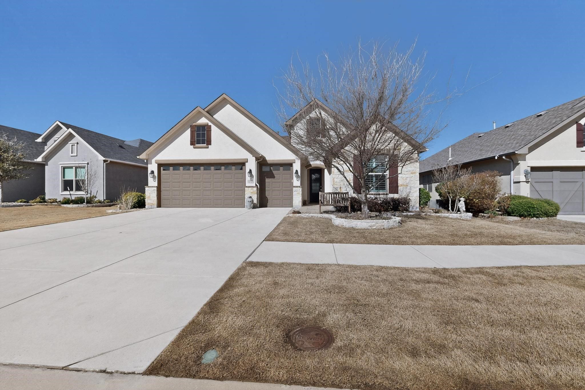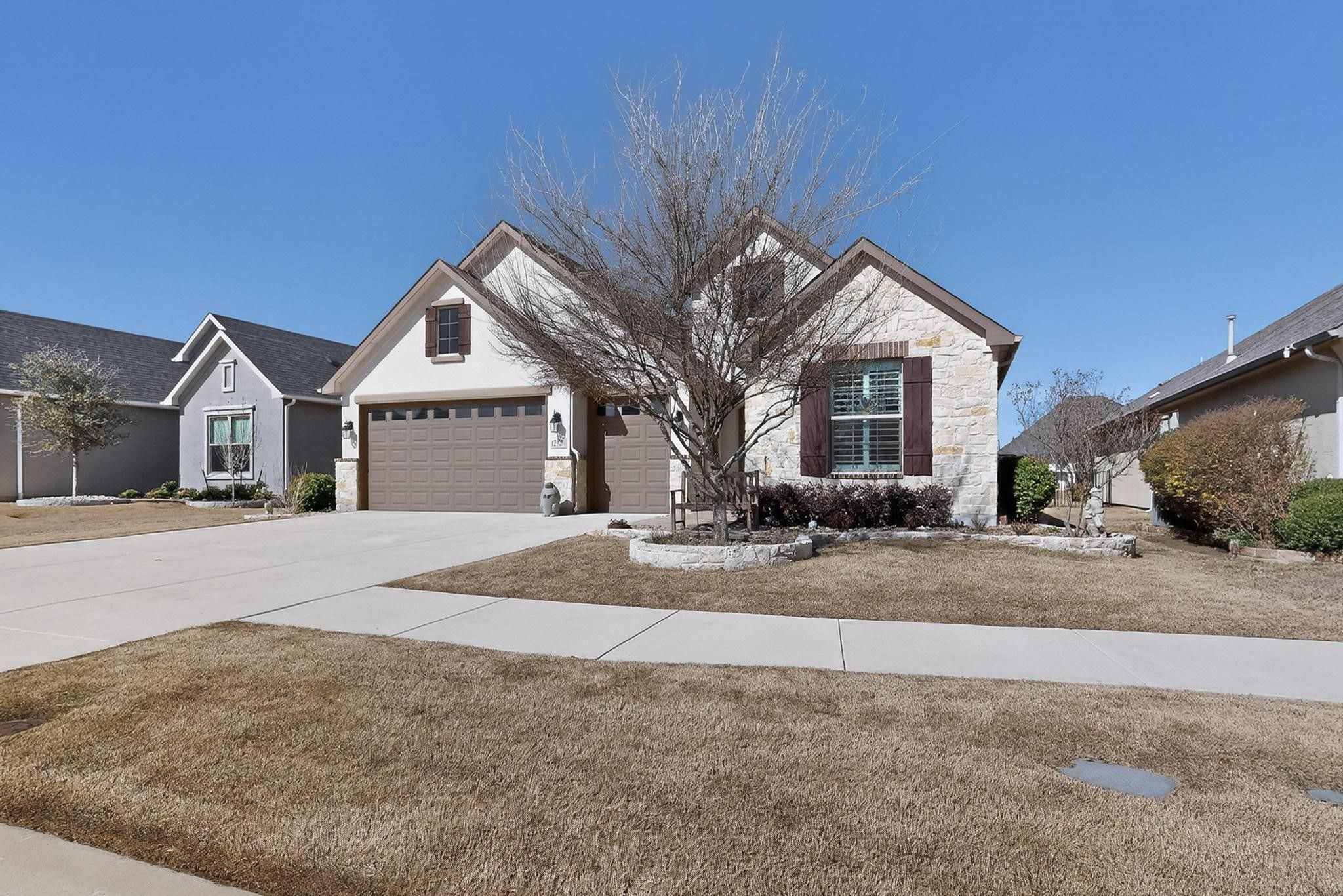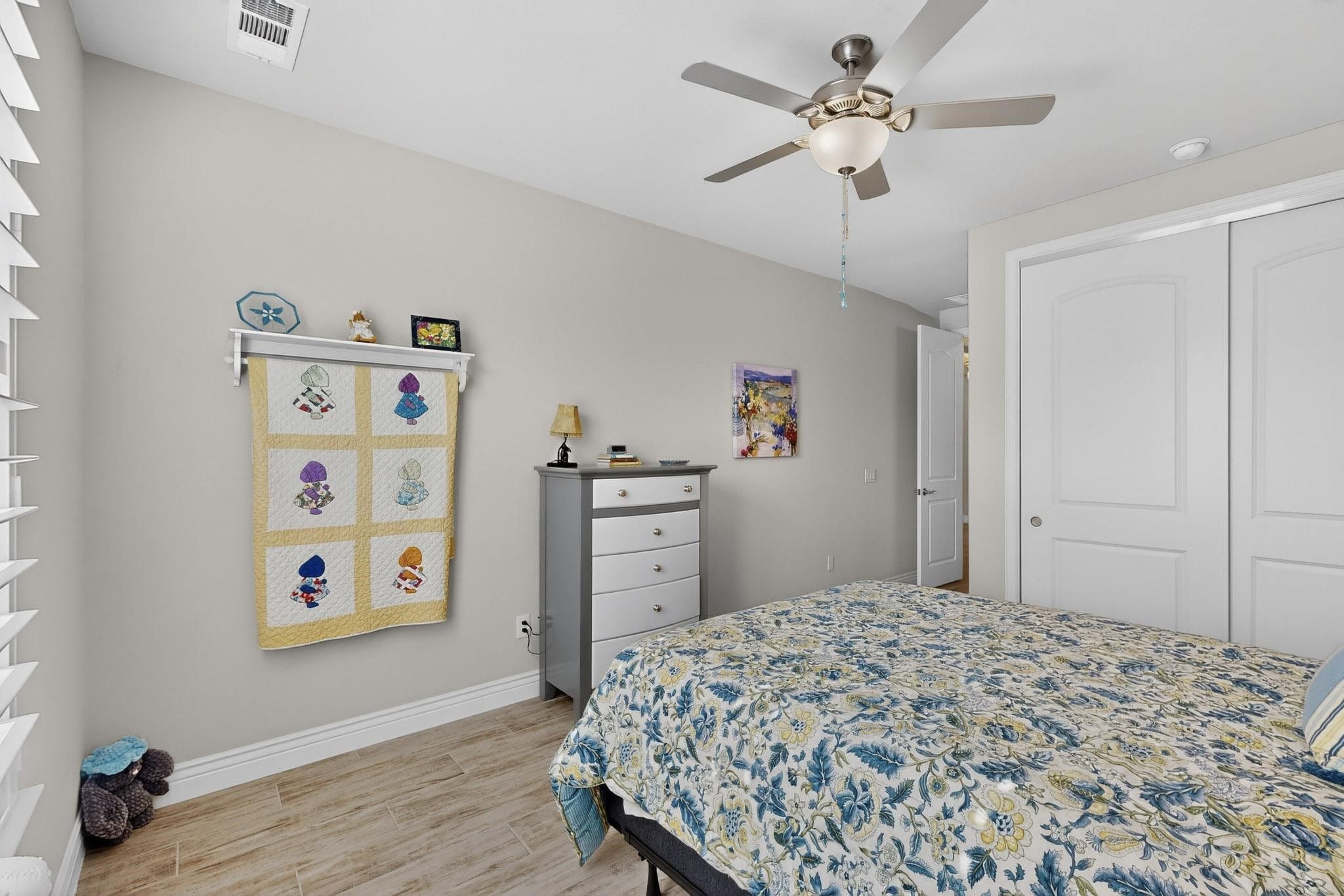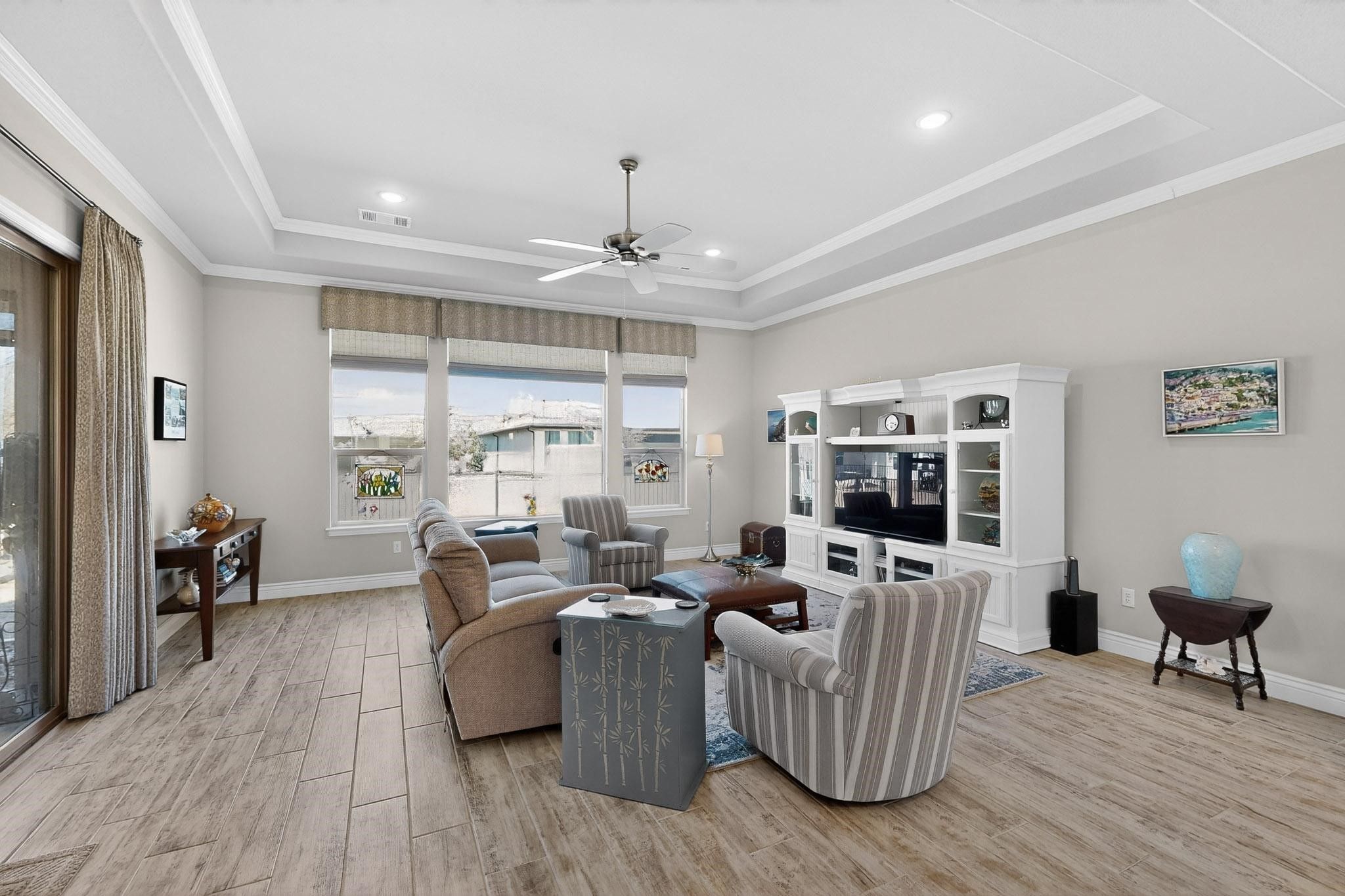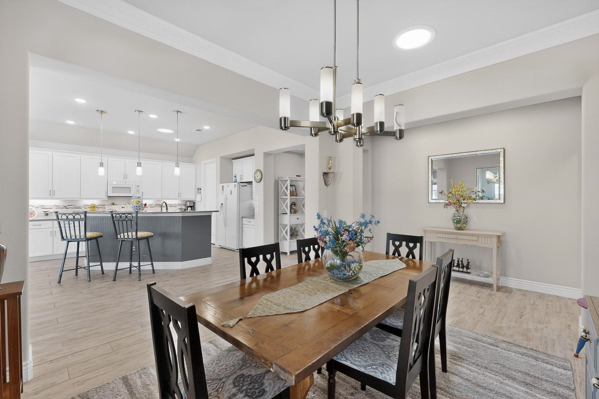 Welcome to this beautiful Fresco model home with a golf cart garage. Stone and stucco exterior. Stone landscape borders front and back. Fenced yard, extended patio, remote shades, a fan, privacy wall and a fountain. Upgraded entry door. Bright and neutral interior. No carpet. Wood-look tile throughout. Living room with a tray ceiling. The kitchen has beadboard-style wood cabinets, quartz counters, a solar tube light, an island with pendant lighting, a granite sink, roll-out shelves, a pantry, tiled backsplash with a deco band. Dining room with crown molding and a solar tube light. The primary bedroom has crown molding, a tray ceiling, and a fan. Barn doors for bathroom privacy, spacious granite countertops. Tiled shower with seat and deco band. Bedroom two has plantation shutters, a fan, double closets, and a private bath. The office has a closet so it could be used as a bedroom, and it features French doors. The laundry room has storage cabinets. Bonus: washer, dryer, and kitchen fridge stay with the property.