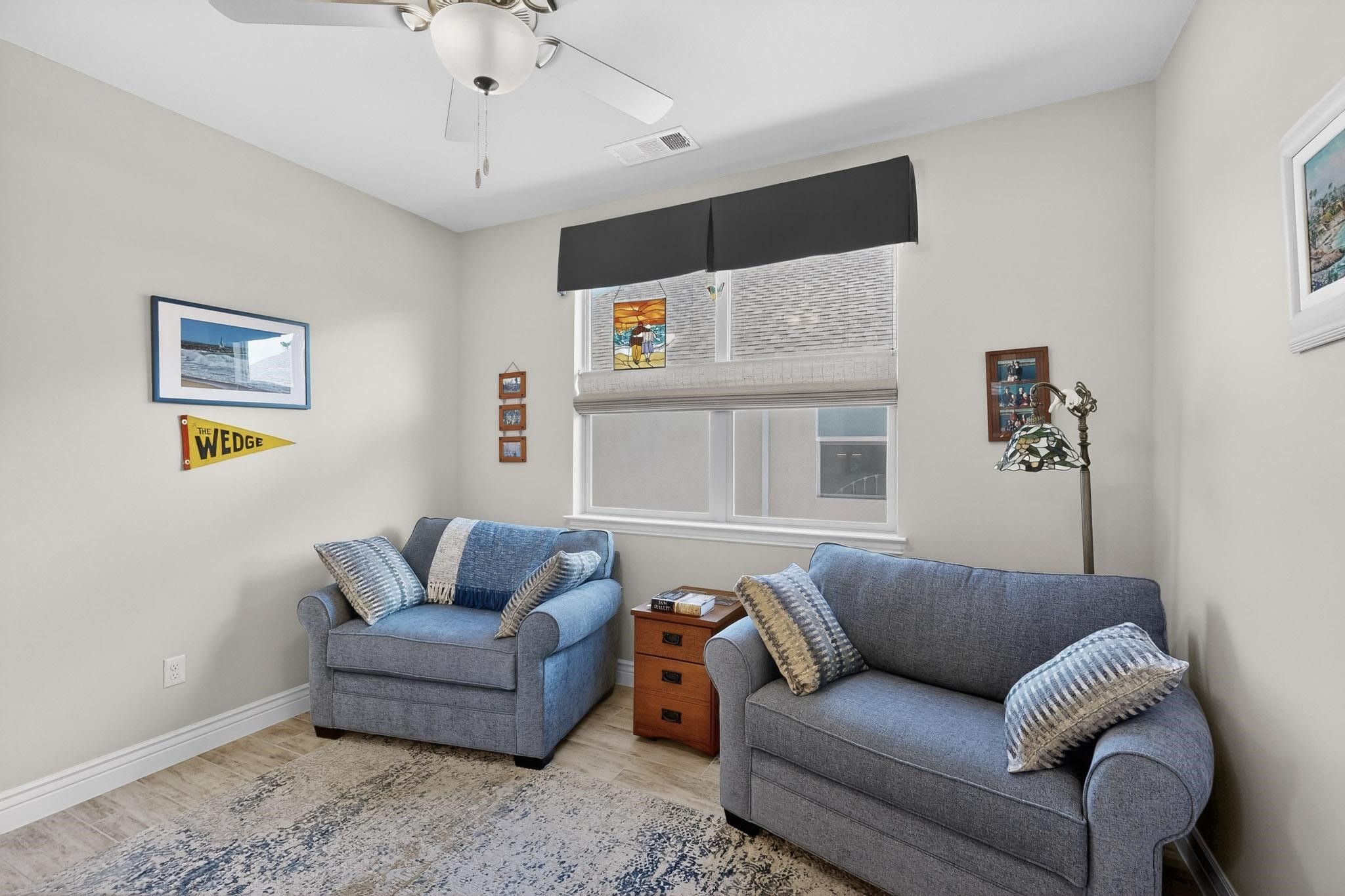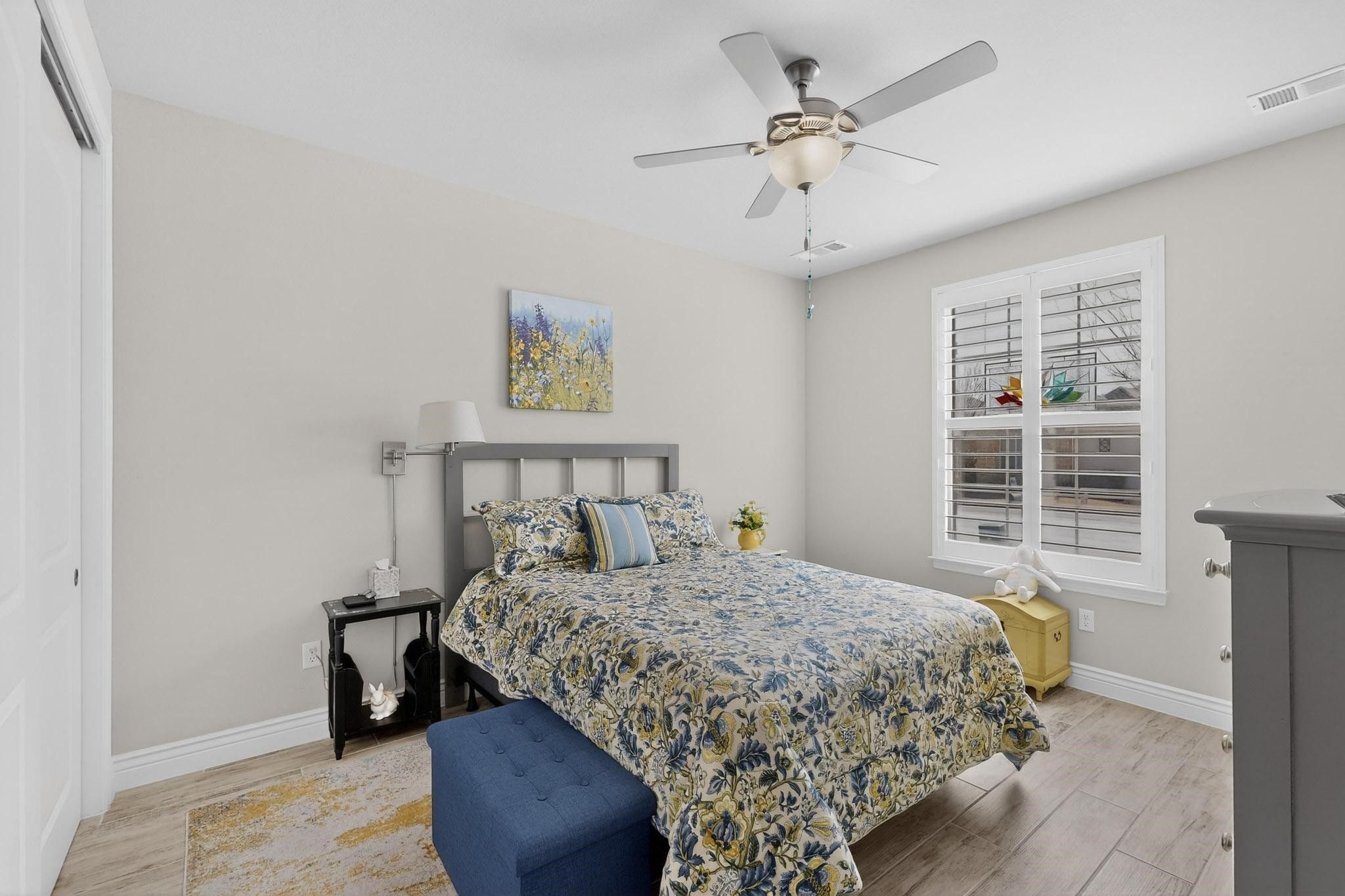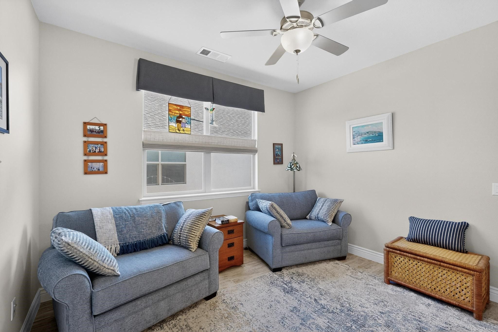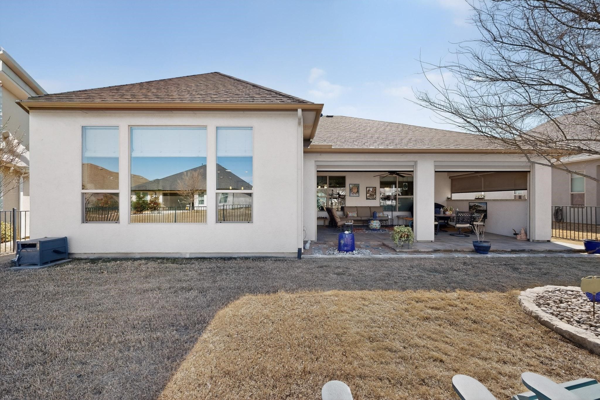 Welcome to this beautiful Fresco model home with a golf cart garage. Stone and stucco exterior. Stone landscape borders front and back. Fenced yard, extended patio, remote shades, a fan, privacy wall and a fountain. Upgraded entry door. Bright and neutral interior. No carpet. Wood-look tile throughout. Living room with a tray ceiling. The kitchen has beadboard-style wood cabinets, quartz counters, a solar tube light, an island with pendant lighting, a granite sink, roll-out shelves, a pantry, tiled backsplash with a deco band. Dining room with crown molding and a solar tube light. The primary bedroom has crown molding, a tray ceiling, and a fan. Barn doors for bathroom privacy, spacious granite countertops. Tiled shower with seat and deco band. Bedroom two has plantation shutters, a fan, double closets, and a private bath. The office has a closet so it could be used as a bedroom, and it features French doors. The laundry room has storage cabinets. Bonus: washer, dryer, and kitchen fridge stay with the property.