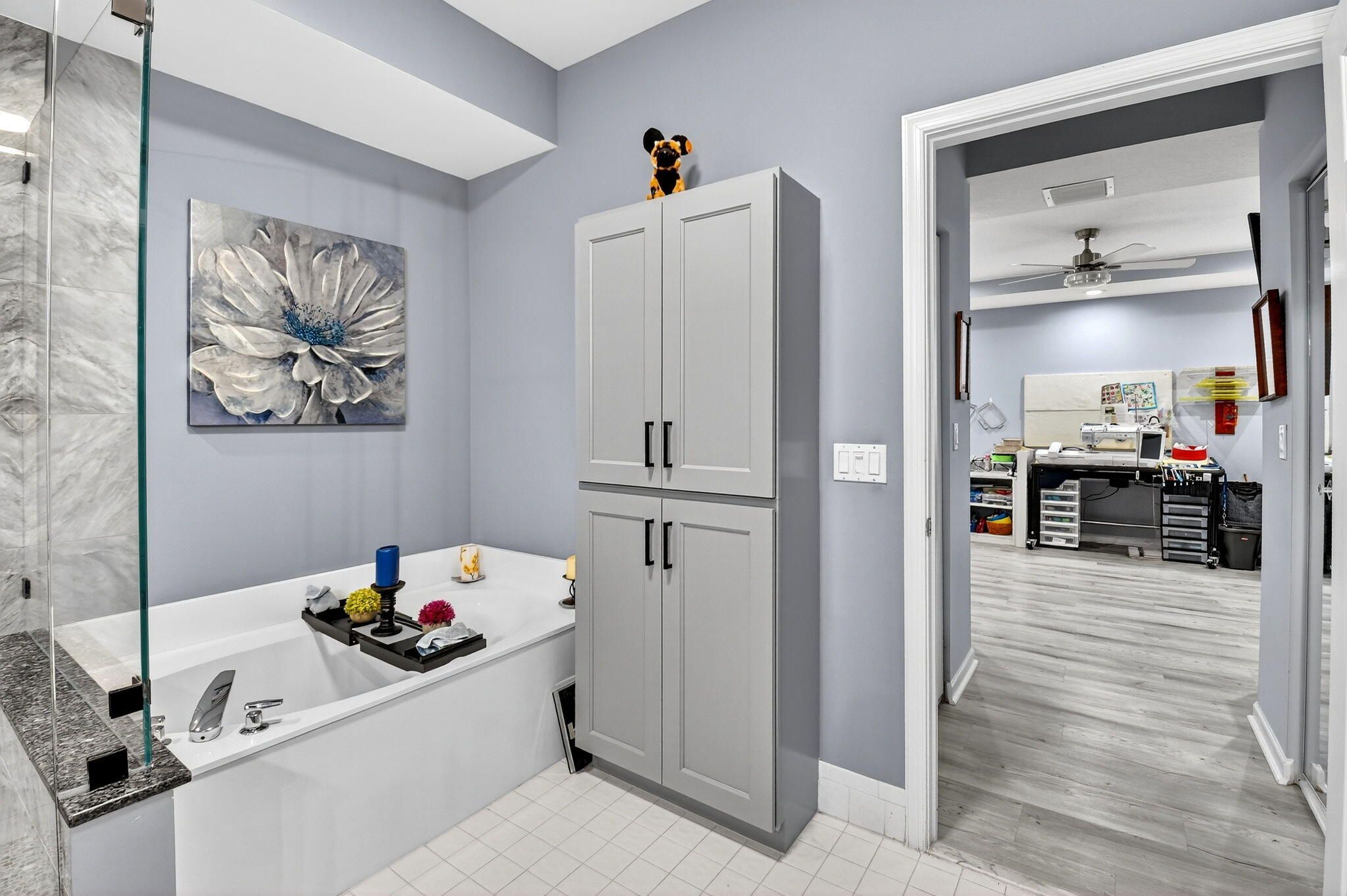 - Elevator, Fire Sprinkler, Pantry, Garden Tub/Roman Tub, Split Bedrooms, High Ceilings, Walk-In Closet(s), Home Office, Storage, Eat-in Kitchen, Separate/Formal Dining Room, Blinds, Sliding Window(s), Tub Shower, Separate Shower, Hot Tub/Spa, Storm Shutters