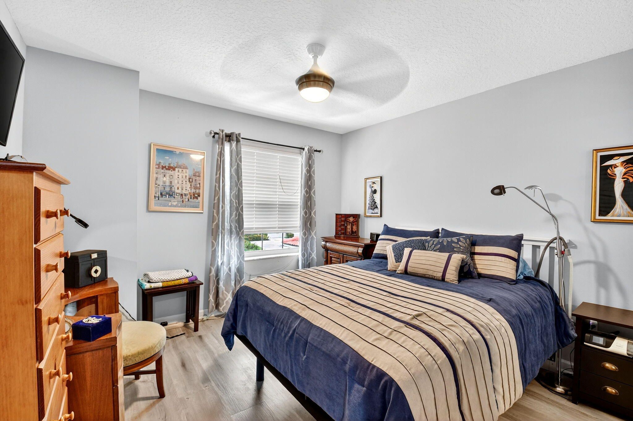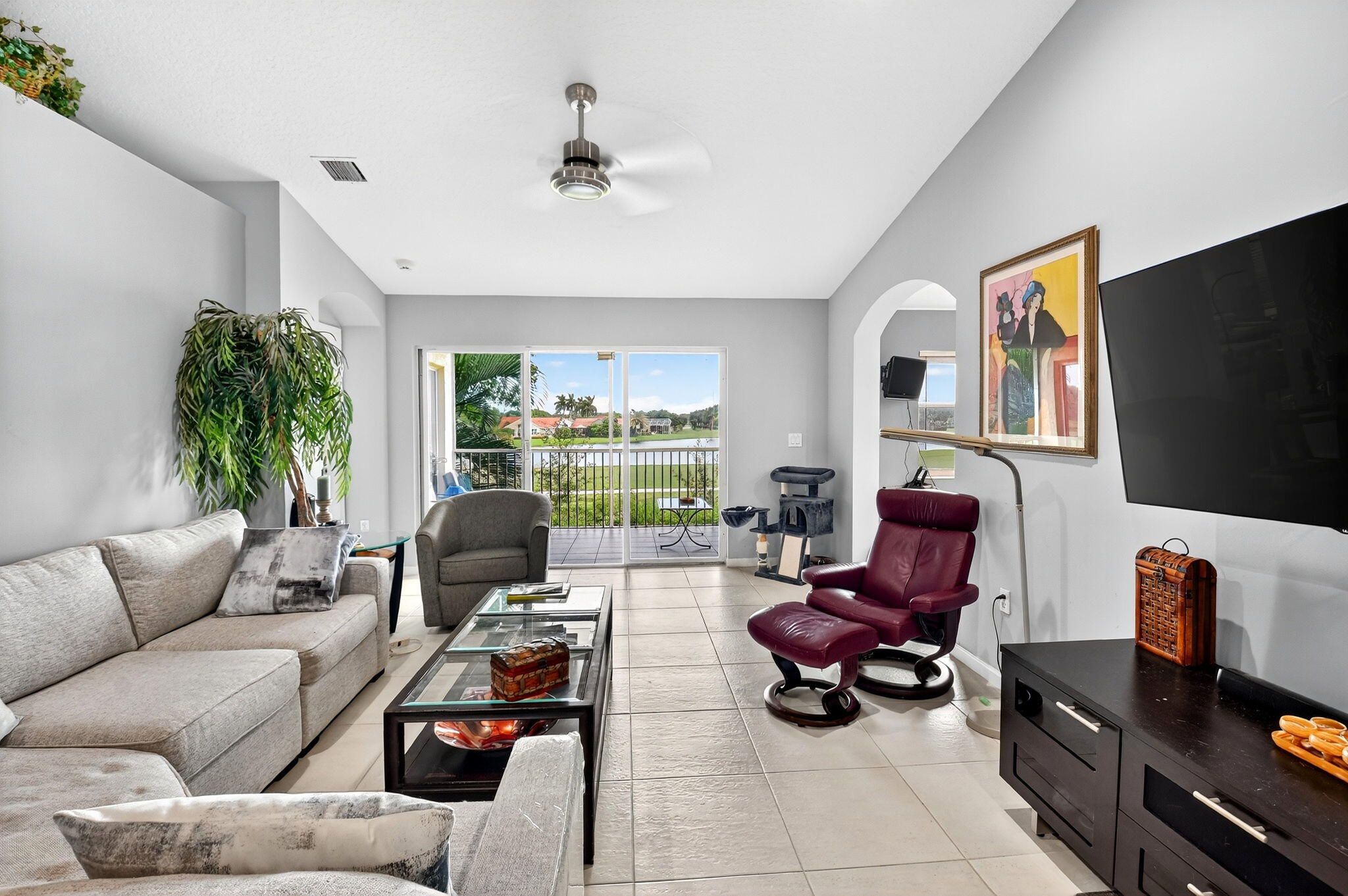 RARELY AVAILABLE 2nd floor coach home with interior elevator, extensively renovated featuring vaulted ceiling, screened-in patio overlooking a gorgeous wide lake (outdoor living at its finest.) modern kitchen with quartz counters, custom white cabinets & SS Appliances, 2 beautiful, renovated bathrooms. Luxury laminate in master & 2nd bedroom. New roof was installed in 2024. NO assessments! Condo fees include water. alarm, internet, TV, all amenities at newly renovated Club with tennis, pickleball, billiards, bocce, theatre, cafe, 35 social clubs, gym, water aerobics & much more, No country club fees. Move right in and enjoy. Can be rented immediately.