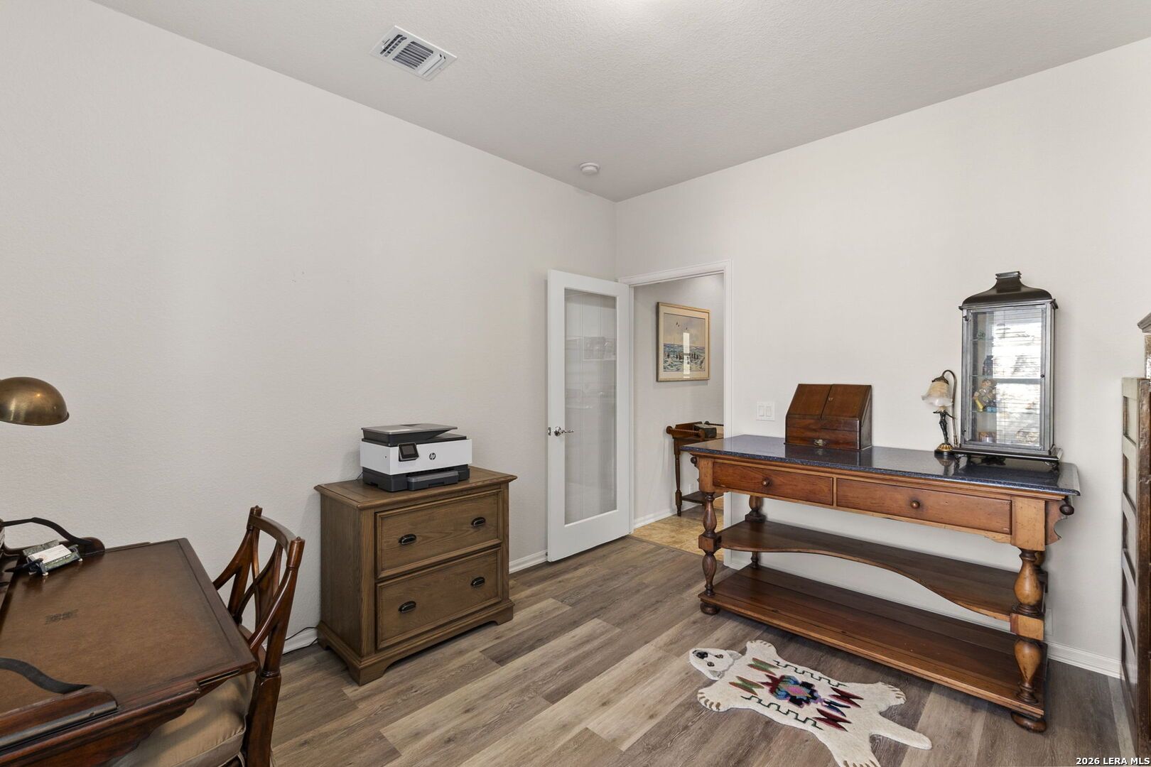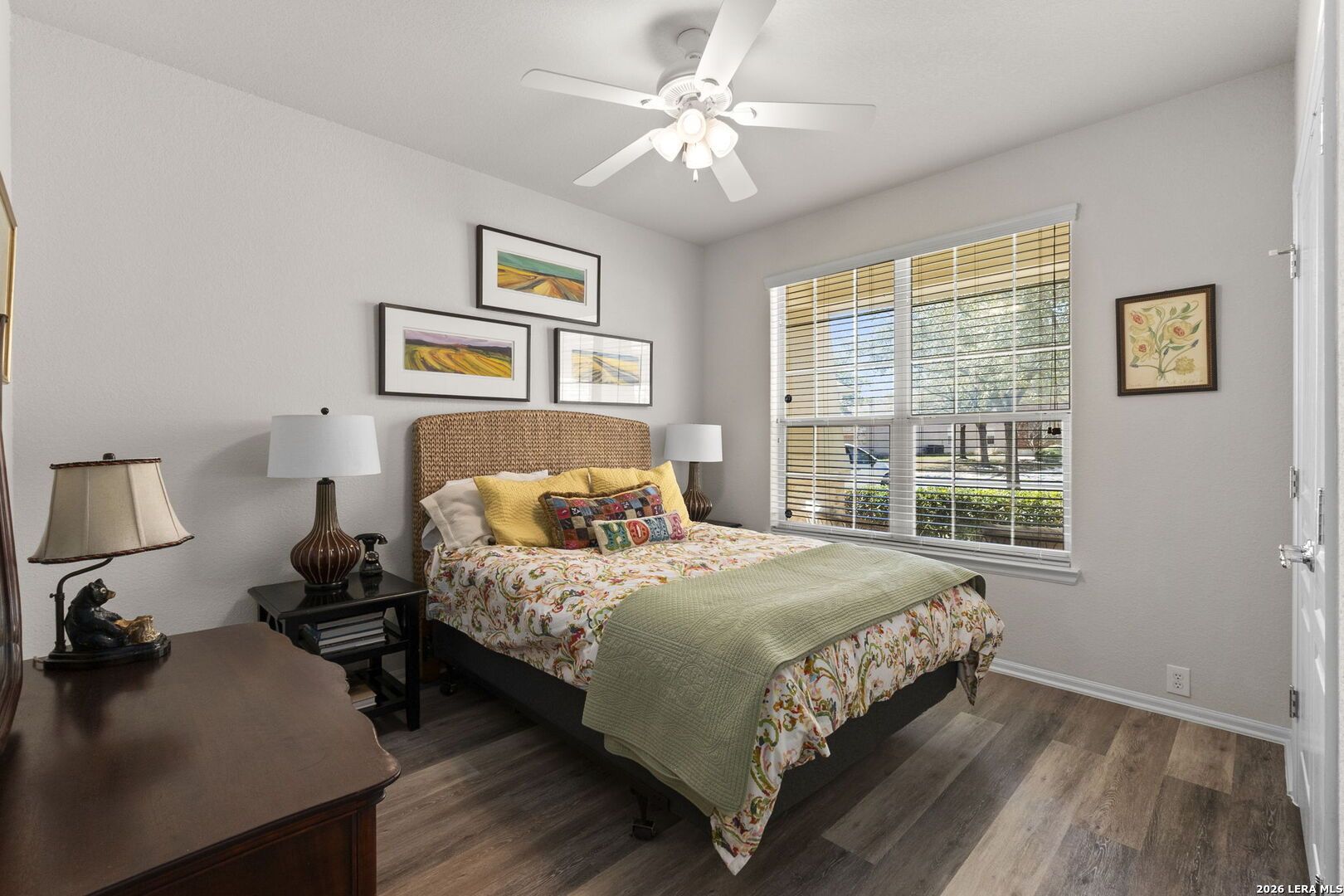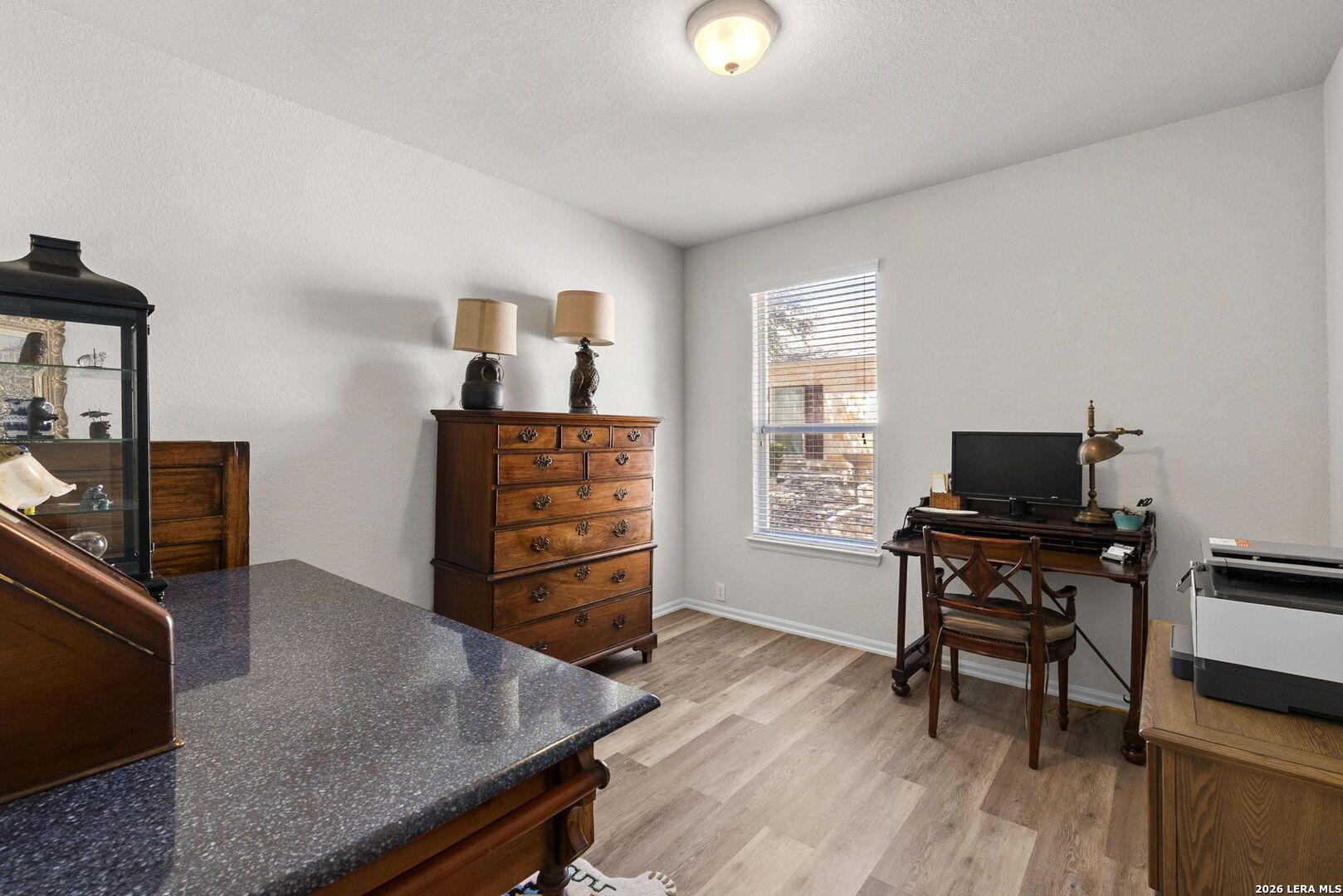 This exquisitely cared-for home offers tray ceilings, 2 bedrooms, 2 bathrooms, and a versatile office/flex room, all backing to a peaceful greenbelt-one of the most desirable features for homeowners. Enjoy easy access with no stairs at either the front door or garage entrance. The spacious kitchen is designed to keep you connected with family and friends while cooking. It features a gas stove, 42" cabinets with crown molding, ample storage, a tiled backsplash, and a convenient breakfast bar perfect for casual dining. The generous living area showcases a stunning rock gas fireplace and large windows that fill the space with natural light while offering relaxing greenbelt views. Laminate flooring was installed on 10/18/23, adding both style and durability. The primary suite is generously sized with a large bay window and includes a well-appointed bath with double vanity and a large walk-in closet. The home's thoughtful layout provides comfort and functionality throughout. Step outside to a backyard that backs to a greenbelt with a walking and jogging trail just beyond the trees and shrubs-perfect for entertaining, gardening, or simply relaxing. The oversized two-car garage with garage door opener adds extra convenience. Located in the elegant 55+ Hill Country Retreat community, residents enjoy resort-style amenities including billiards, club rooms, dancing, indoor and outdoor pools (with handicap-accessible entry), fitness center, tennis and pickleball courts, walking trails, and numerous social clubs-creating endless opportunities to stay active and build lifelong friendships.