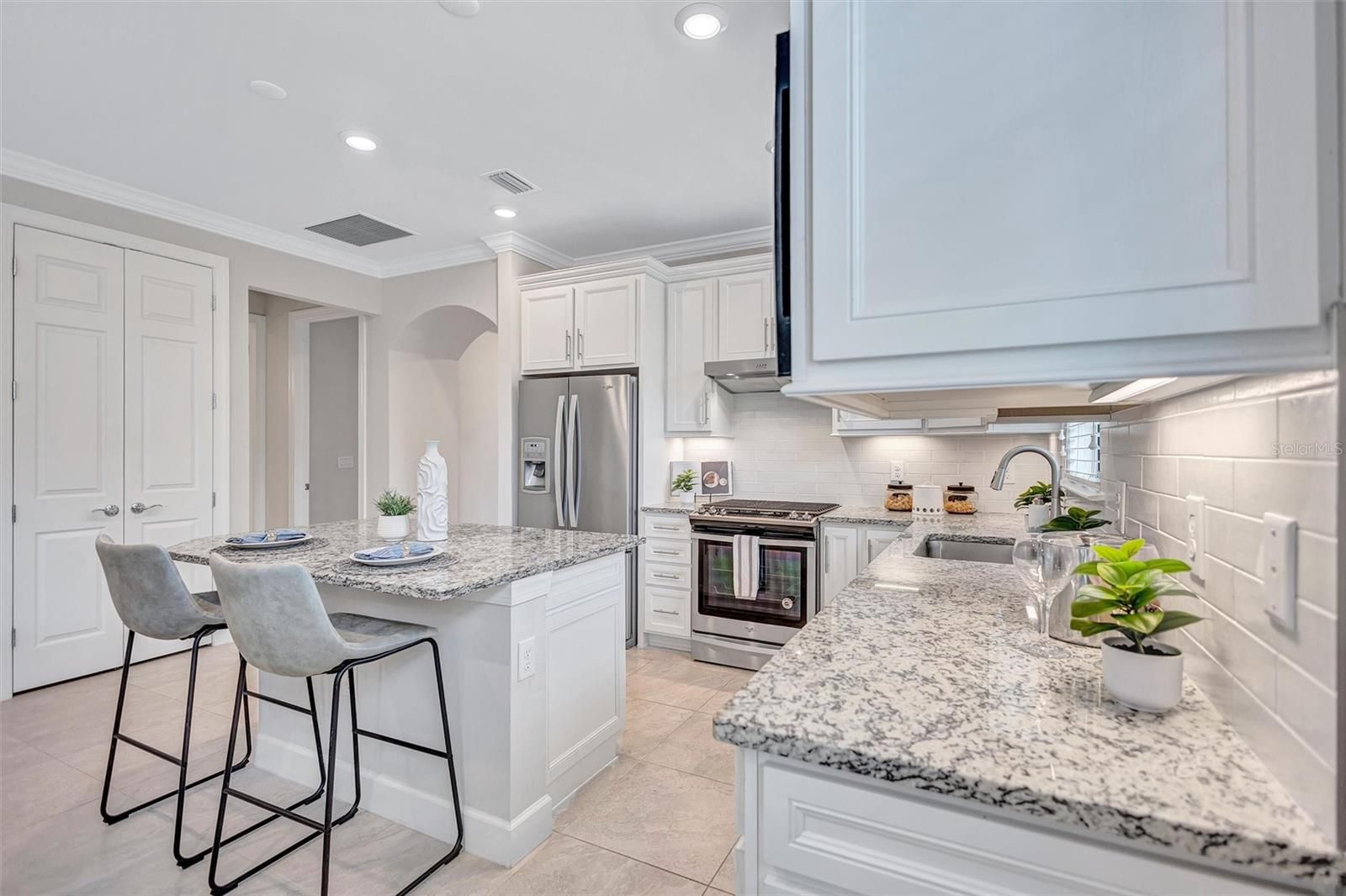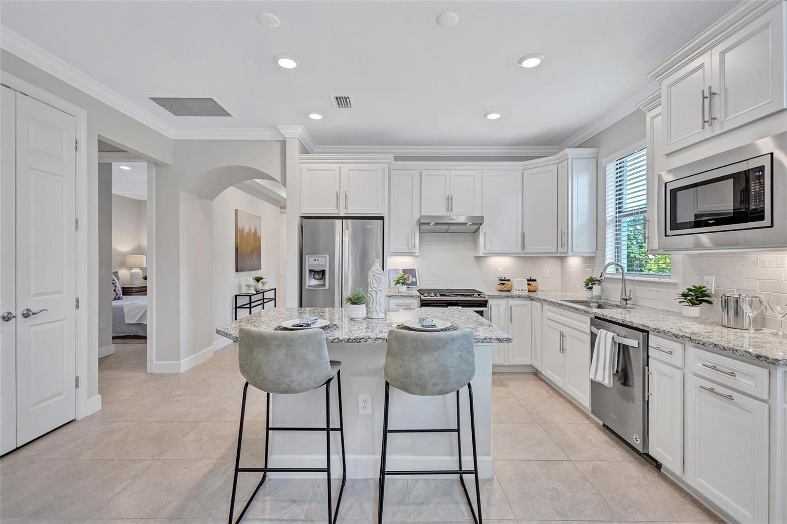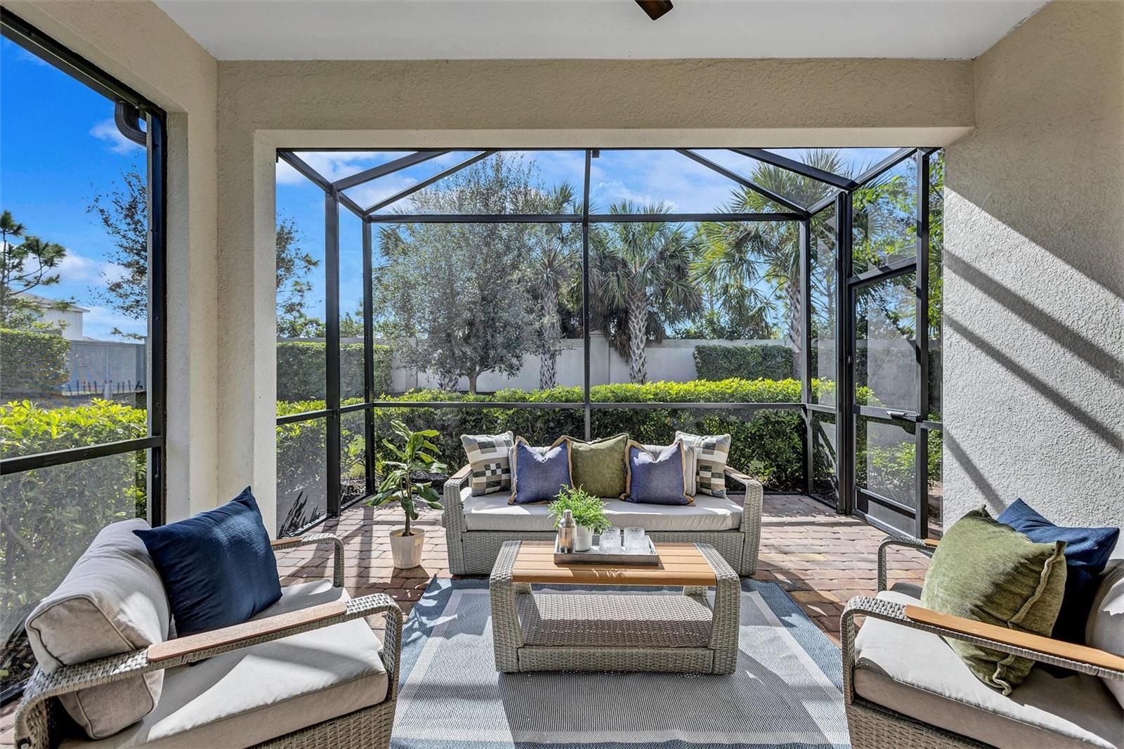 Finally – the one you have been waiting for! This stunning 2021 Cressida model offers Impact Windows & Doors, extensive upgrades inside & out, and an exceptional end-of-the-cul-de-sac location that provides rare privacy. Designed to live like a single-family home, it features a 24-ft Courtyard entry & an impressive 29-ft extended covered lanai overlooking a tranquil, natural Florida backdrop. This open, light-filled floor plan features 9-ft ceilings, 8-ft interior doors, & abundant windows only an end-unit can provide. Easy-care porcelain tile & crown molding throughout complement the coastal-inspired, light-toned finishes. At the heart of the home, the Chef’s kitchen delights with a natural gas 5-burner range, 42-inch solid-wood cabinetry with soft-close drawers & pull outs, granite countertops, upgraded stainless appliances, under-cabinet lighting, a large pantry, and an island with extra storage & breakfast bar seating – perfect for everyday living or entertaining. The gracious living area flows seamlessly through stacking sliders to the extended, pavered, covered and screened lanai for your private outdoor retreat. The luxurious primary Ensuite is a true oasis, offering comfort-height granite counters, double undermount sinks, upgraded fixtures, and enlarged walk-in shower, separate linen storage and oversized walk-in closet & a private water closet. A versatile flex room allows you to personalize the space to your lifestyle, while the separate laundry room and mud-room entry from the 2-car garage add thoughtful convenience. Located in a maintenance-free, gated community, you’ll enjoy Resort-Style Amenities including a Clubhouse, Barefoot Bar, heated Pool & Spa, fitness center, pickleball, tennis, bocce ball, fire pit, fishing pier & an on-site Property Manager. Furry family members are welcome too, with a 2-sided dog park for both large & small pups. All of this with easy access to Downtown Sarasota’s cultural attractions, charming Downtown Venice, world-famous beaches and the 20+ mile Legacy Trail. Don’t miss the opportunity to see this unique, move-in-ready home!