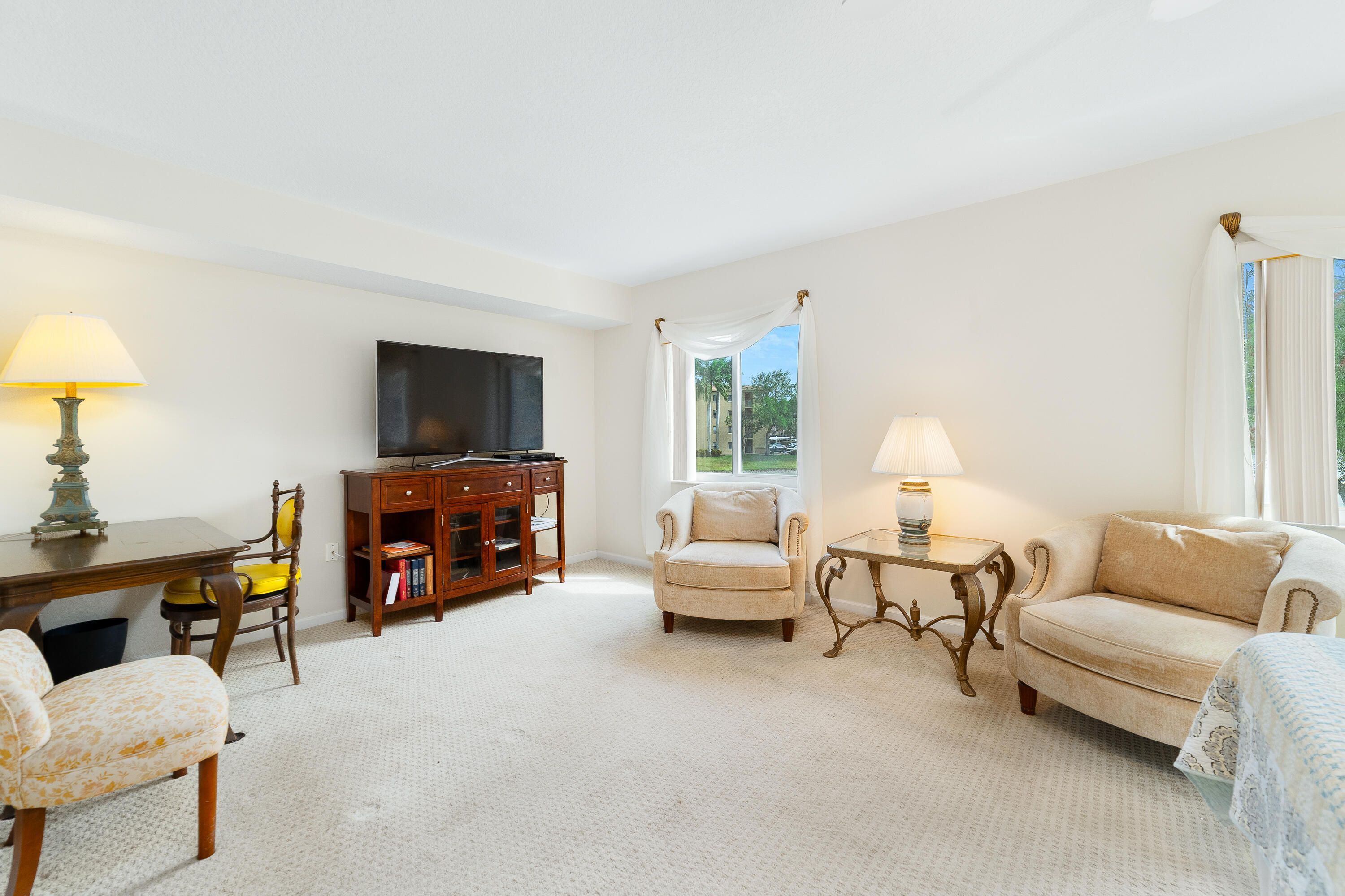 PRICED TO SELL, MOTIVATED SELLER! You'll love the gorgeous LAKE view from this bright and spacious unit in a fantastic, active 55+ community that has so much to offer! The eat-in kitchen is equipped with stainless steel appliances, Corian countertops, pantry and breakfast area. There is ceramic tile in the living areas and den, laminate in the guest bedroom and luxury carpet in the primary bedroom. The primary bedroom faces the lake, and offers a generous walk-in and strip closets. The en-suite primary bathroom is finished with dual sinks, separate tub and shower. Other notable features include a laundry room with a sink, plenty of storage closets, plantation shutters, 2023 AC and 2021 water heater. The roof is expected to be replaced in 2025. This unit is located steps away from the palm