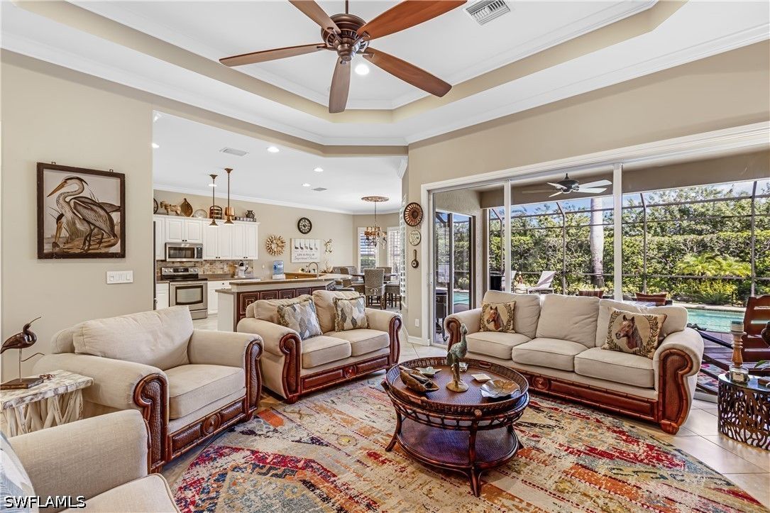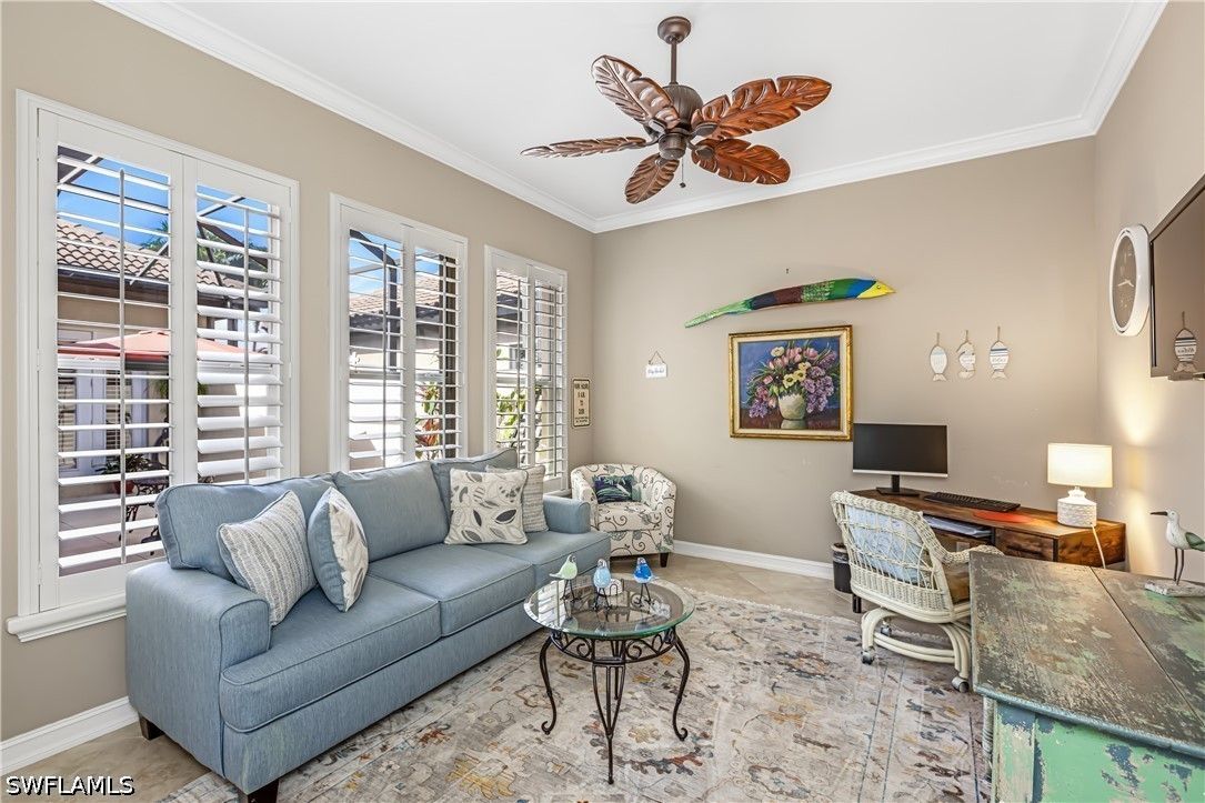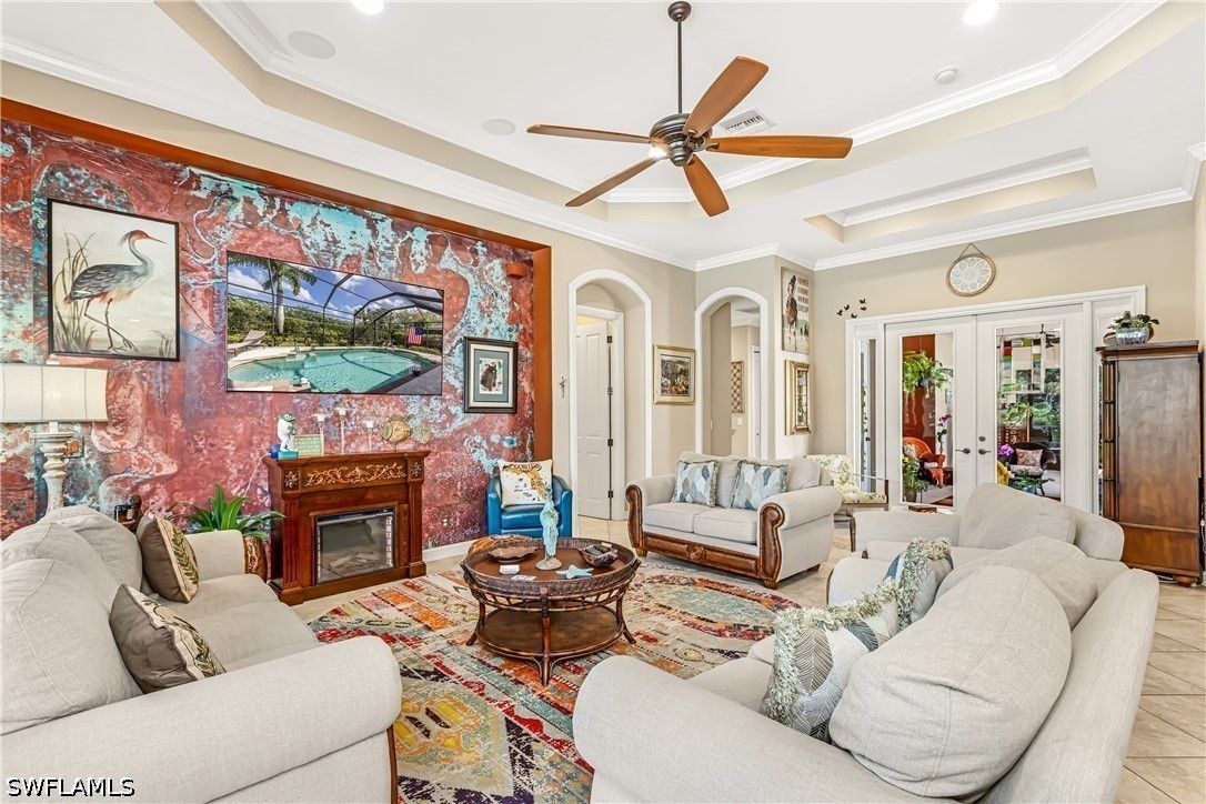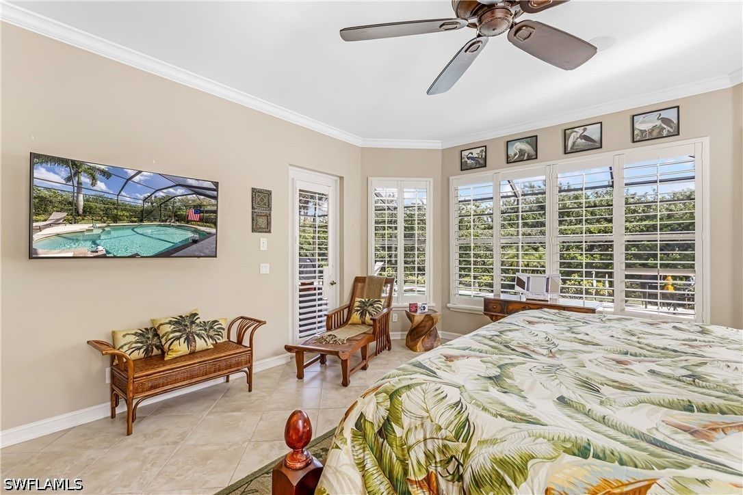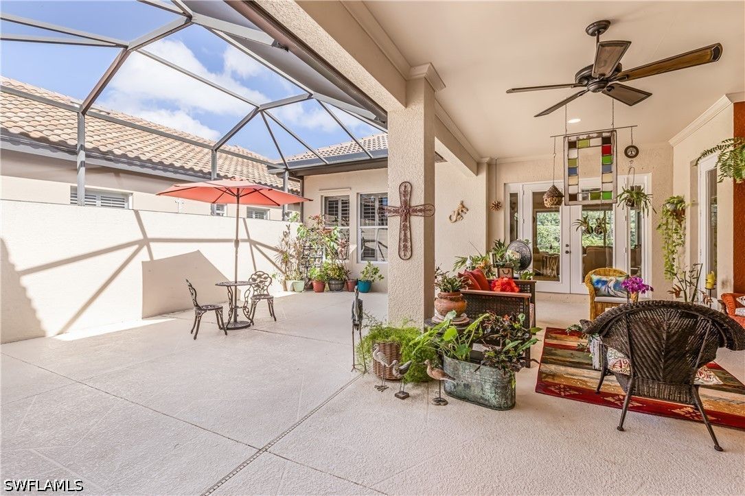 First time since the spring of 2022 a most popular "Salerno" larger courtyard floor plan style home such as this has been offered on the market in the Savona section of Grandezza! Enjoy a spacious courtyard to entertain w/cabana for your guests + your pool is desirably located at the rear lanai for added enjoyment. The back yard is nicely landscaped. The great room has a large open kitchen with a rich epoxy finish countertop, stainless steel appliances, & light cabinetry. A closet has been added to the study, making this a true 4 bedroom home. Also featured are plantation shutters, crown molding, walk-in closets , tray ceiling, electric storm shutter, wall tv's included + garage wall boards & cabinets in this fine home. All within beautiful Grandezza, a year-round active community , with a fine private golf course not mandatory to join, a 53,000 sq. ft. clubhouse in a prime SW Florida location, near shopping, Hertz Arena, FGCU, the airport, hotels, restaurants & more to come.