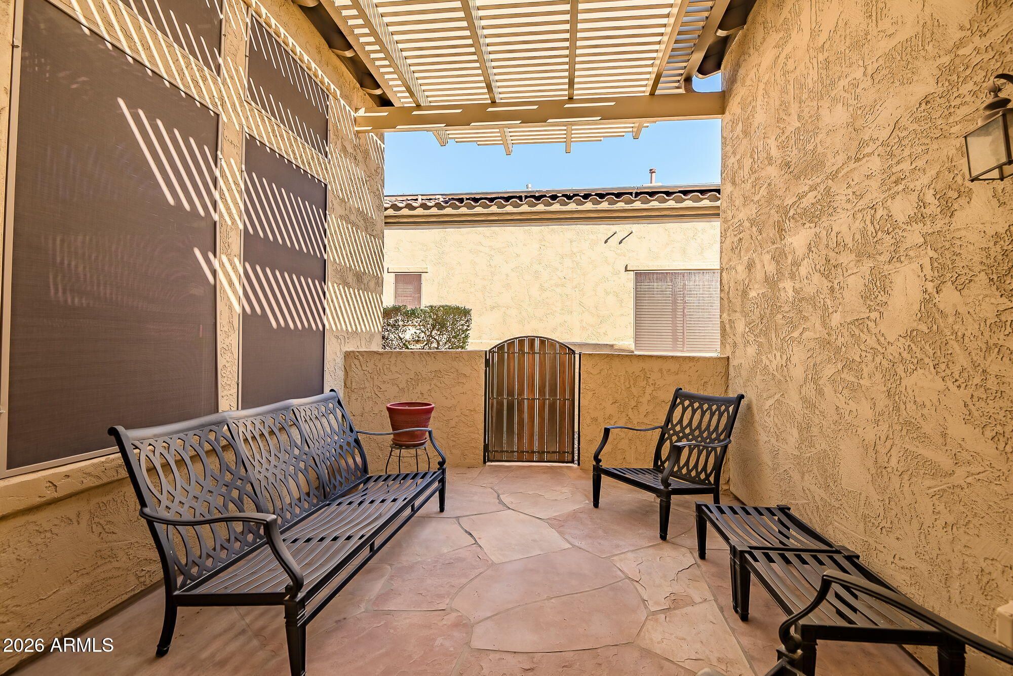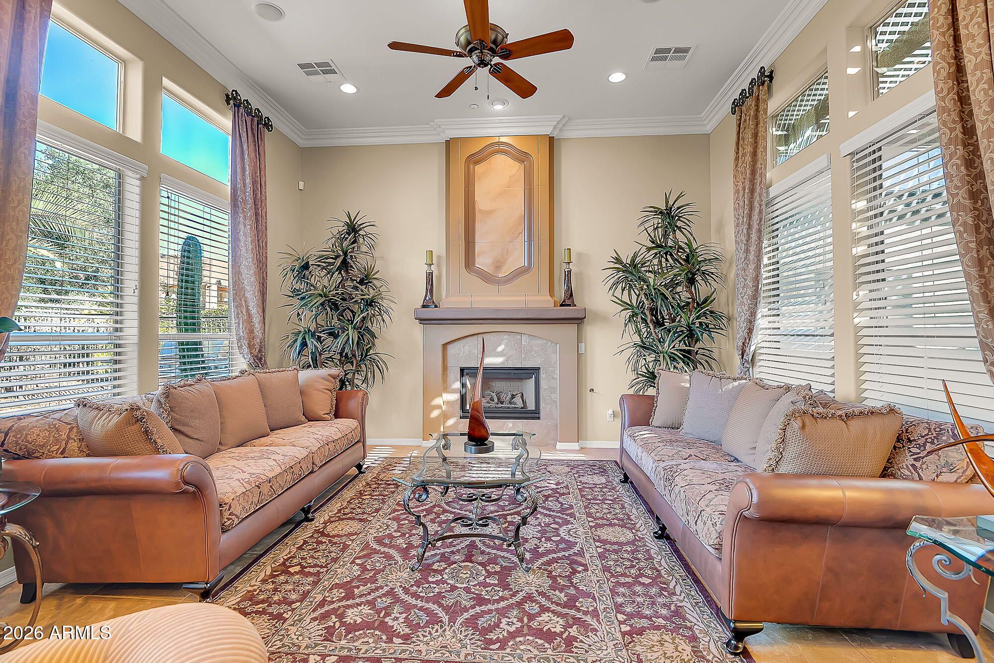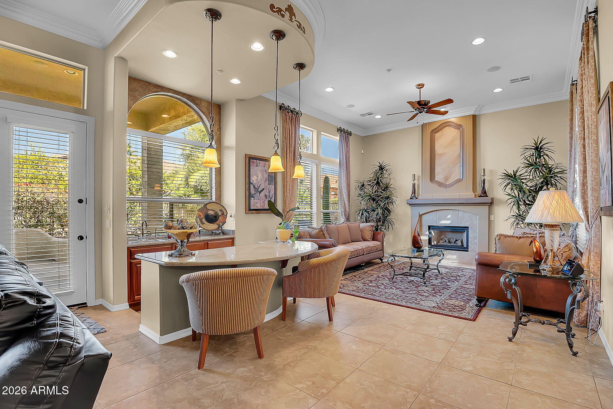 This stunning residence offers a rare sense of warmth, scale, and timeless sophistication. Lovingly maintained by the original owners, the home feels refined yet inviting, with every space thoughtfully designed and beautifully cared for. Soaring 12 foot ceilings, abundant natural light, and rich architectural details create an immediate sense of arrival. Expansive living areas flow seamlessly, ideal for both intimate everyday moments and hosting with ease. Elegant crown molding throughout adds a level of craftsmanship and polish that quietly elevates the entire home. The heart of the home is both functional and beautiful, opening naturally to gathering spaces that invite connection and comfort. A dedicated den offers flexibility for a home office, library, or private retreat. The primary suite is a true sanctuary, spacious, serene, and designed for rest and relaxation. Step outside to a peaceful outdoor setting with multiple patios, perfect for morning coffee, evening conversations, or enjoying Arizona's year-round weather. Mature landscaping and courtyard-style spaces create privacy and a tranquil, resort-like atmosphere. This home is truly move-in ready and is being sold furnished, allowing you to begin enjoying the lifestyle immediately. With recent major system upgrades and immaculate condition throughout, this is a rare opportunity to own a home where quality, care, and elegance are felt in every detail. Inquire today to learn more!