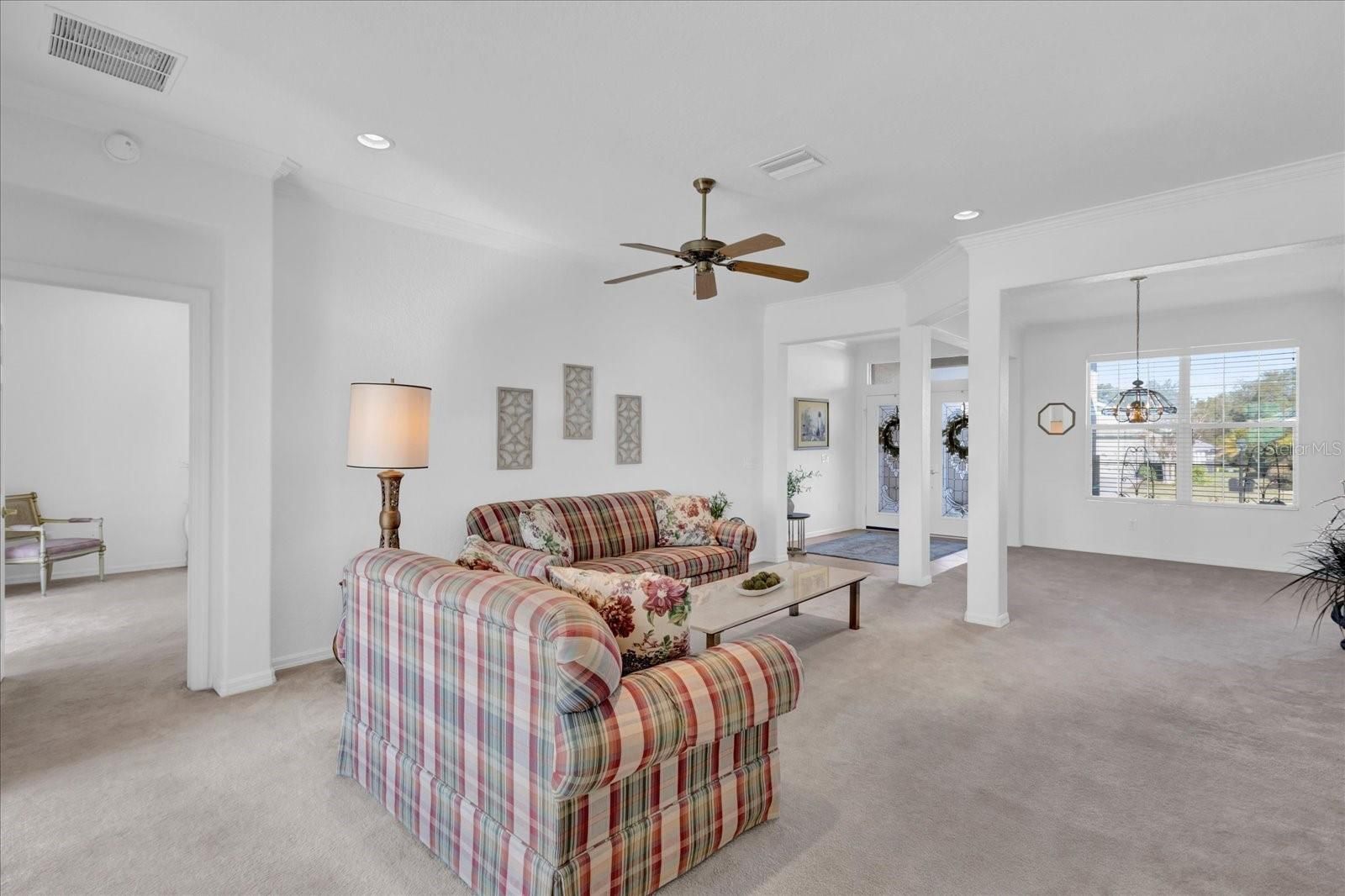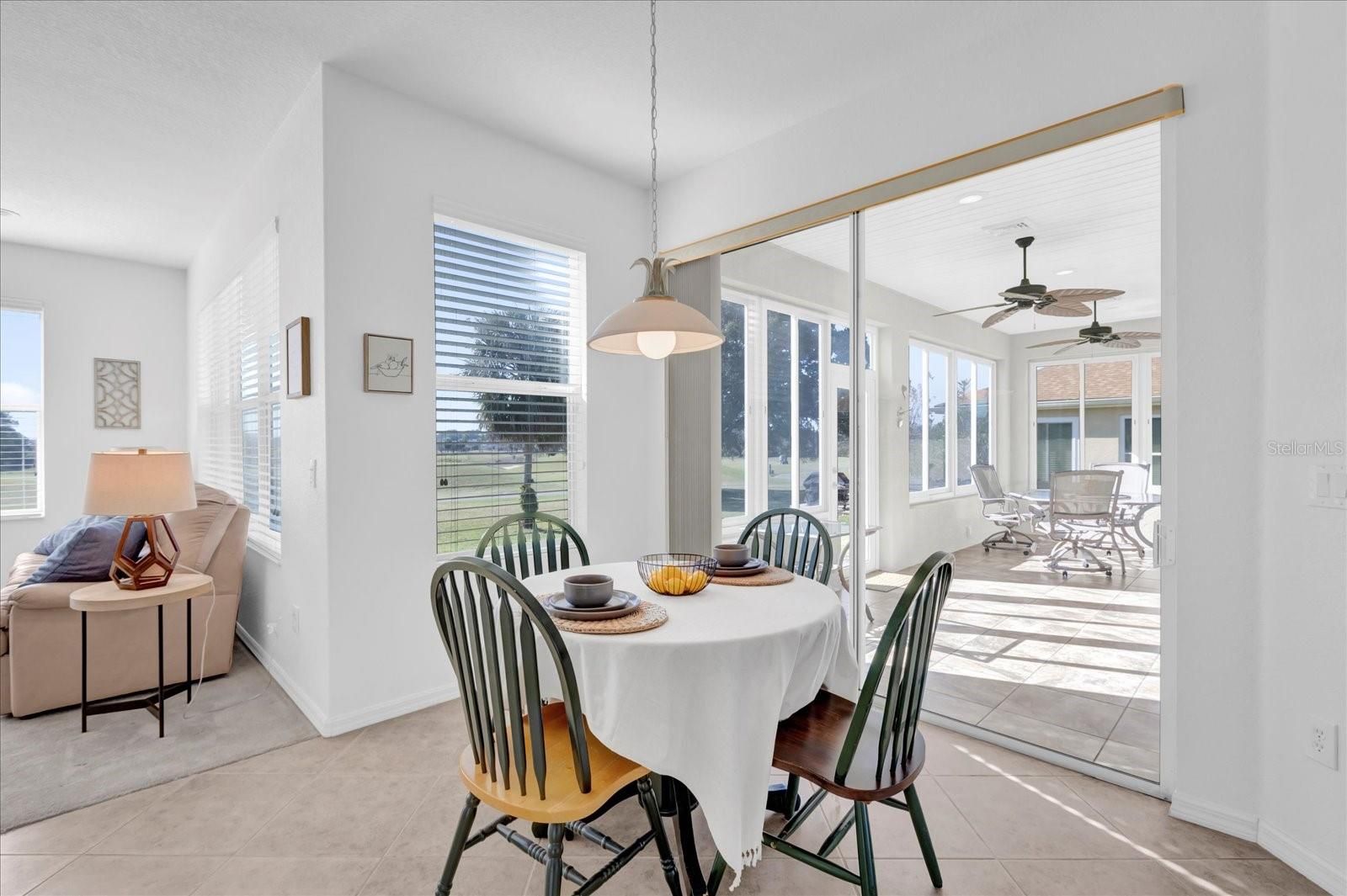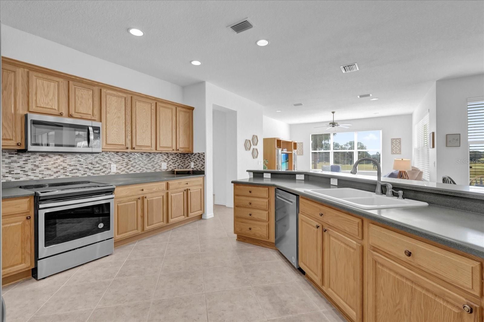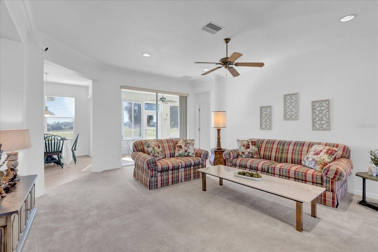 Welcome to your dream home on the golf course. This stunning Kingston Model in Hampton Hills boasts over 2,400 square feet of luxury living. As you approach, you'll be struck by the professionally landscaped yard and double lead glass doors. Inside and prepare to be wowed by the gorgeous views of the golf course from every angle. The spacious foyer leads into a formal dining room and living room, ideal for hosting dinner parties or enjoying quiet evenings with family. But it's when you step onto the enclosed lanai that you'll be captivated. The tile flooring, large sliding windows and backyard access make this space ideal for entertaining or simply relaxing while taking in the breathtaking panoramic view. On its own side of the house, the primary suite is a retreat with oversized windows showcasing those same incredible views. You'll love getting ready in your spa-quality en suite featuring a garden tub and shower. And don't forget about that huge walk-in closet. The heart of this home is undoubtedly the expansive kitchen with Corian countertops, stainless steel appliances, glass backsplash, ample cabinets and pantry. Imagine cooking up delicious meals while admiring your surroundings through those big picture windows. Talk about inspiration! The breakfast nook and large family room are also positioned to enjoy those amazing golf course views. But let's not forget about guests, they'll feel right at home in their oversized second bedroom with its golf course view or in the spacious third bedroom complete with a big closet. The second bath conveniently features plenty of counter space plus a linen closet for extra storage. And finally, practicality meets convenience with an oversized laundry room that can easily double as a butler's pantry because who doesn't want more cabinet space? Plus, an expanded two-car plus golf cart garage means there's plenty of storage for all your needs. Don't miss out on this incredible opportunity to live on one of our area's most beautiful golf courses. Schedule your showing today and see why this home is must-see.