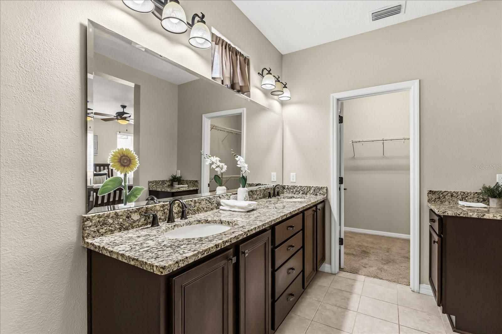 - Ceiling Fan(s), Eat-in Kitchen, Kitchen/Family Room Combo, Open Floorplan, Main Level Primary, Solid Surface Counters, Split Bedrooms, Stone Counters, Walk-In Closet(s)