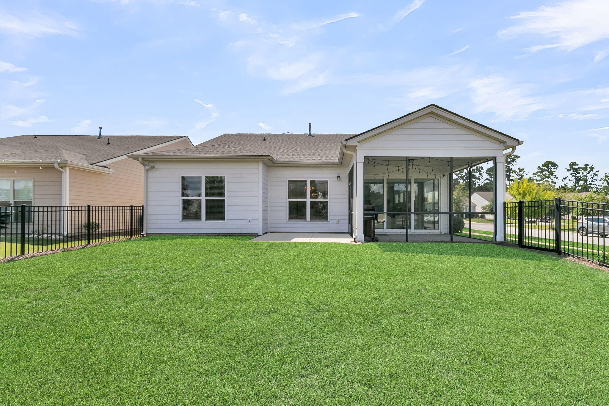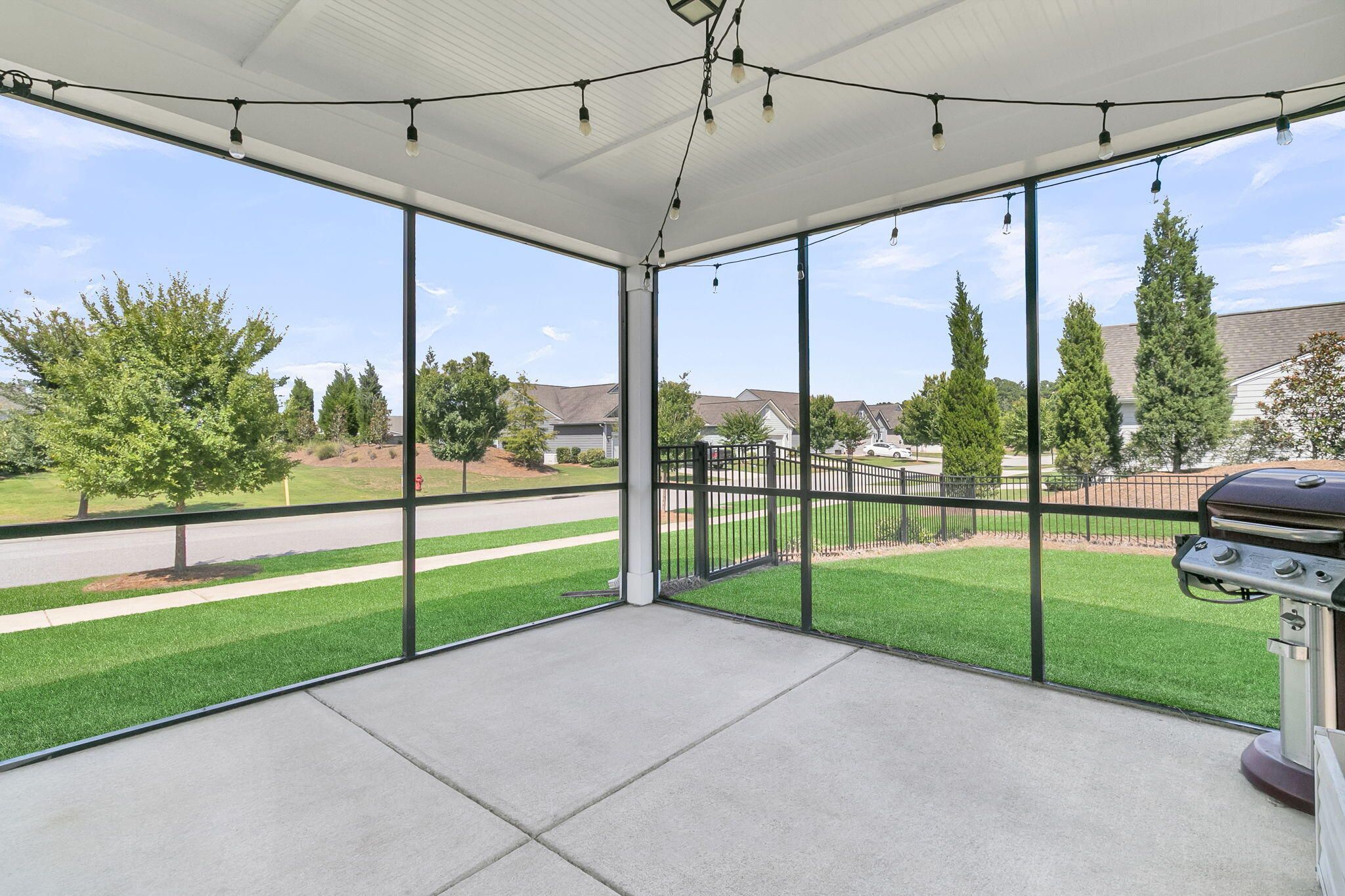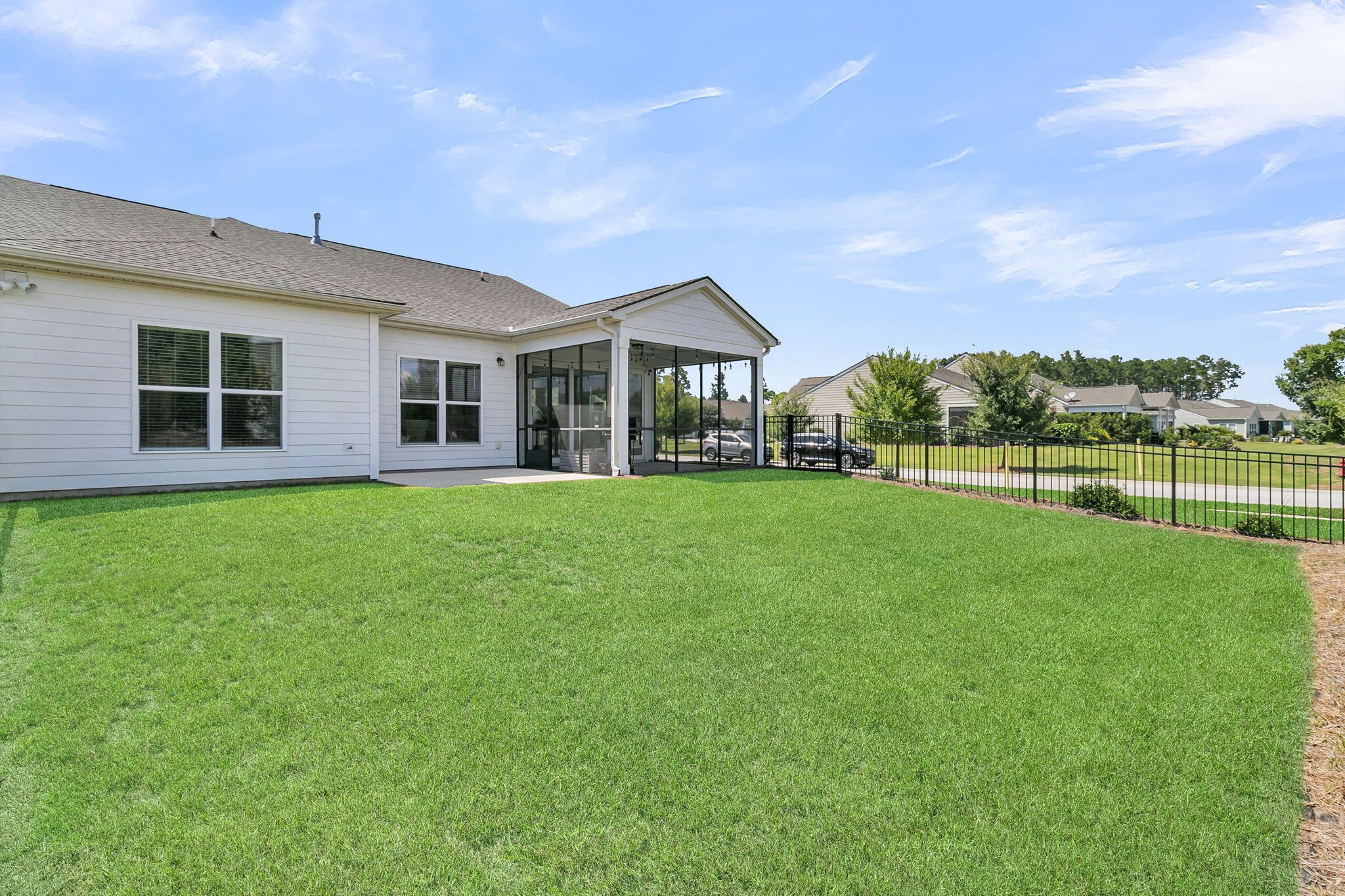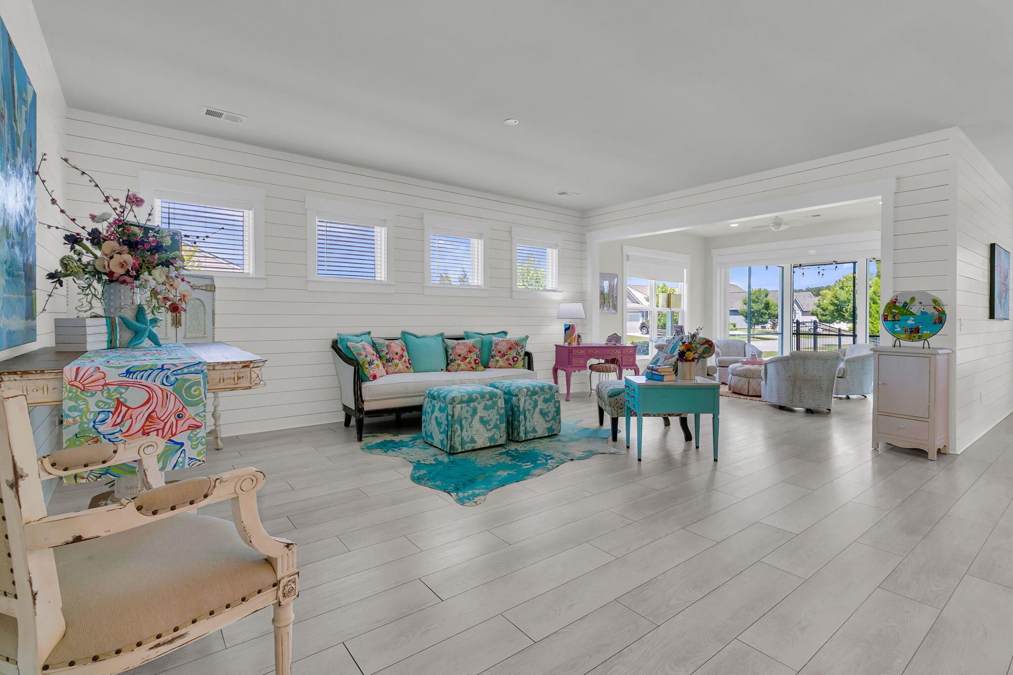 Light, bright, and with quintessential coastal charm, this 3 bedroom, 2 bath home with extra flex space/office is sure to WOW you! Hardiplank siding and a full front porch provide a welcoming curb appeal. Step inside to find white-toned laminate wood floors throughout all areas and bedrooms - NO CARPET in home! Shiplap trim detail extends through the foyer, living area, and dining room. The luxury island kitchen is a true chef's delight with soft-closing white cabinetry with double tray pull out storage, quartz countertops, KitchenAid appliances including a five-burner gas cooktop, double ovens, and refrigerator, farmhouse sink, stone and glass mosaic backsplash, custom pendant light (and two additional pre-wires), under-cabinet lighting, and corner pantry. A spacious living room anddining areas sit adjacent to the kitchen, making a great entertaining space. The light-filled sunroom offers electronic privacy shades and a collapsable triple-sliding glass doors that leads to the screened-in porch. A separate patio space with gas line for a grill connection makes the perfect place to spend an evening with new friends. Enjoy your own private oasis - this home is situated on a corner homesite with a private fenced-in backyard overlooking a landscaped berm. Back inside, the Owner's Suite includes an ensuite bath with 12" x 24" tile floors, double sink quartz vanity, a walk-in spa shower with tile walls and floors and extra rain shower head, and large walk-in closet. Two guest rooms, one large enough room for a King-size bed, sit on the opposite side of the house, providing ample privacy for visitors. A guest bath, flex room/home office, and laundry room with large storage closet complete the inside space. Don't miss the garage - a built-in pull down ladder leads to a huge attic storage area to house all of life's 'extras.' Be part of the Charleston area's premier 55+ lifestyle community, Del Webb Nexton. Just a short golf cart ride to two grocery stores, restaurants, wine bars, spas, and so much more! Only five minutes to charming historic downtown Summerville and 25 minutes to Charleston! A 27,000 square foot amenities center with indoor and outdoor pools, sport courts, and fitness center, plus a full-time lifestyle director with clubs and planned community events will have loving this new life chapter!