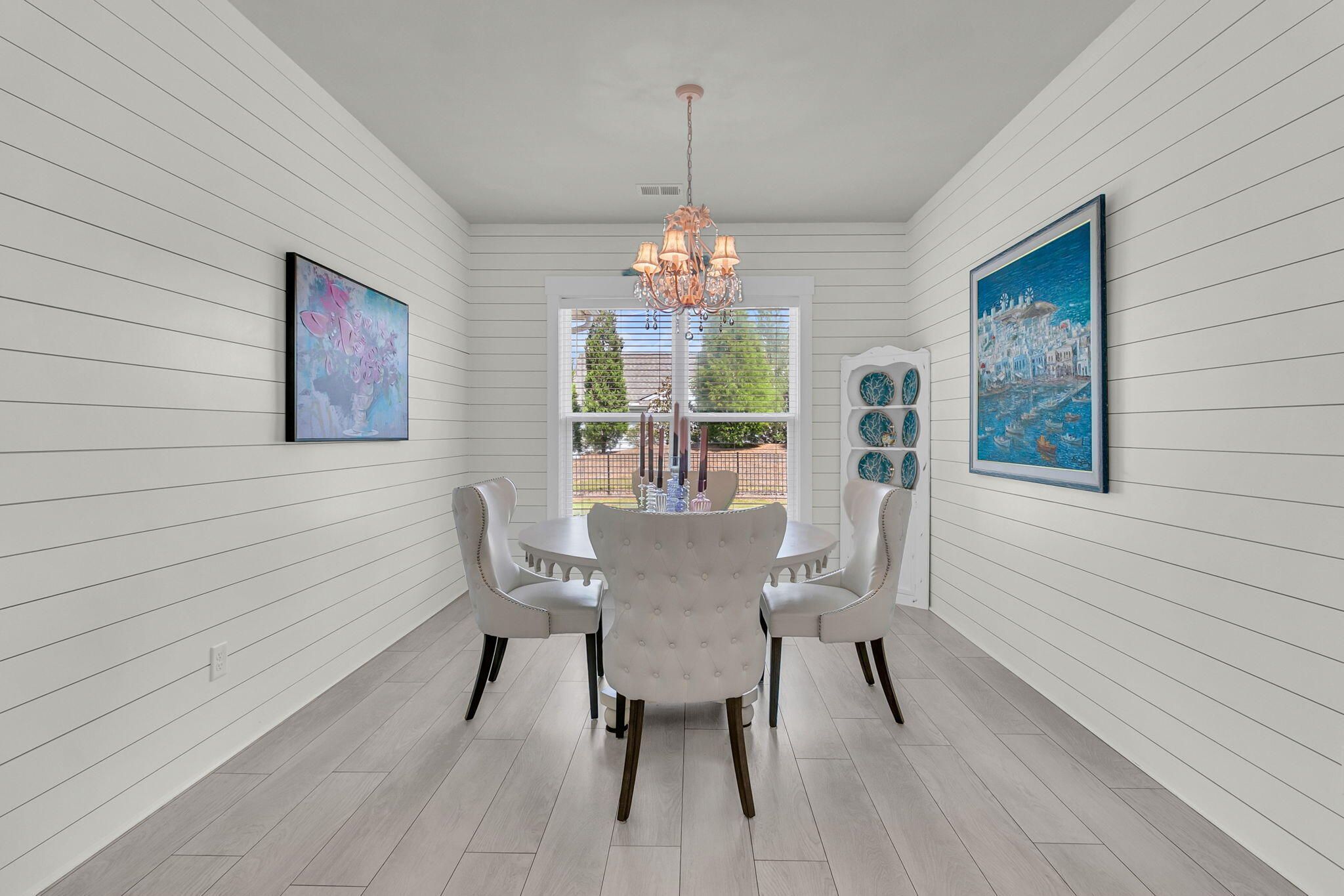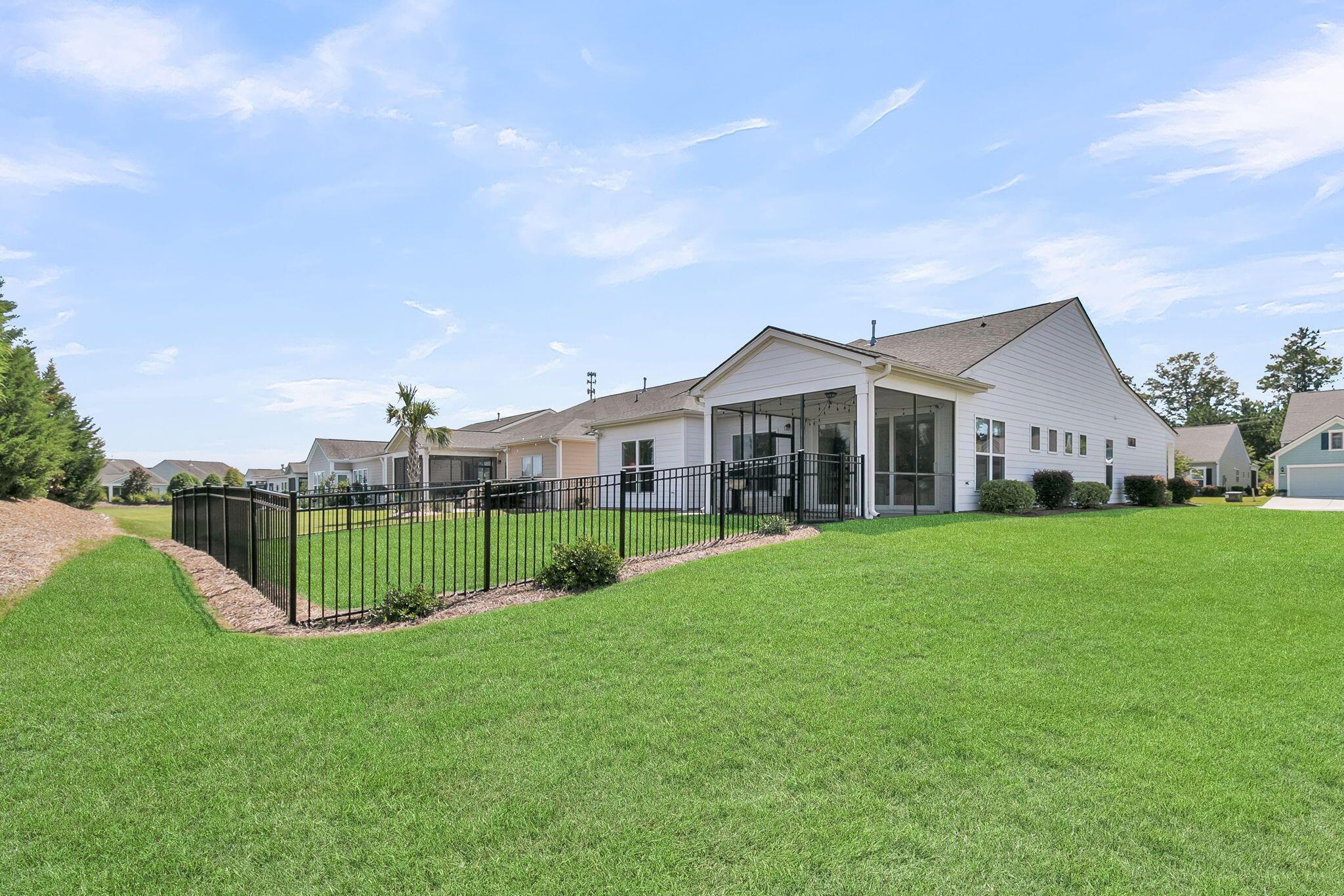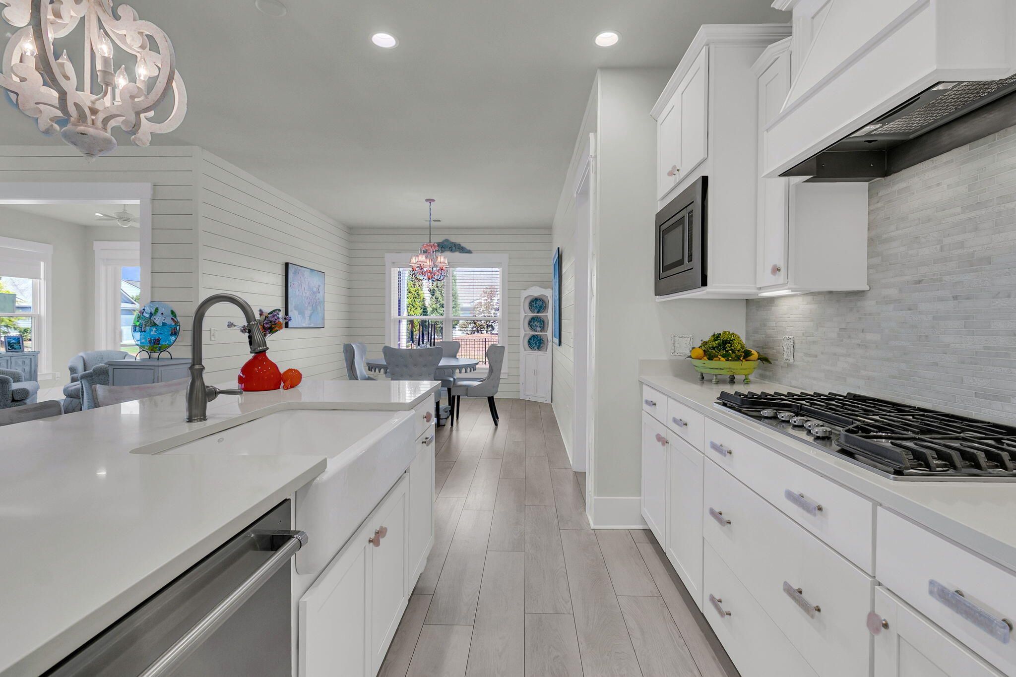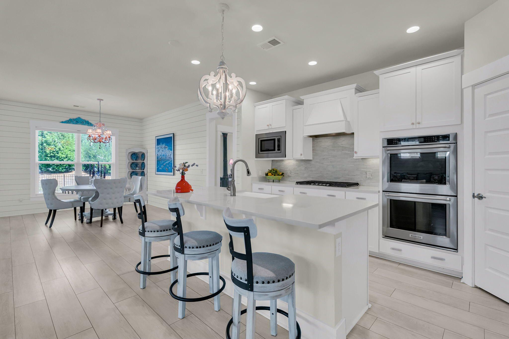 Light, bright, and with quintessential coastal charm, this 3 bedroom, 2 bath home with extra flex space/office is sure to WOW you! Hardiplank siding and a full front porch provide a welcoming curb appeal. Step inside to find white-toned laminate wood floors throughout all areas and bedrooms - NO CARPET in home! Shiplap trim detail extends through the foyer, living area, and dining room. The luxury island kitchen is a true chef's delight with soft-closing white cabinetry with double tray pull out storage, quartz countertops, KitchenAid appliances including a five-burner gas cooktop, double ovens, and refrigerator, farmhouse sink, stone and glass mosaic backsplash, custom pendant light (and two additional pre-wires), under-cabinet lighting, and corner pantry. A spacious living room anddining areas sit adjacent to the kitchen, making a great entertaining space. The light-filled sunroom offers electronic privacy shades and a collapsable triple-sliding glass doors that leads to the screened-in porch. A separate patio space with gas line for a grill connection makes the perfect place to spend an evening with new friends. Enjoy your own private oasis - this home is situated on a corner homesite with a private fenced-in backyard overlooking a landscaped berm. Back inside, the Owner's Suite includes an ensuite bath with 12" x 24" tile floors, double sink quartz vanity, a walk-in spa shower with tile walls and floors and extra rain shower head, and large walk-in closet. Two guest rooms, one large enough room for a King-size bed, sit on the opposite side of the house, providing ample privacy for visitors. A guest bath, flex room/home office, and laundry room with large storage closet complete the inside space. Don't miss the garage - a built-in pull down ladder leads to a huge attic storage area to house all of life's 'extras.' Be part of the Charleston area's premier 55+ lifestyle community, Del Webb Nexton. Just a short golf cart ride to two grocery stores, restaurants, wine bars, spas, and so much more! Only five minutes to charming historic downtown Summerville and 25 minutes to Charleston! A 27,000 square foot amenities center with indoor and outdoor pools, sport courts, and fitness center, plus a full-time lifestyle director with clubs and planned community events will have loving this new life chapter!