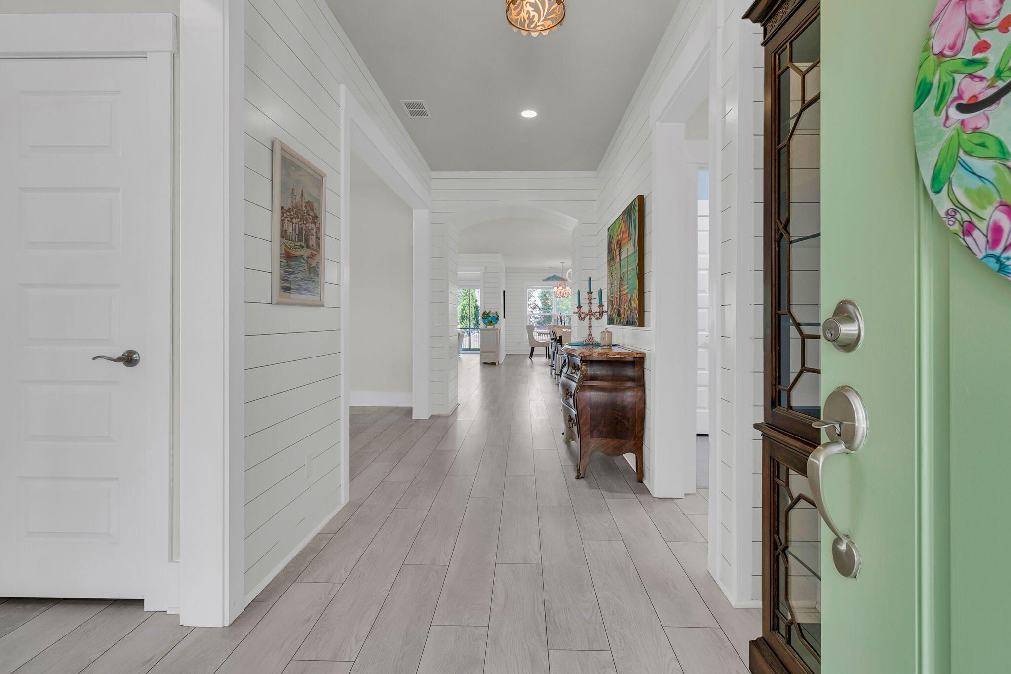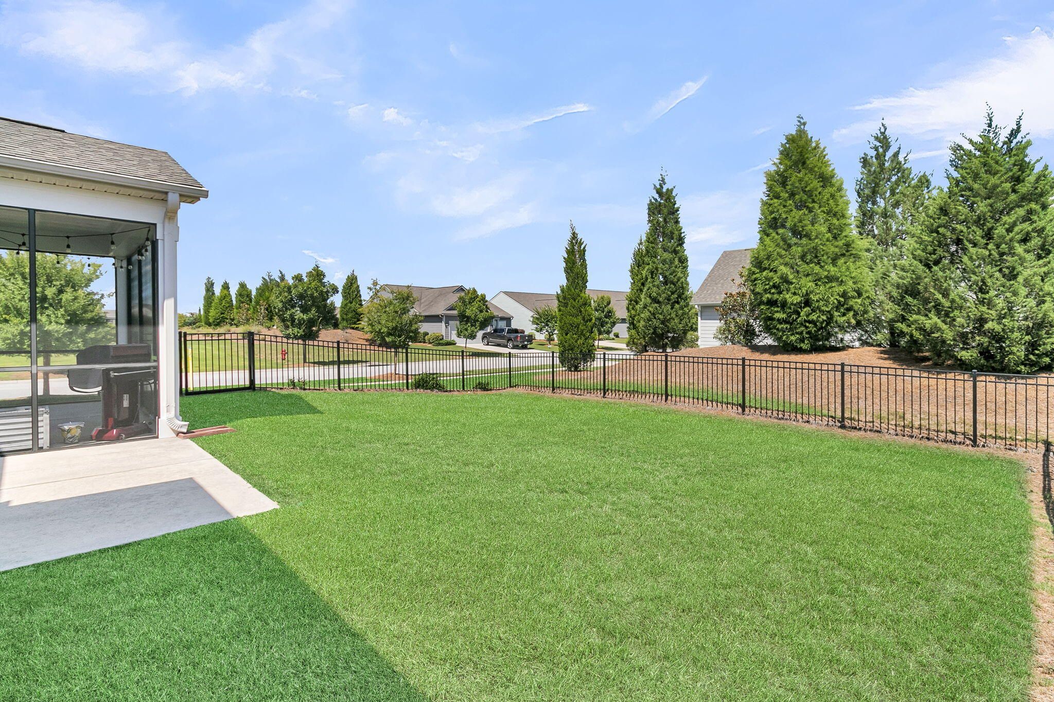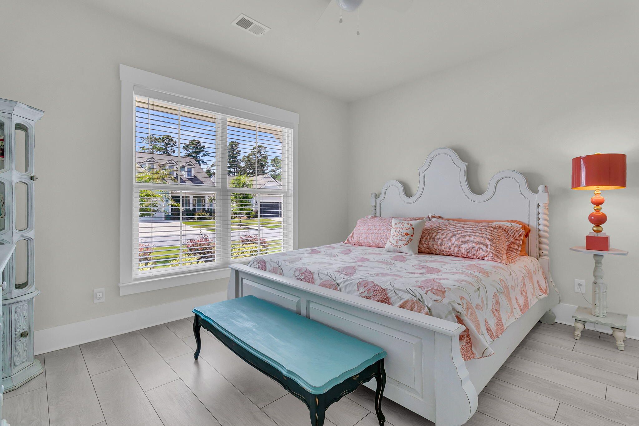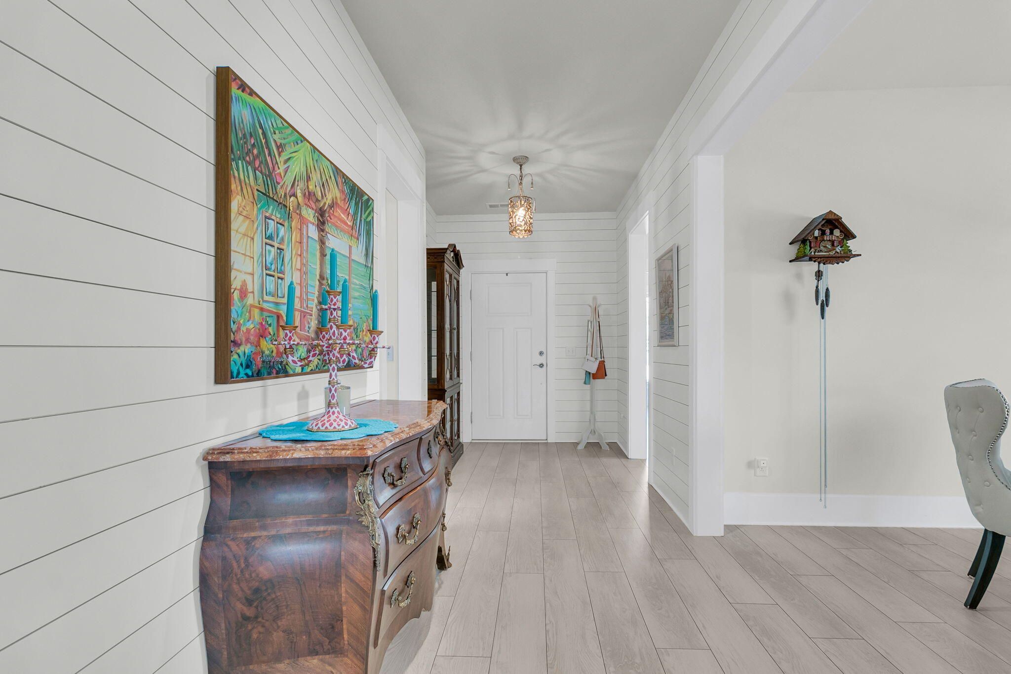 Light, bright, and with quintessential coastal charm, this 3 bedroom, 2 bath home with extra flex space/office is sure to WOW you! Hardiplank siding and a full front porch provide a welcoming curb appeal. Step inside to find white-toned laminate wood floors throughout all areas and bedrooms - NO CARPET in home! Shiplap trim detail extends through the foyer, living area, and dining room. The luxury island kitchen is a true chef's delight with soft-closing white cabinetry with double tray pull out storage, quartz countertops, KitchenAid appliances including a five-burner gas cooktop, double ovens, and refrigerator, farmhouse sink, stone and glass mosaic backsplash, custom pendant light (and two additional pre-wires), under-cabinet lighting, and corner pantry. A spacious living room anddining areas sit adjacent to the kitchen, making a great entertaining space. The light-filled sunroom offers electronic privacy shades and a collapsable triple-sliding glass doors that leads to the screened-in porch. A separate patio space with gas line for a grill connection makes the perfect place to spend an evening with new friends. Enjoy your own private oasis - this home is situated on a corner homesite with a private fenced-in backyard overlooking a landscaped berm. Back inside, the Owner's Suite includes an ensuite bath with 12" x 24" tile floors, double sink quartz vanity, a walk-in spa shower with tile walls and floors and extra rain shower head, and large walk-in closet. Two guest rooms, one large enough room for a King-size bed, sit on the opposite side of the house, providing ample privacy for visitors. A guest bath, flex room/home office, and laundry room with large storage closet complete the inside space. Don't miss the garage - a built-in pull down ladder leads to a huge attic storage area to house all of life's 'extras.' Be part of the Charleston area's premier 55+ lifestyle community, Del Webb Nexton. Just a short golf cart ride to two grocery stores, restaurants, wine bars, spas, and so much more! Only five minutes to charming historic downtown Summerville and 25 minutes to Charleston! A 27,000 square foot amenities center with indoor and outdoor pools, sport courts, and fitness center, plus a full-time lifestyle director with clubs and planned community events will have loving this new life chapter!