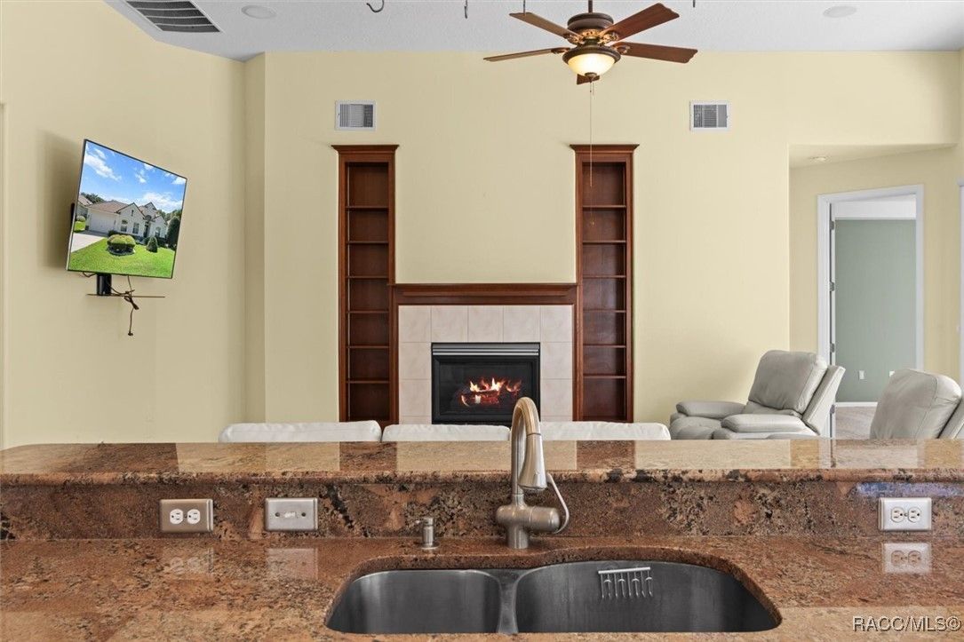 - Attic Access, Eat-in Kitchen, Fireplace, Primary Suite, Pantry, Pull Down Attic Stairs, Split Bedrooms, Solid Surface Counters, Walk-In Closet(s), Window Treatments, Sliding Glass Door(s)