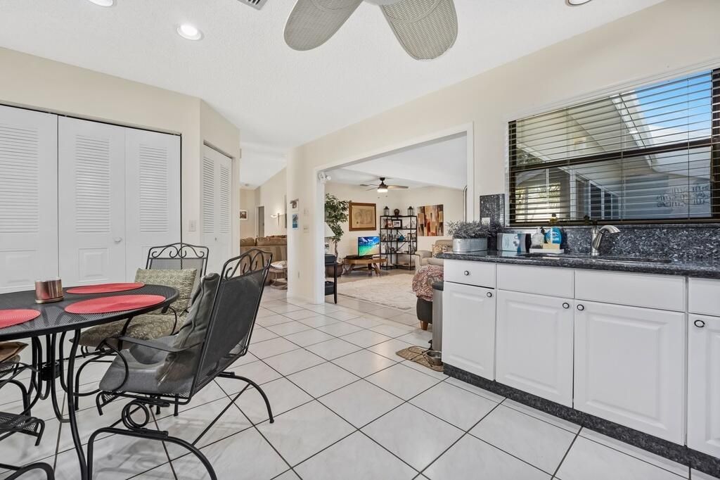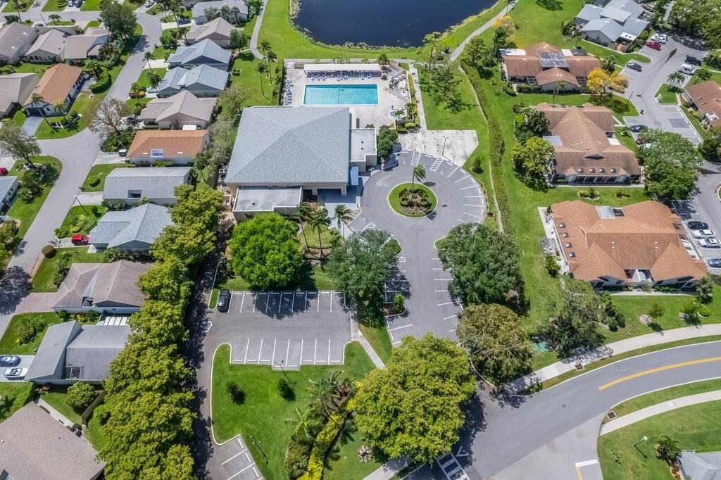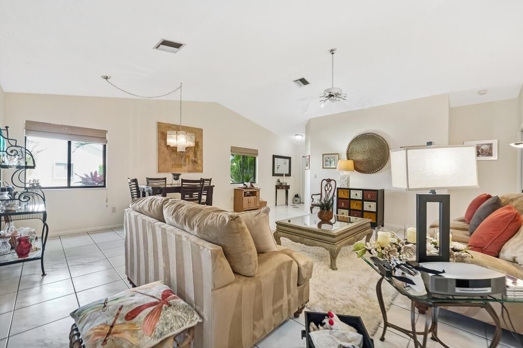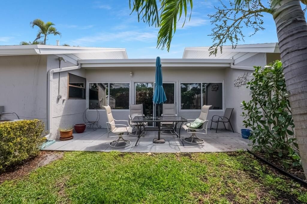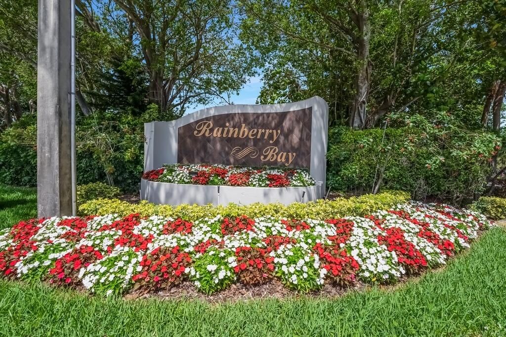 This charming corner villa is located in the popular active adult (55+) community of Rainberry Bay. The home has 2 bedrooms and 2 baths with a bright, open feel thanks to the vaulted ceilings. The eat-in kitchen is perfect for everyday meals, and there's a convenient washer and dryer inside the unit. You'll love the Florida room that overlooks the private backyard, giving you a nice space to relax or entertain. 2 parking spots are located right in front of the unit. The roof was replaced in 2023. Rainberry Bay offers fantastic amenities: residents enjoy tennis and pickleball courts, five heated pools, a fitness gym, saunas, and a clubhouse with events and social activities. The community is gated with a manned entrance and security patrol, providing a safe and welcoming environment.