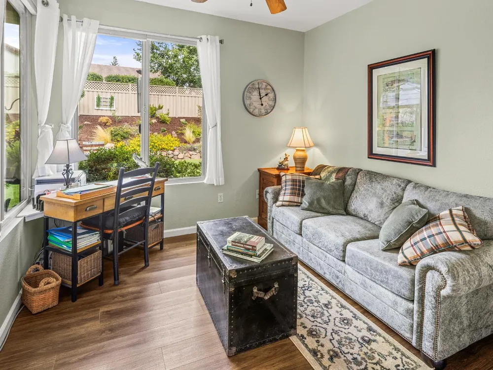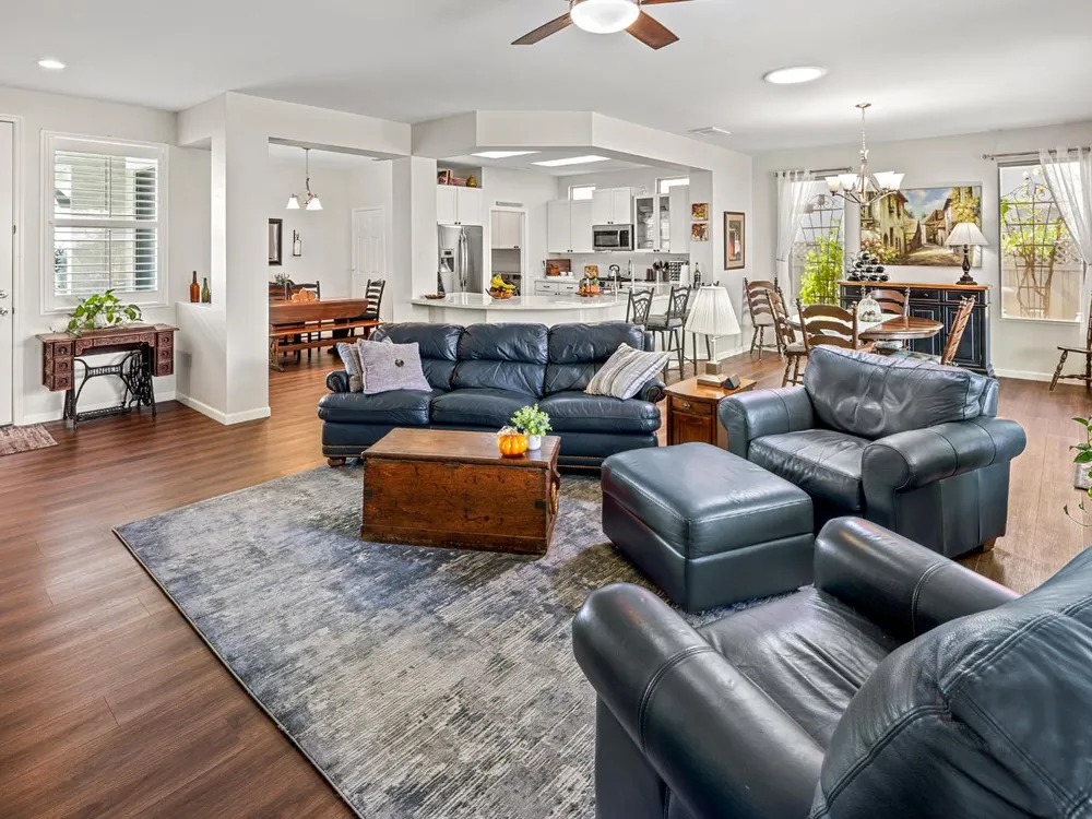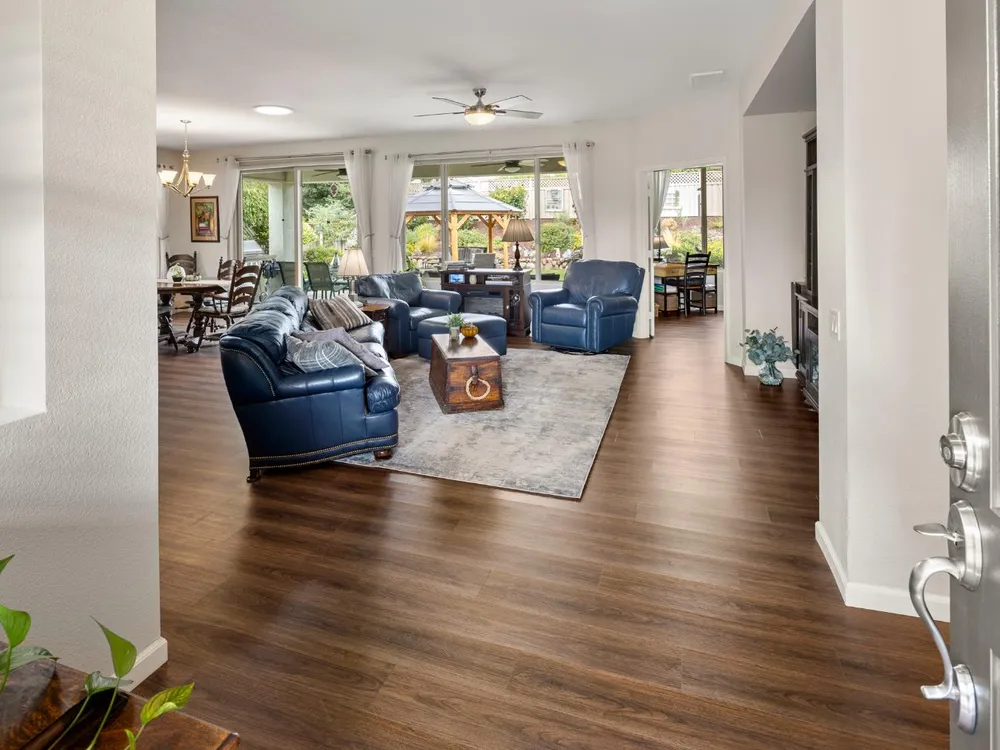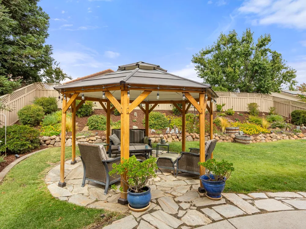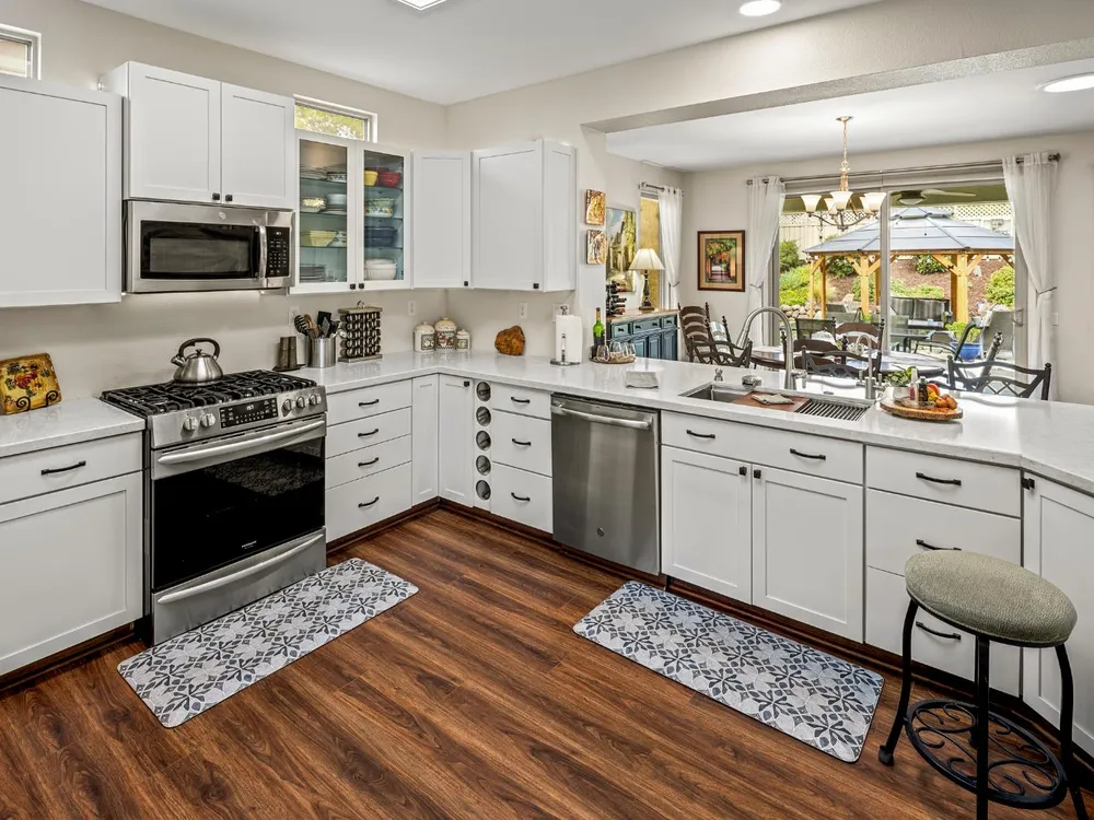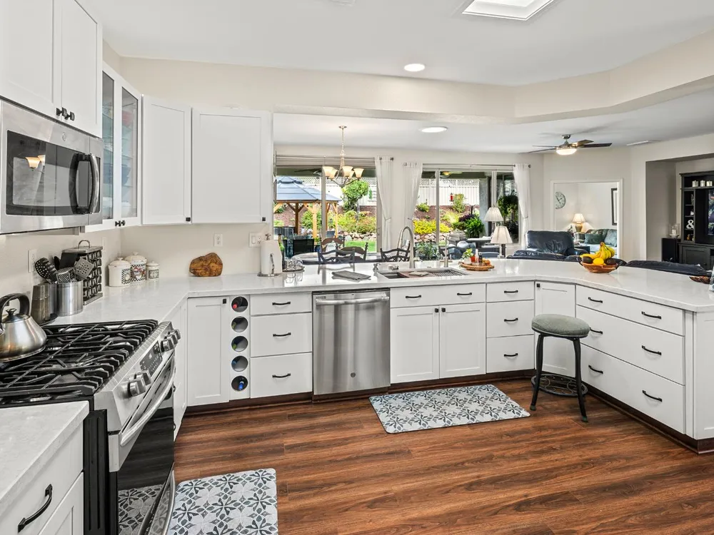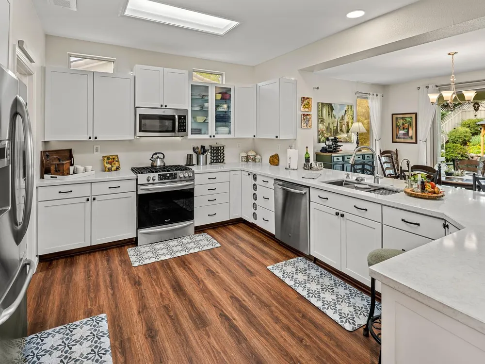 Ever-popular Tahoe Plan with 2 Bedroom, enclosed den, 2 bath and the 2.5 expanded garage is a Must See! All of the upgrades and features of this home have been carefully selected to check all the requirements of today's selective homebuyer! Let's start with the waterproof Luxury Vinyl Wide Plank throughout and the recently remodeled light and bright kitchen! The kitchen cabinetry is top of the line Kraftmaid....solid wood, white, Shaker-style! All the features and storage you want in your cabinetry; including pullouts, dovetailed drawers, and lots of storage! The bi-level, bar- height countertop is no more, replaced with an expansive flat quartz countertop! The second bath has also been redesigned with a curbless shower entry, lovely shower surround and a double sink console! Plan to entertain year round with this oversized yard and Northerly rear yard orientation. Value added with the large custom gazebo, including a radiant barrier installed in the ceiling. The plumbing was replaced! No Kitec! And the Heating/Ventilation/Air Conditioning system was installed in 2025! Virtual Tours available and lots more to share!