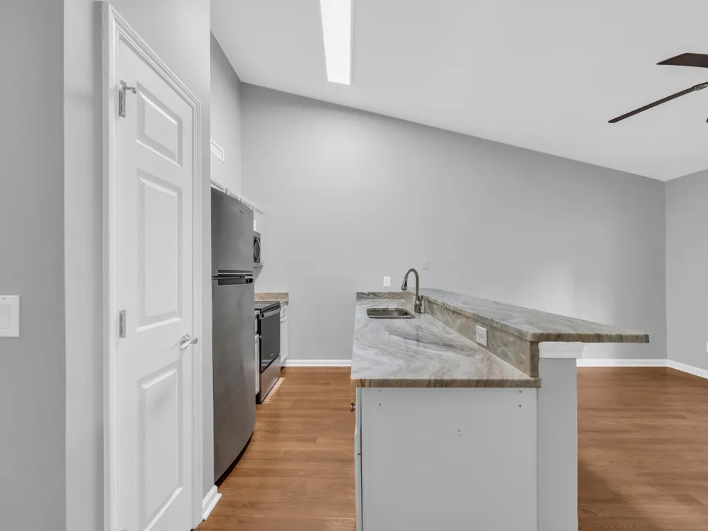 - Kitchen Island, Stainless Steel Appliances, Solid Surface Counters