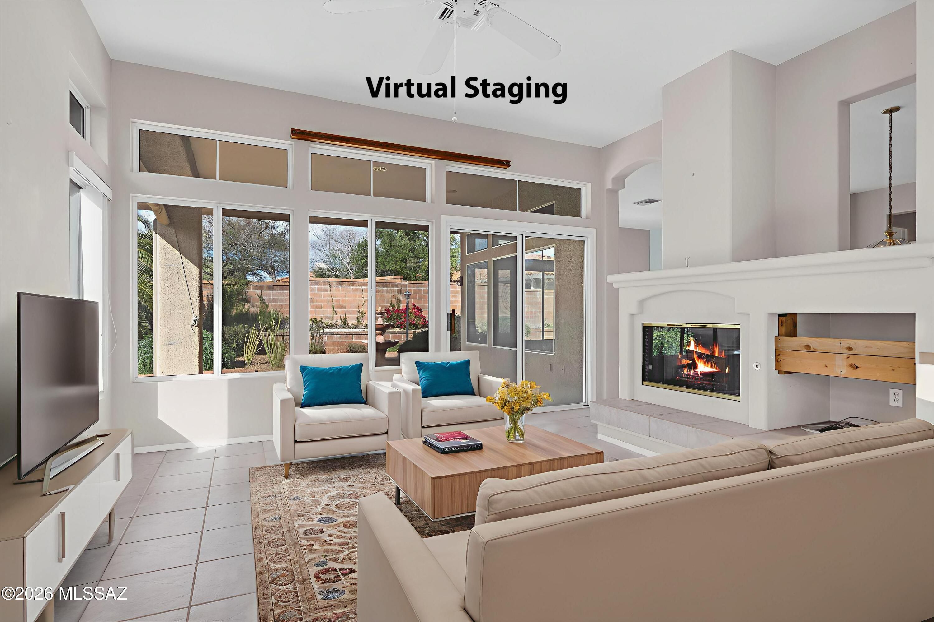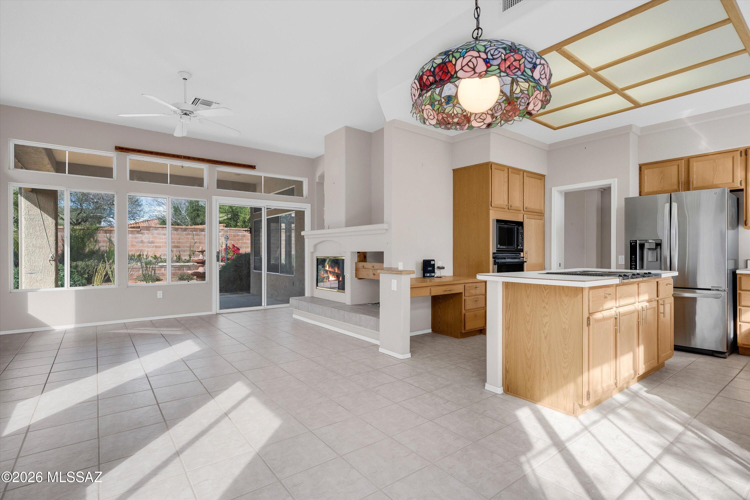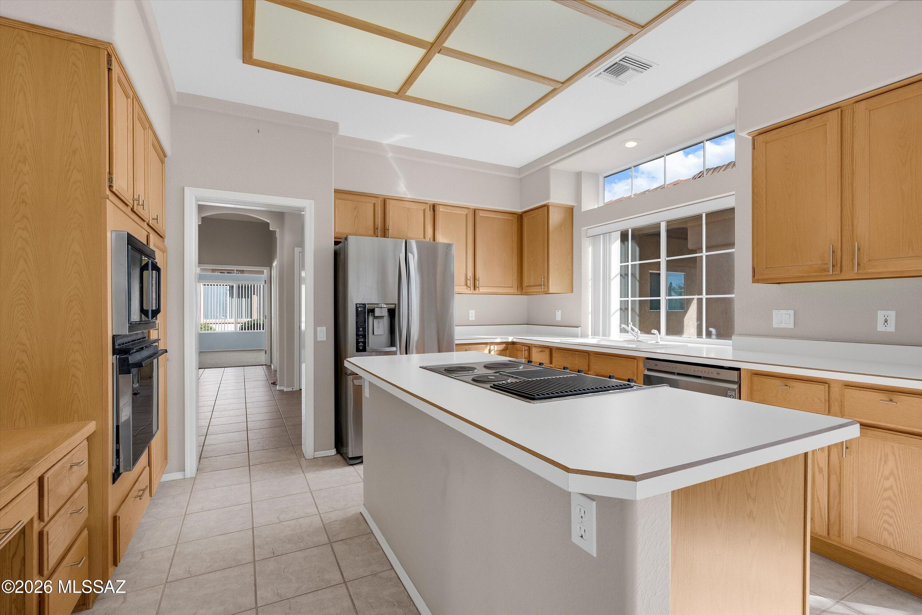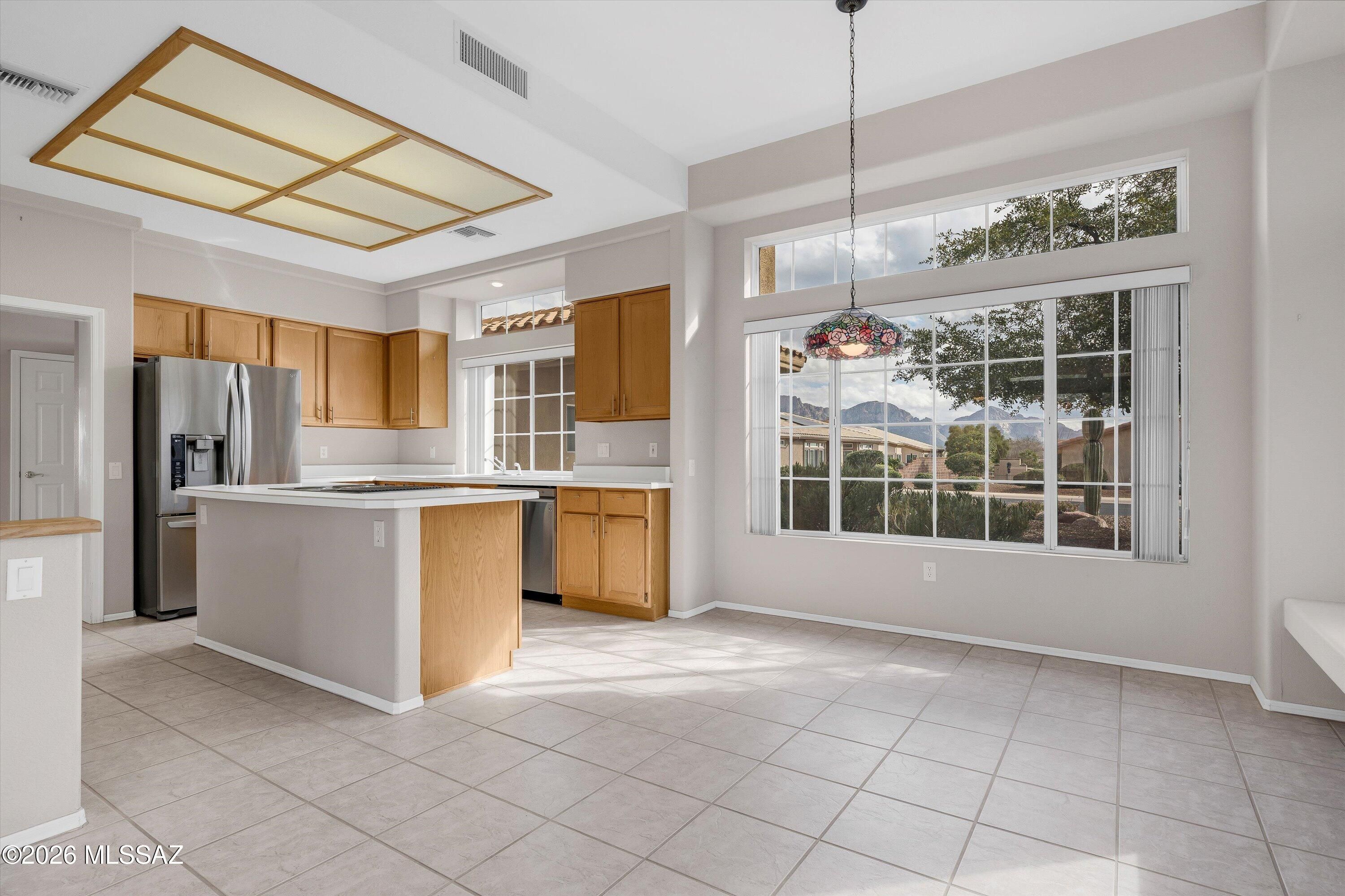 Located in the highly desirable Sun City Rancho Vistoso active adult community, this beautiful home will be hitting the market in late February. Residents enjoy a championship golf course, resort-style clubhouse, fitness center, walking trails, and a full calendar of social activities that define Arizona resort living. Inside, tall 10-foot ceilings enhance the open floor plan with a spacious kitchen featuring an island, stainless steel appliances, and 42-inch cabinets with roll-out shelving. The home offers both a formal living area and a family room with gas fireplace. The large primary suite includes a private door to the backyard and a spa-style bathroom with dual sinks, separate garden tub, and walk-in shower with seat. The private backyard offers a covered patio and extensive pavers