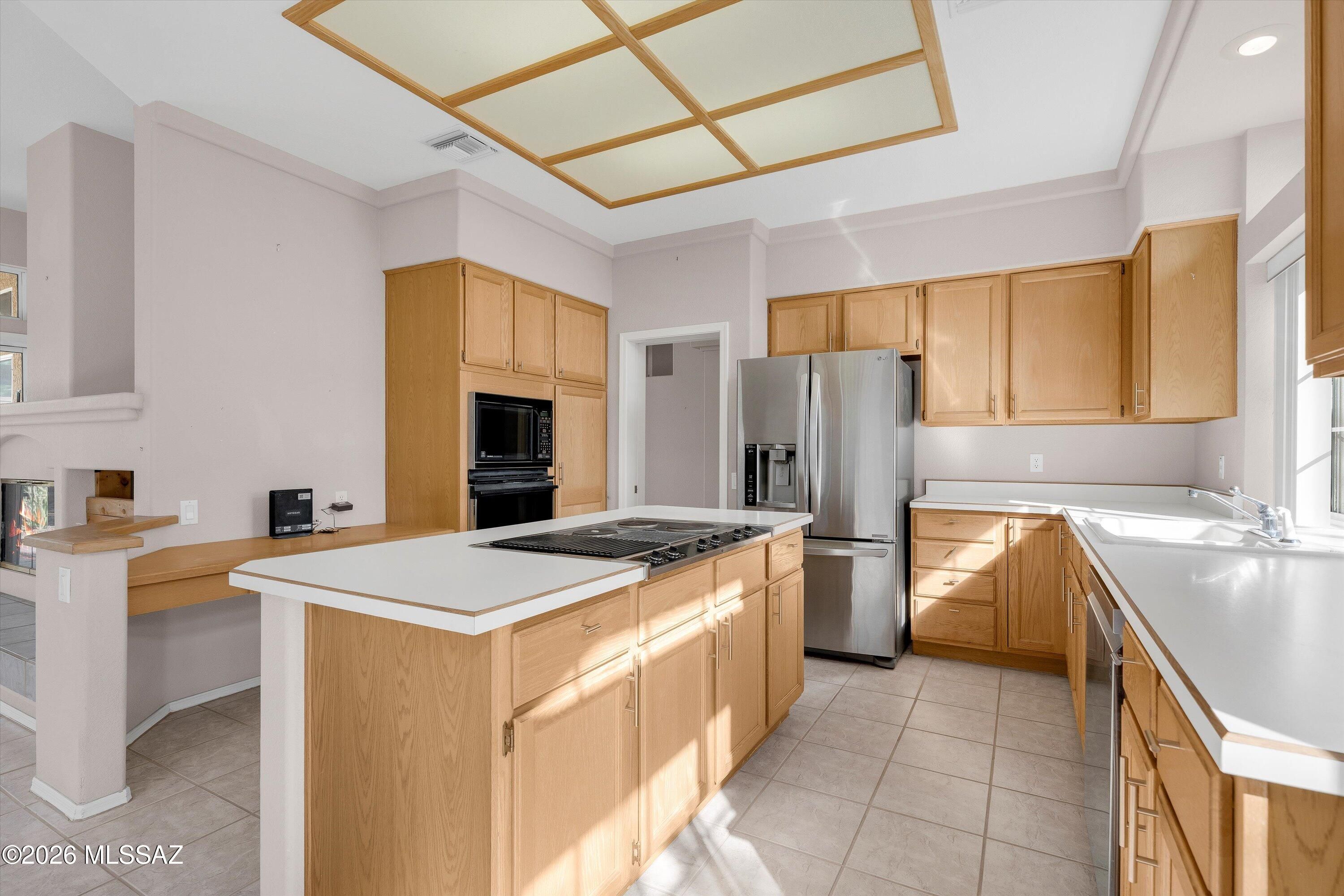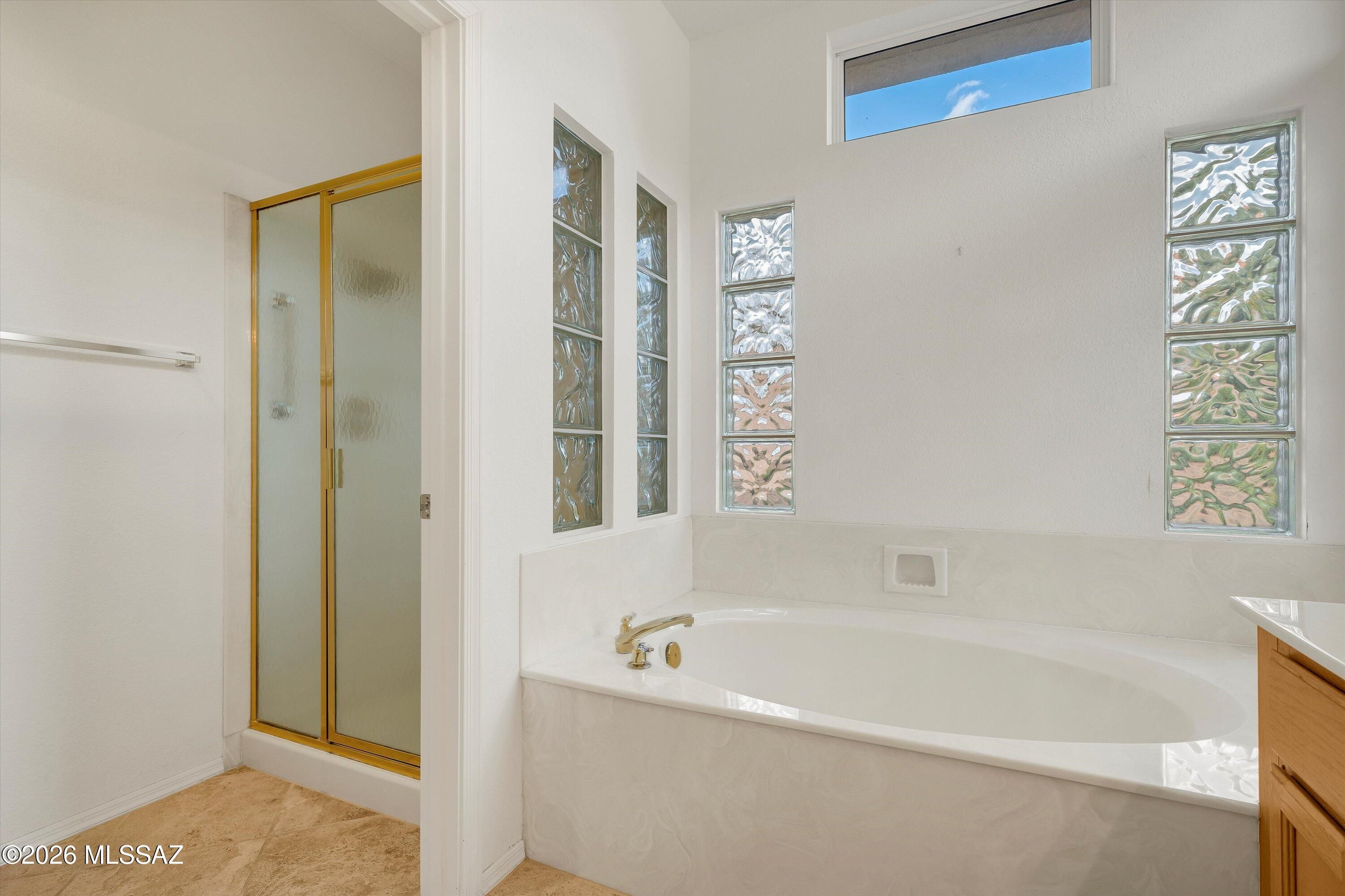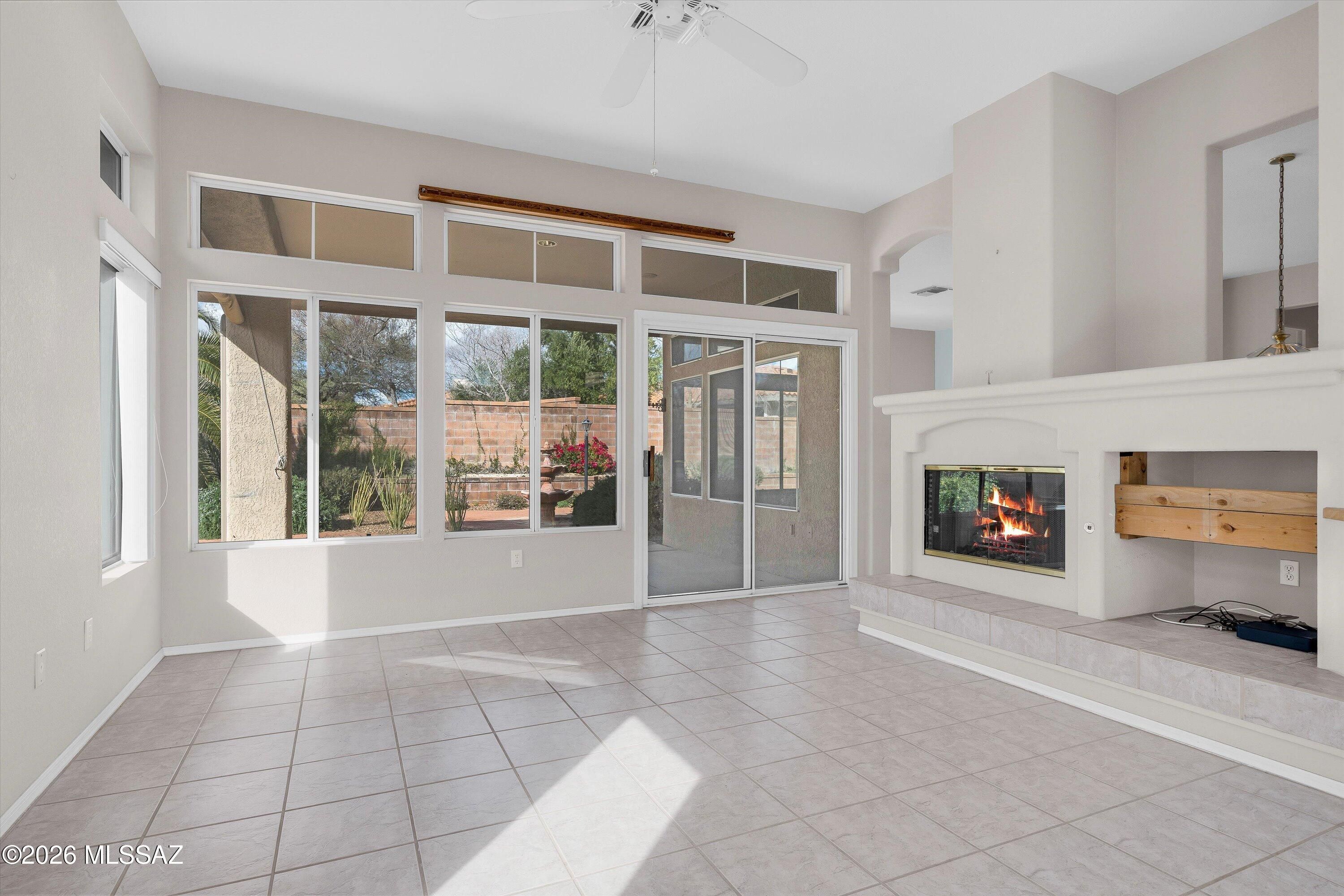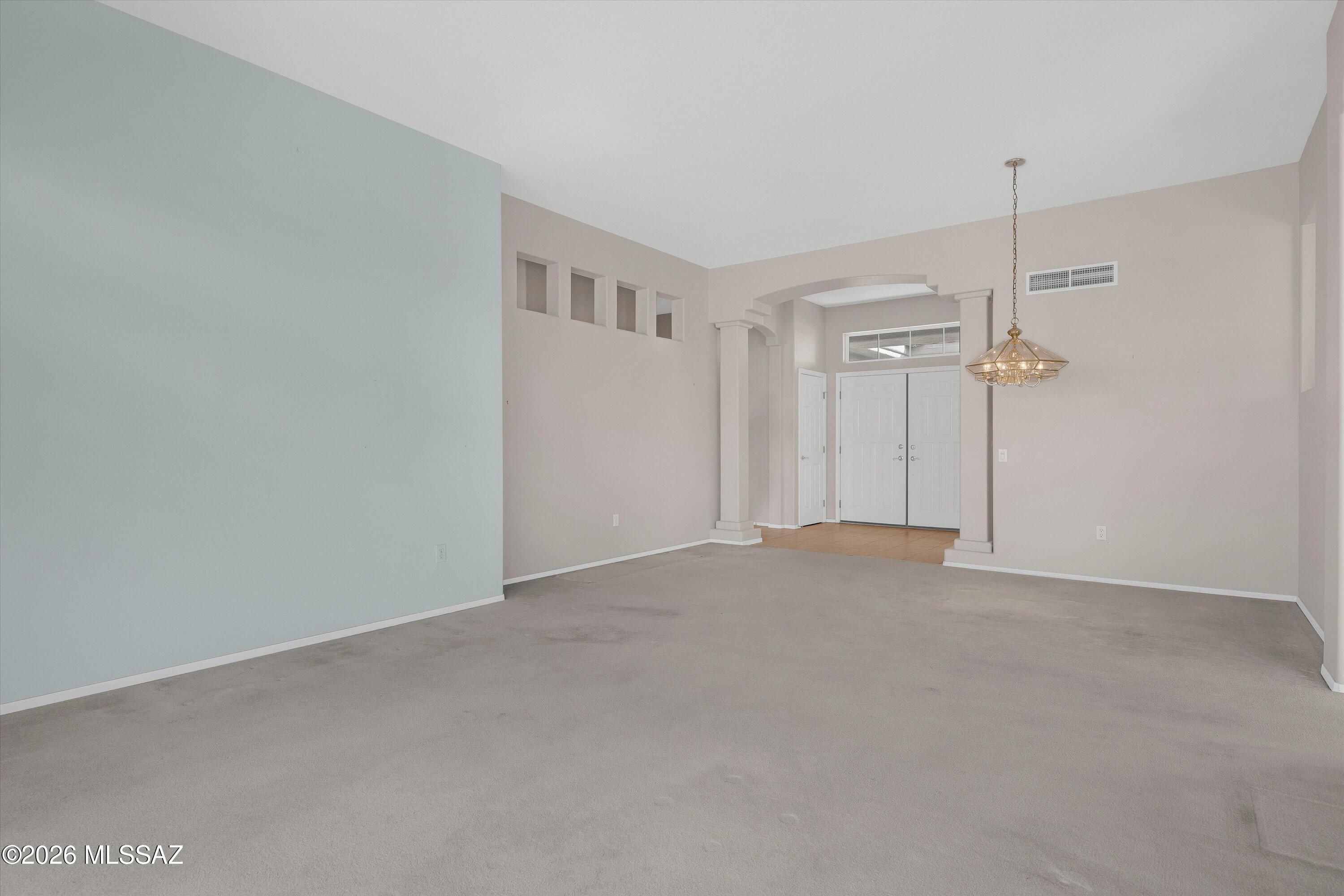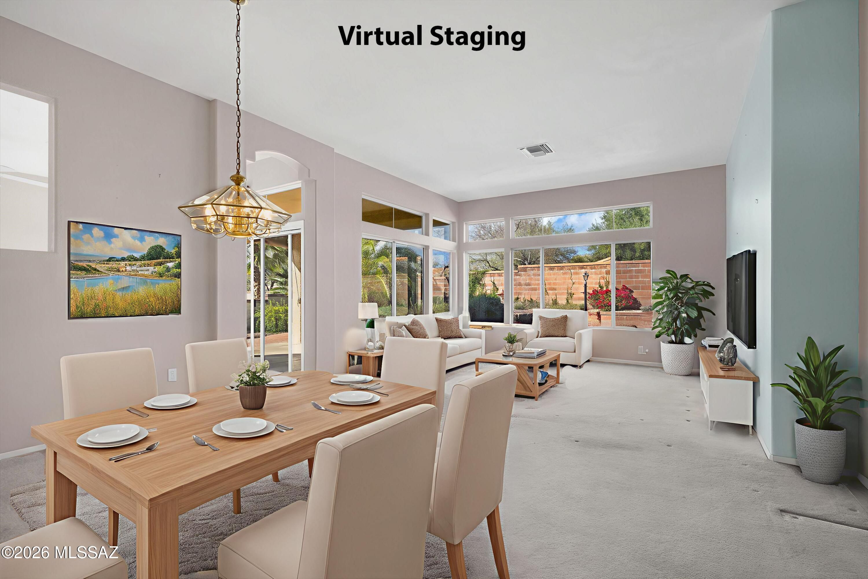 Located in the highly desirable Sun City Rancho Vistoso active adult community, this beautiful home will be hitting the market in late February. Residents enjoy a championship golf course, resort-style clubhouse, fitness center, walking trails, and a full calendar of social activities that define Arizona resort living. Inside, tall 10-foot ceilings enhance the open floor plan with a spacious kitchen featuring an island, stainless steel appliances, and 42-inch cabinets with roll-out shelving. The home offers both a formal living area and a family room with gas fireplace. The large primary suite includes a private door to the backyard and a spa-style bathroom with dual sinks, separate garden tub, and walk-in shower with seat. The private backyard offers a covered patio and extensive pavers