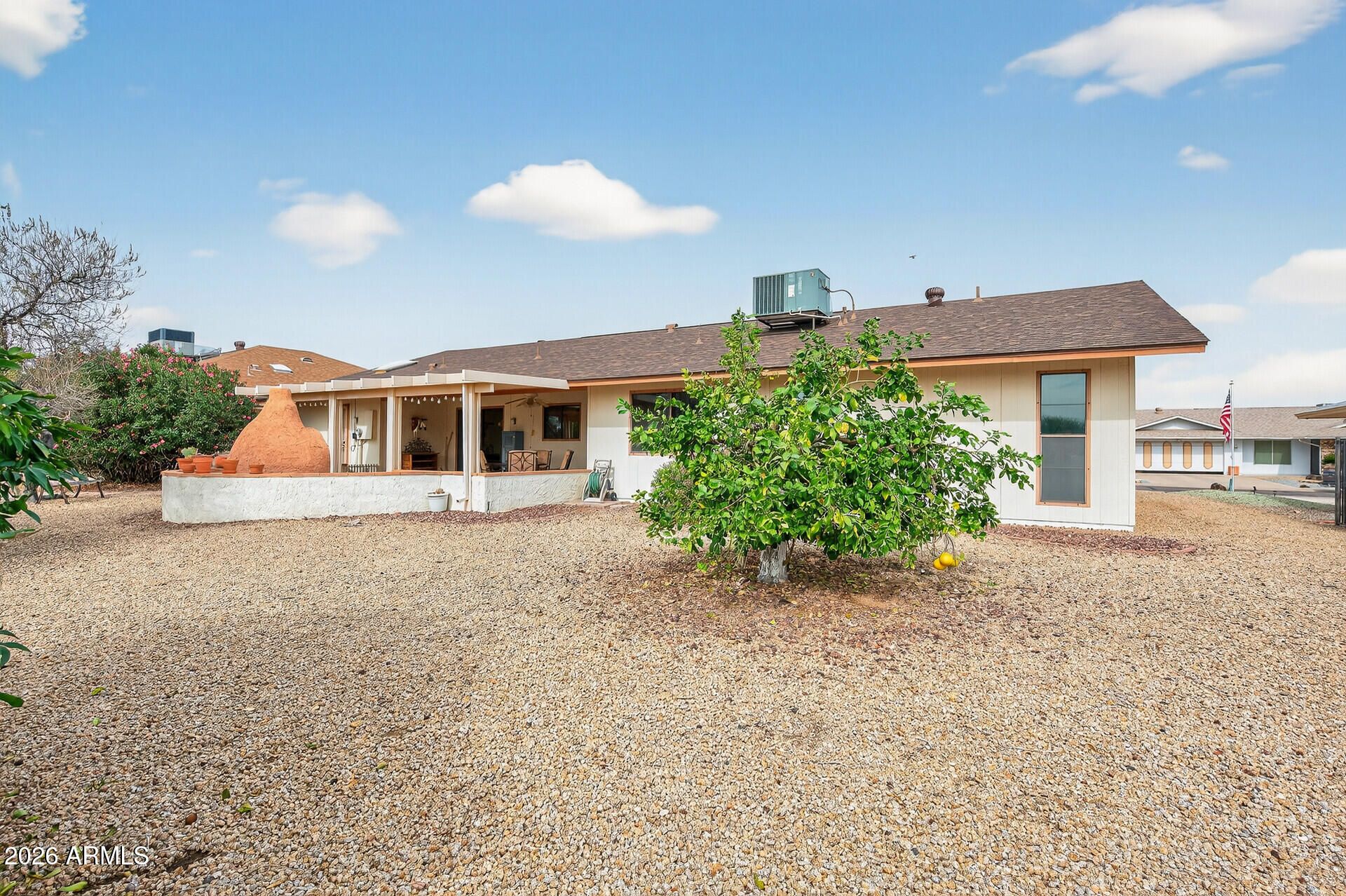 This Afton offers 1738 of interior square footage, a HUGE 10,901SF Pool-Sized lot, extended back patio and a ton of versatility. Gently lived in and cared for by part-time owners, the roof was replaced in 2025. Quiet location on a short interior street, preferred N/S orientation. this home feels very spacious with a large formal living/front room, dining room perfect for sit-down holiday gatherings, eat-in kitchen and BIG bedrooms both with walk-in closets. The extended back patio provides lots of outdoor living space. On chilly nights, light up the wood burning built in chiminea. The size of this back yard is ideal for a pool & spa. Currently landscaped with citrus trees and mature dessert foliage. Convenient inside laundry in a utility room large enough for an office/hobby area with built-in cabinets and storage. Extended garage with a work station for tools a wall of cabinets for storage - garage fridge included. GREAT SCW location, low taxes, no HOA and easy golf cart ride to rec centers/pools, pickleball, golf courses an shopping. The perfect SCW for those looking for value & versatility!