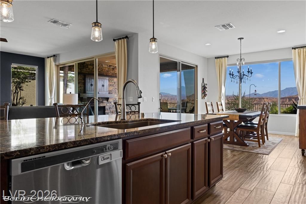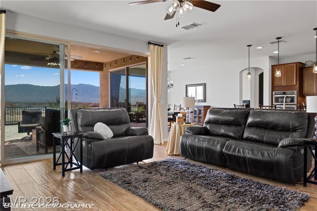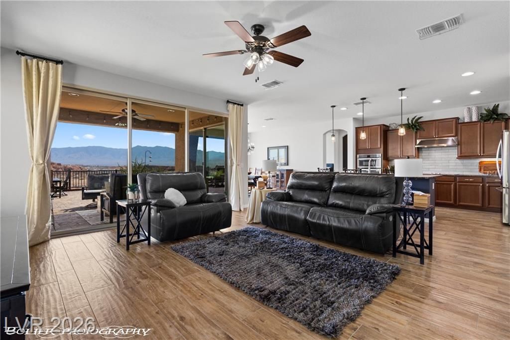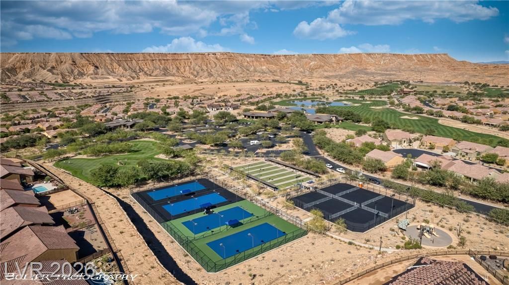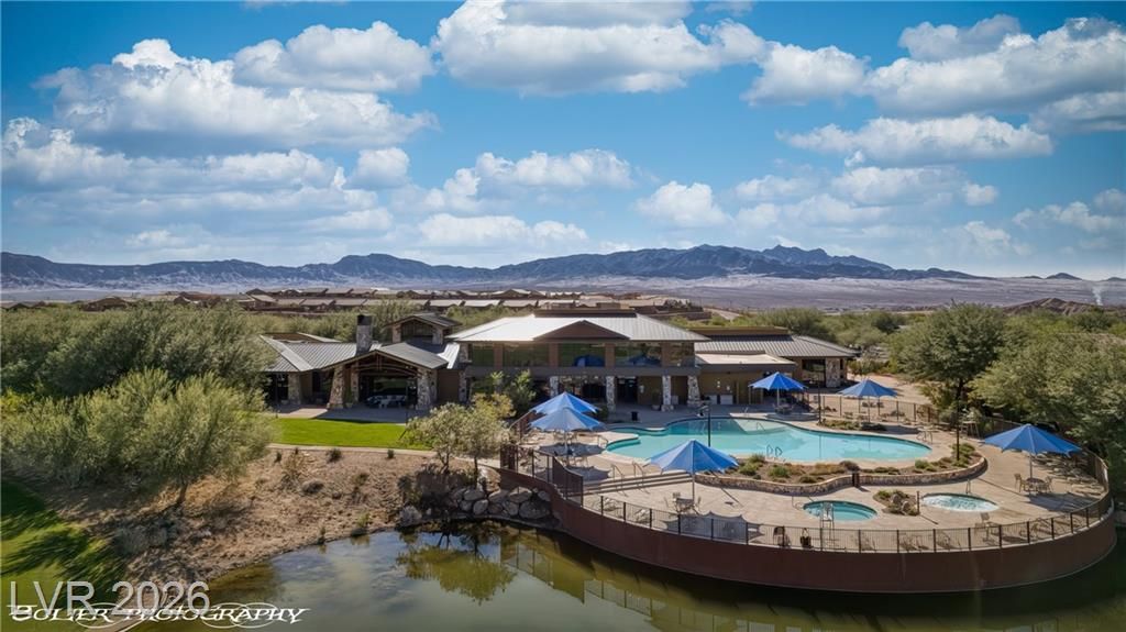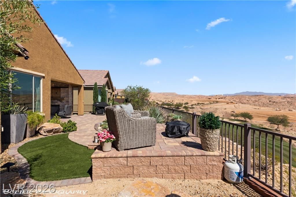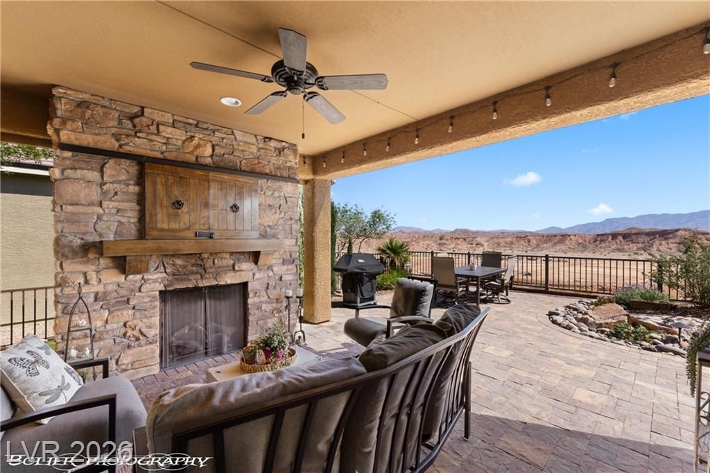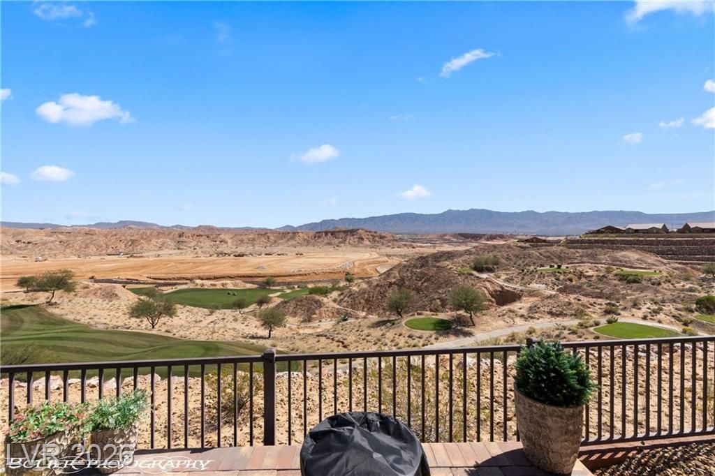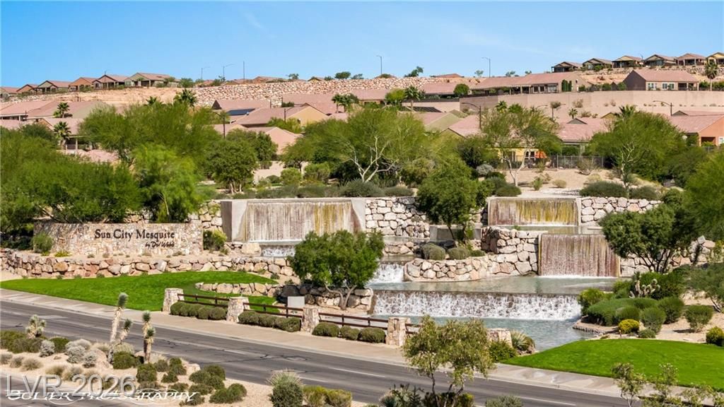 Welcome to 1262 Serenity Ridge in the premier 55+ Sun City Mesquite community. This rare elevated home captures panoramic views of the Conestoga Golf Course (holes 6–8), Virgin Mountains spanning NV, AZ, and UT, and stunning desert bluffs. Enjoy east-facing sunrises and shaded afternoons from a resort-style backyard featuring a raised viewing deck, custom propane fireplace, water feature, BBQ, turf, and SunBrite outdoor TV. Multi-panel sliders create seamless indoor-outdoor living. The move-in ready interior offers tile flooring, granite countertops, premium appliances, and custom drapery. Flexible layout includes two ensuite bedrooms—primary suite with views and custom closet, plus guest suite with Murphy bed ideal for office or visitors. Extended 6-ft garage with utility sink and golf cart space. Located in a low cost-of-living area with mild winters. SID paid in full.