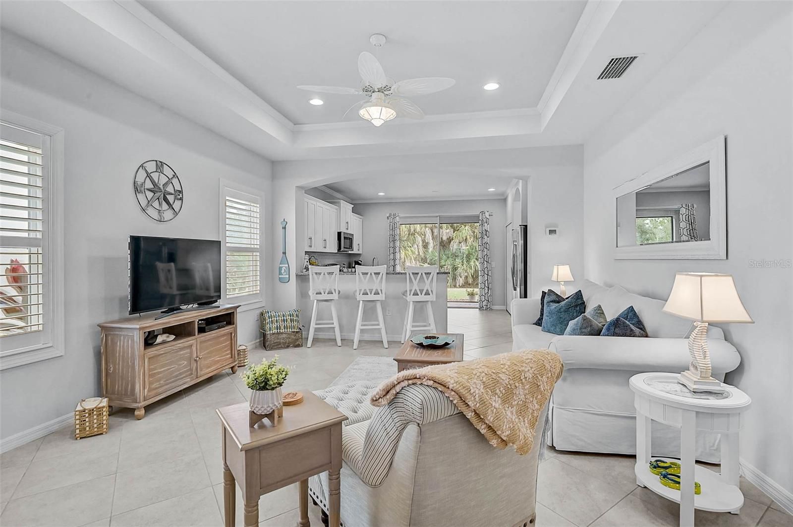 Experience the best of Florida living in this beautifully appointed Liberty 2 Tradition model, tucked away on a tranquil preserve lot within the award-winning, amenity-rich Grand Palm community in Venice, Florida. This meticulously maintained gently lived in 3-bedroom, 2-bath home offers the perfect balance of comfort, style, and privacy. Step inside to find elegant touches throughout, including crown molding and a coffered ceiling in the main living areas, plantation shutters throughout, recessed lighting, and stylish ceiling fans. The open-concept layout is ideal for both everyday living and entertaining. The kitchen is well-equipped for cooking and gathering, offering natural gas availability for those who prefer a chef-style experience. The primary suite provides a peaceful retreat, complete with double sinks, marble matte counters with drawer banks, and a spacious walk-in shower. Additional thoughtful upgrades include a utility sink in the garage and pull-down attic stairs for extra storage convenience. Relax outdoors on the screened lanai overlooking lush preserve views — a serene setting to enjoy morning coffee, evening sunsets, and the Florida lifestyle year-round. Enhanced landscaping adds curb appeal and a warm welcome from the moment you arrive. Located in unincorporated Sarasota County with lower taxes and CDD fees, this home offers incredible value in a resort-style setting. Grand Palm invites residents to live life to the fullest with miles of scenic trails, multiple pools including a waterslide, fitness facilities, pickleball, tennis, bocce, basketball, volleyball, dog parks, a splash park, and the breathtaking Adventure Lake with Lookout Point Island — perfect for kayaking, fishing, and embracing nature. Situated in the heart of Venice, you’ll enjoy quick access to I-75, downtown Venice, Sarasota, beautiful Gulf beaches, shopping, dining, top medical facilities, golf courses, and CoolToday Park — home of the Atlanta Braves Spring Training. Move-in ready and surrounded by unmatched amenities, this home is the opportunity you’ve been waiting for. The seller is providing a home warranty for peace of mind! Schedule your private showing today!