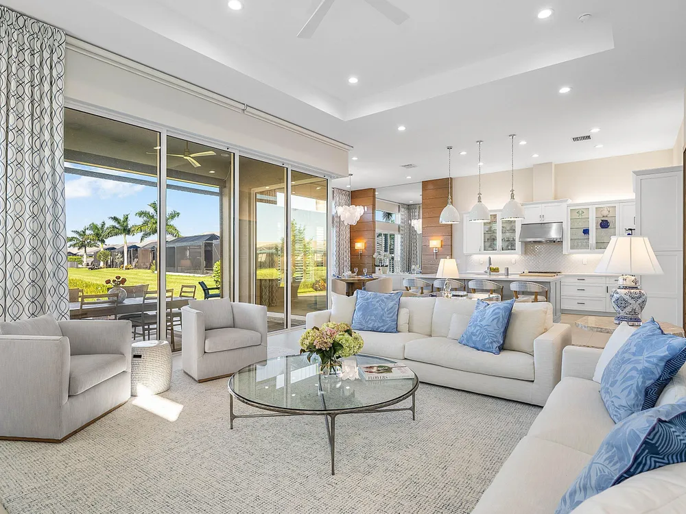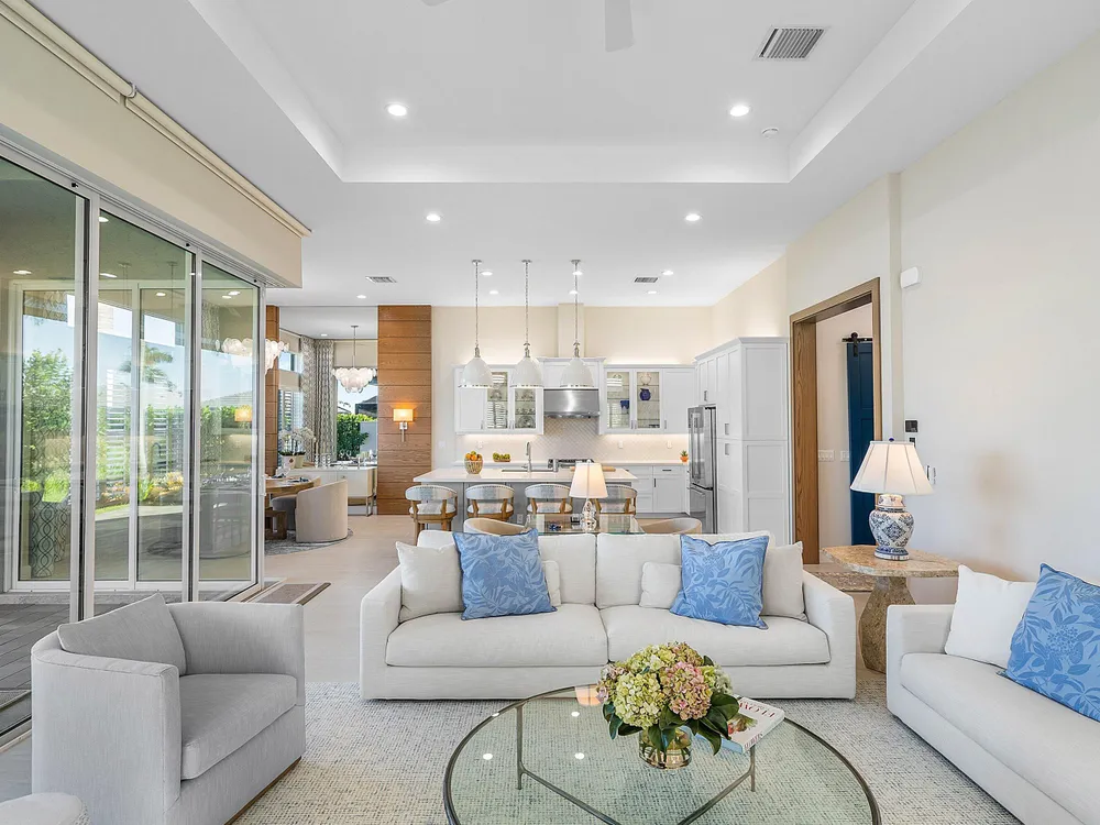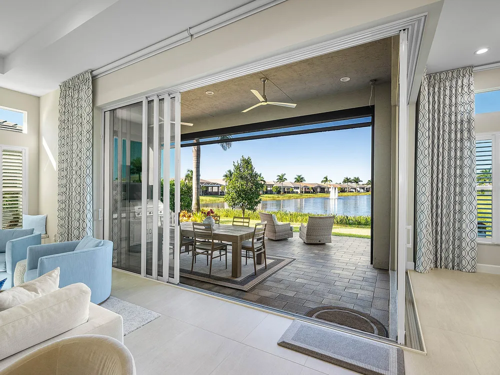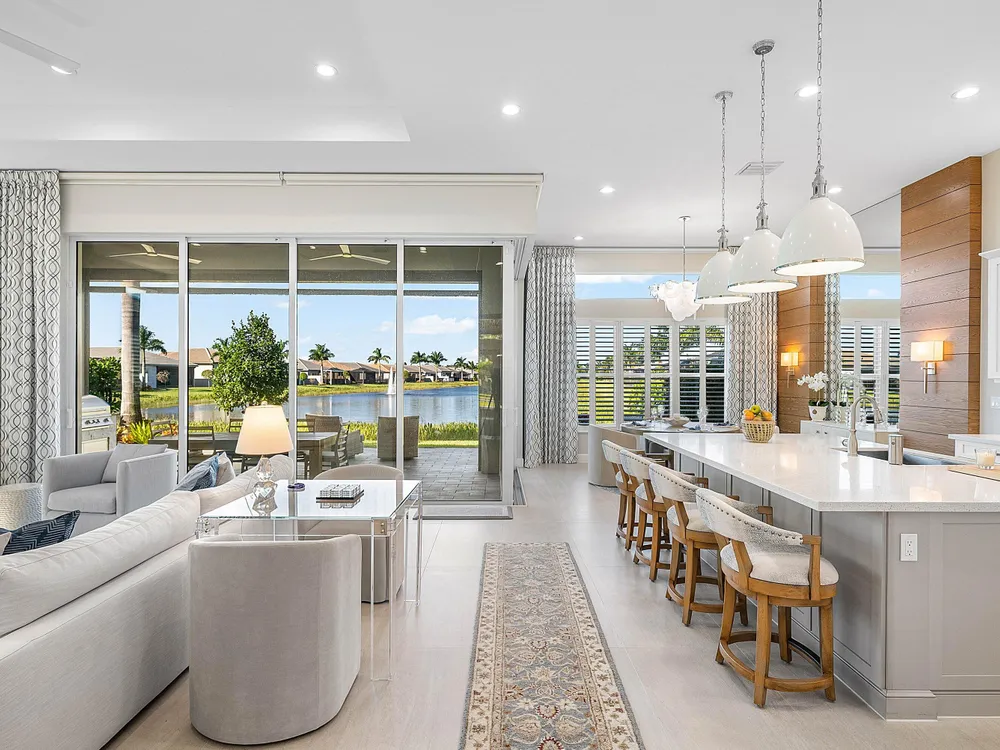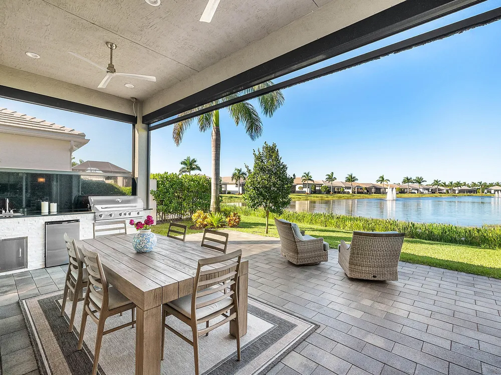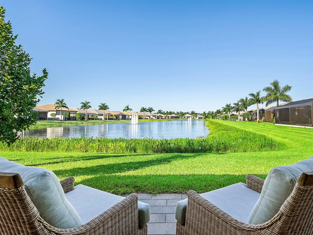 Situated in the distinguished 55+ gated community of Valencia Sound in Boynton Beach, this Aruba model comes with DESIGNER FURNITURE INCLUDED! The home offers 2 bedrooms plus a den, 2 full baths, with professional designed upscale interior and exterior finishes. It includes a whole-house generator, designer Serene & Lily light fixtures, retractable blinds with Phantom screens, decorative accent woodwork walls, and a summer kitchen overlooking a long lake view. The home is also built with impact windows for added safety and durability.As a resident of Valencia Sound, you gain access to all of its resort-style amenities: a 38,000+ square foot clubhouse featuring a full-service restaurant, sports lounge, ballroom with stage, cooking studio!