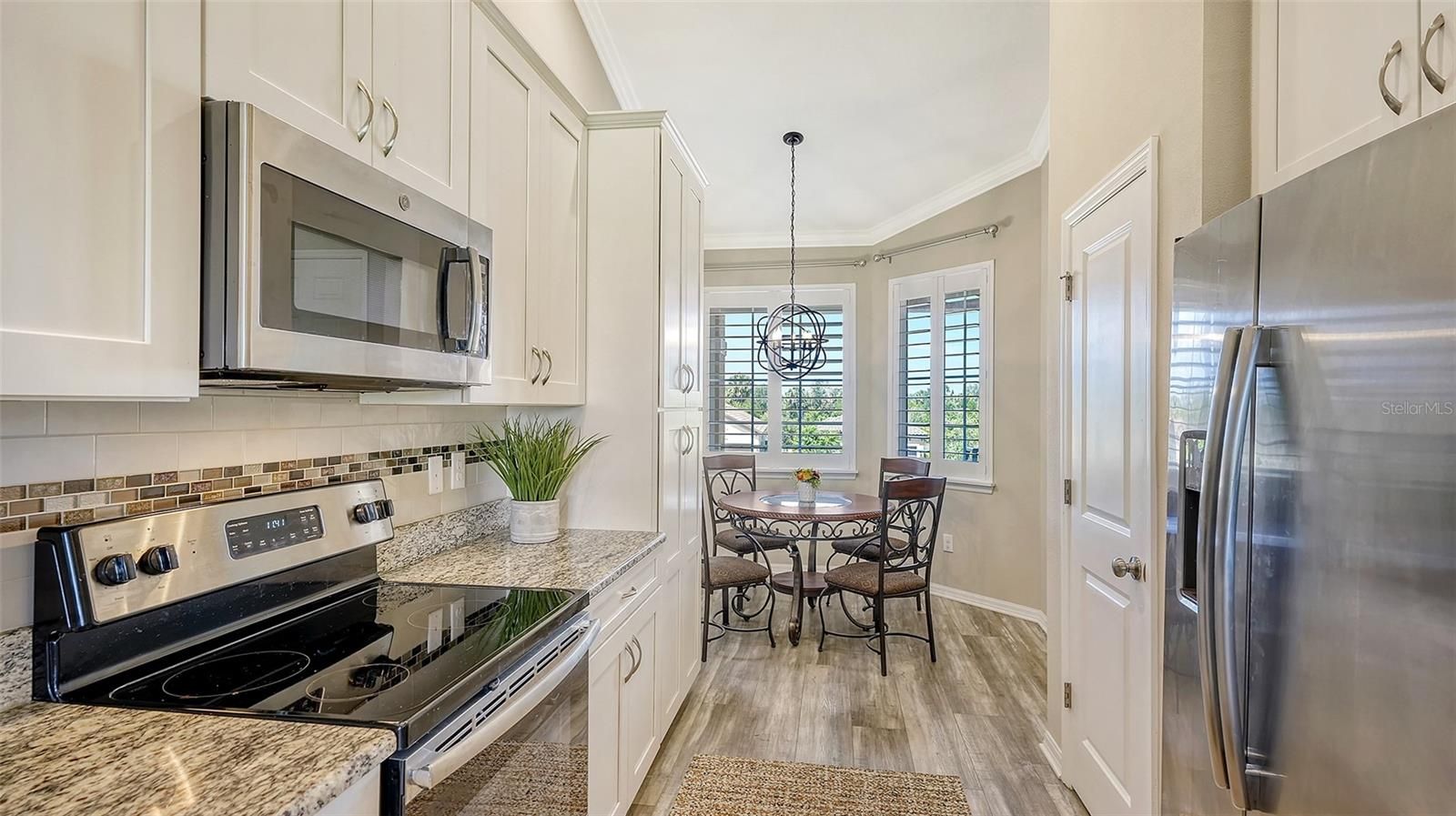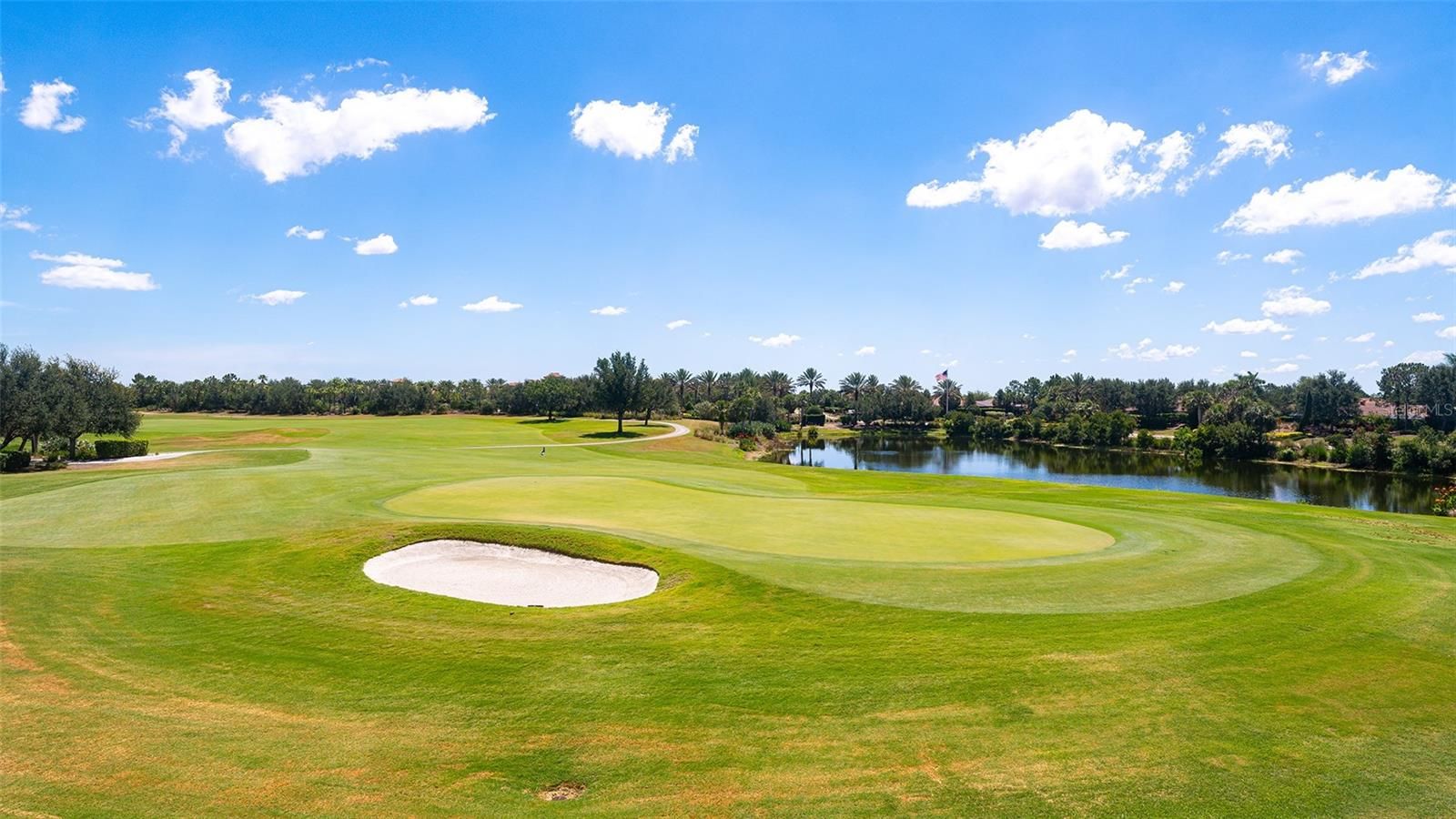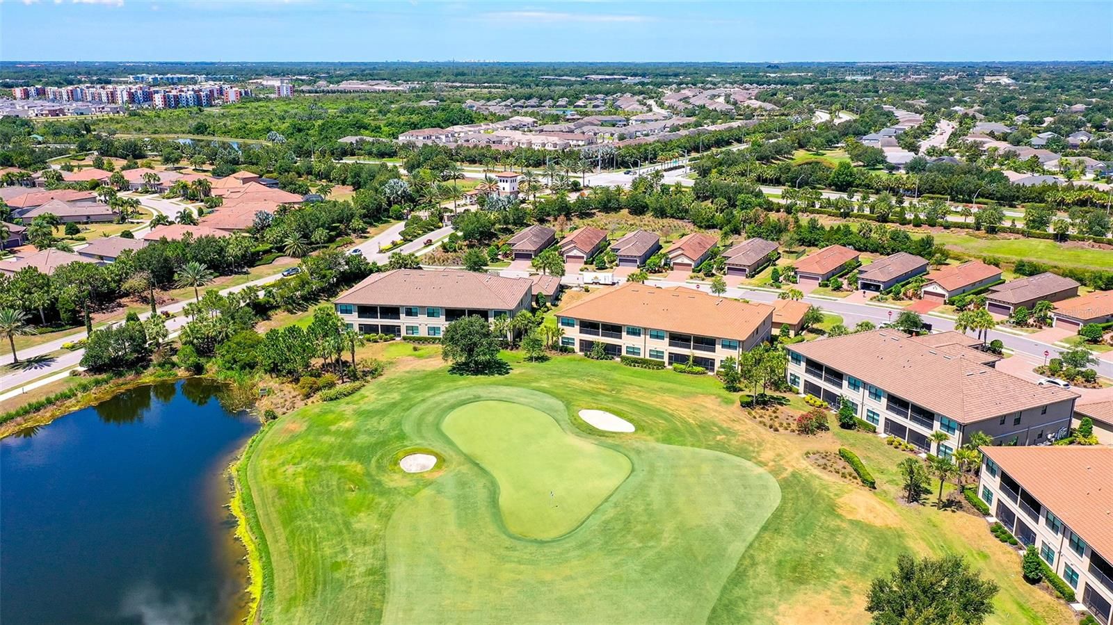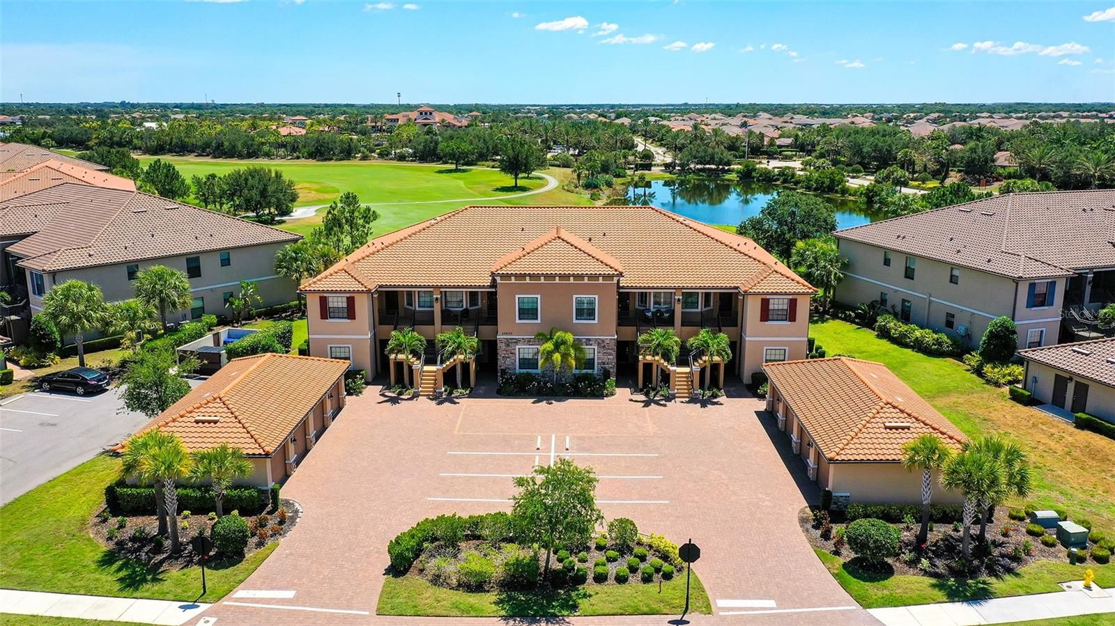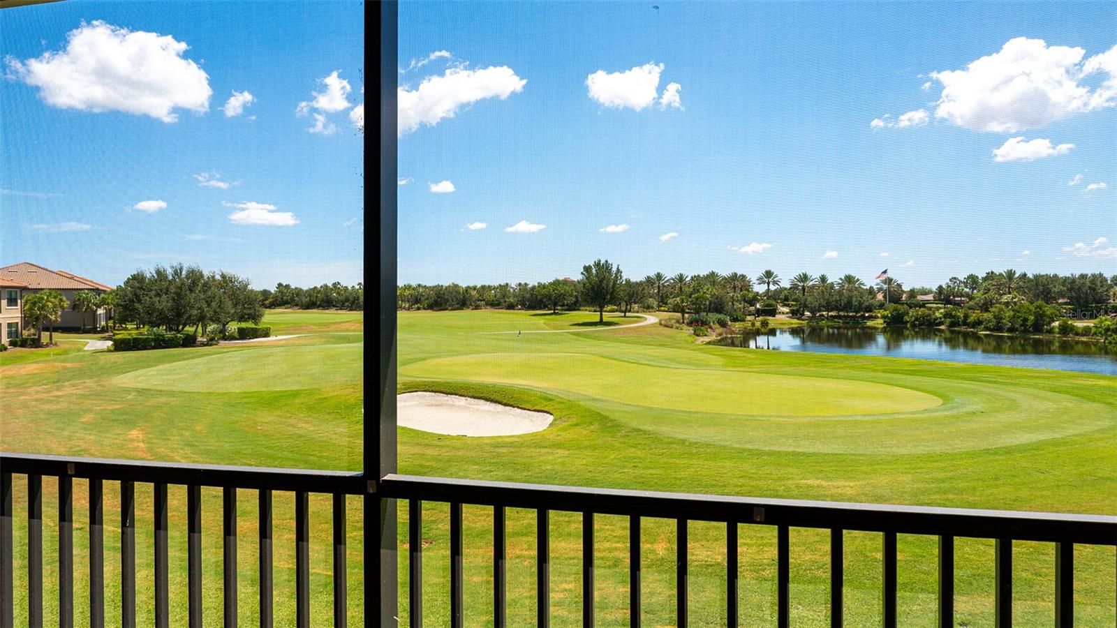 A beautiful second–floor condominium in Esplanade Golf and Country Club awaits you with spectacular views of the pristine 10th green and a surrounding sparkling pond. Enjoy resort-style amenities and a deeded full golf membership as you begin living your best life in this vibrant community. Soaring vaulted ceilings and the open floor-plan provide a feeling of spaciousness, as well as a warm and inviting ambiance for relaxation and the enjoyment of friends and family.. Recently installed luxury vinyl plank flooring in the main areas is a fantastic upgrade, as is the tall column of matching white kitchen cabinetry that enlarges the eat -in kitchen as well as providing additional storage. A breakfast nook with plantation shutters overlooks the front porch, an ideal place for taking in the colorful sunsets. The primary bedroom is en-suite with dual sinks, two walk-in closets, a large walk-in shower, and white plantation shutters. The guest bedroom also showcases plantation shutters and can accommodate a king bed. Stacking sliding doors open to the covered, screened lanai which provide the ideal spot for enjoying a coffee while watching the sunrise over the long, sweeping views of the 10th fairway and sparkling pond. A one-car garage and a parking space is included. You can experience all the advantages of the Lakewood Ranch lifestyle while enjoying the unmatched Esplanade amenities such as the 18-hole championship golf course, eight Har-Tru lighted tennis courts and eight lighted pickleball courts, bocce ball, two large resort-style pools, one with a walking resistance pool and the other with a hot tub. Two clubhouses are outfitted with fitness centers and offer an array of options including fitness classes, card games, hobby rooms, the Koquina Sand Spa, and rooms for private parties. Lakewood Ranch is the top-selling planned community in the nation. Come and live your best life!