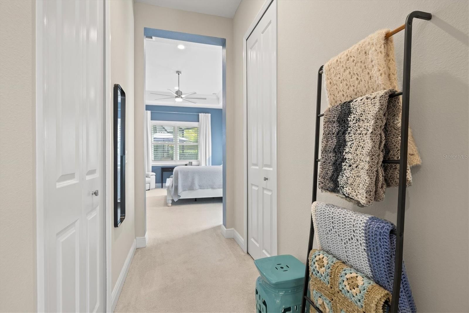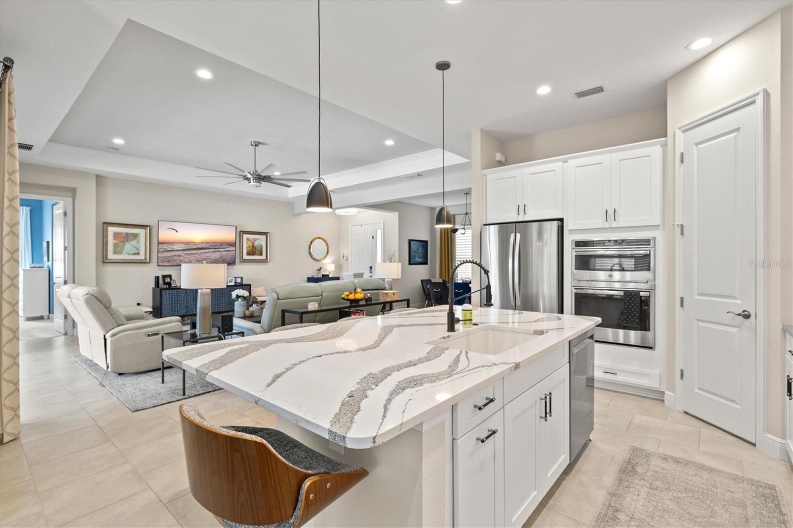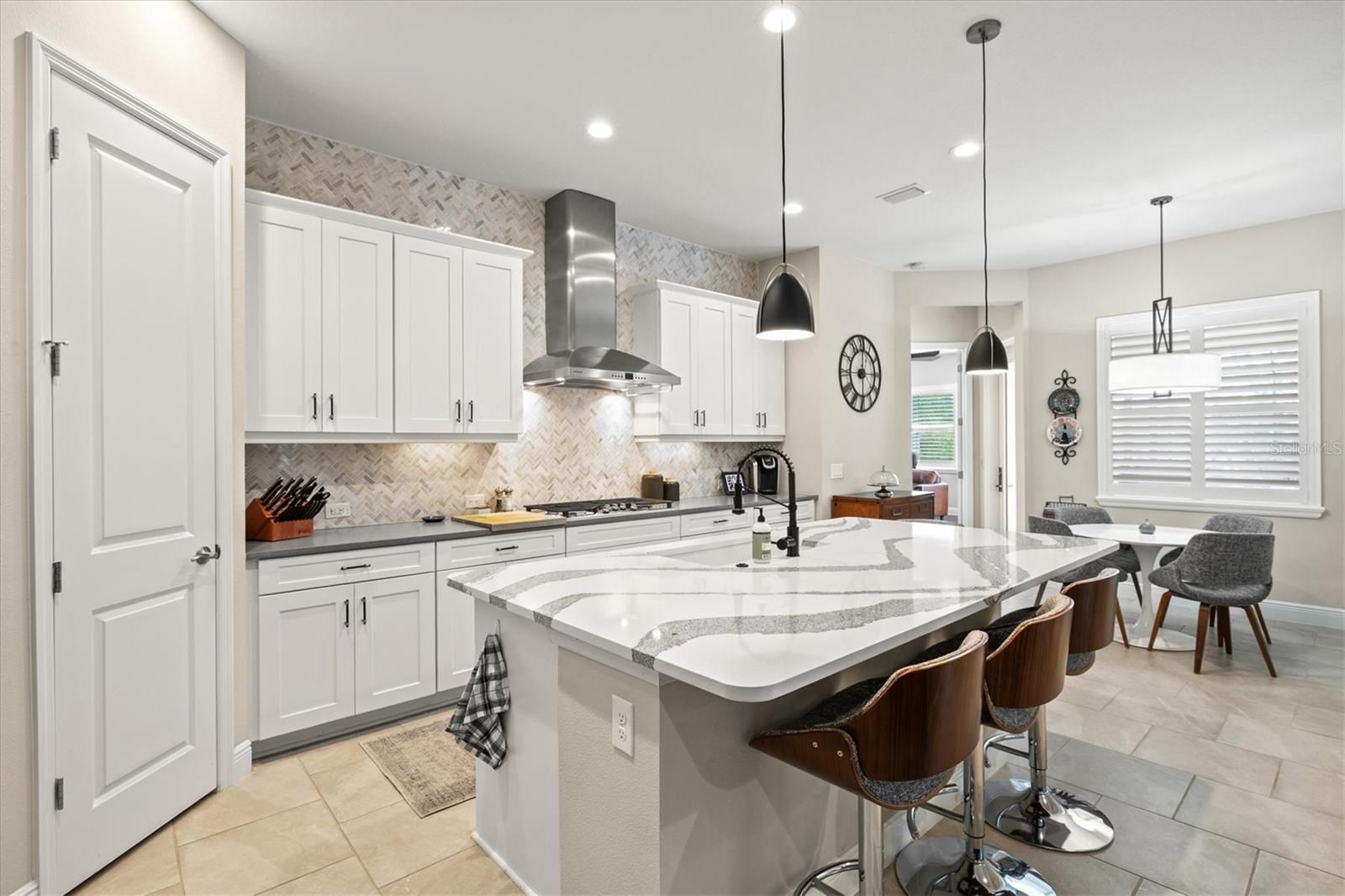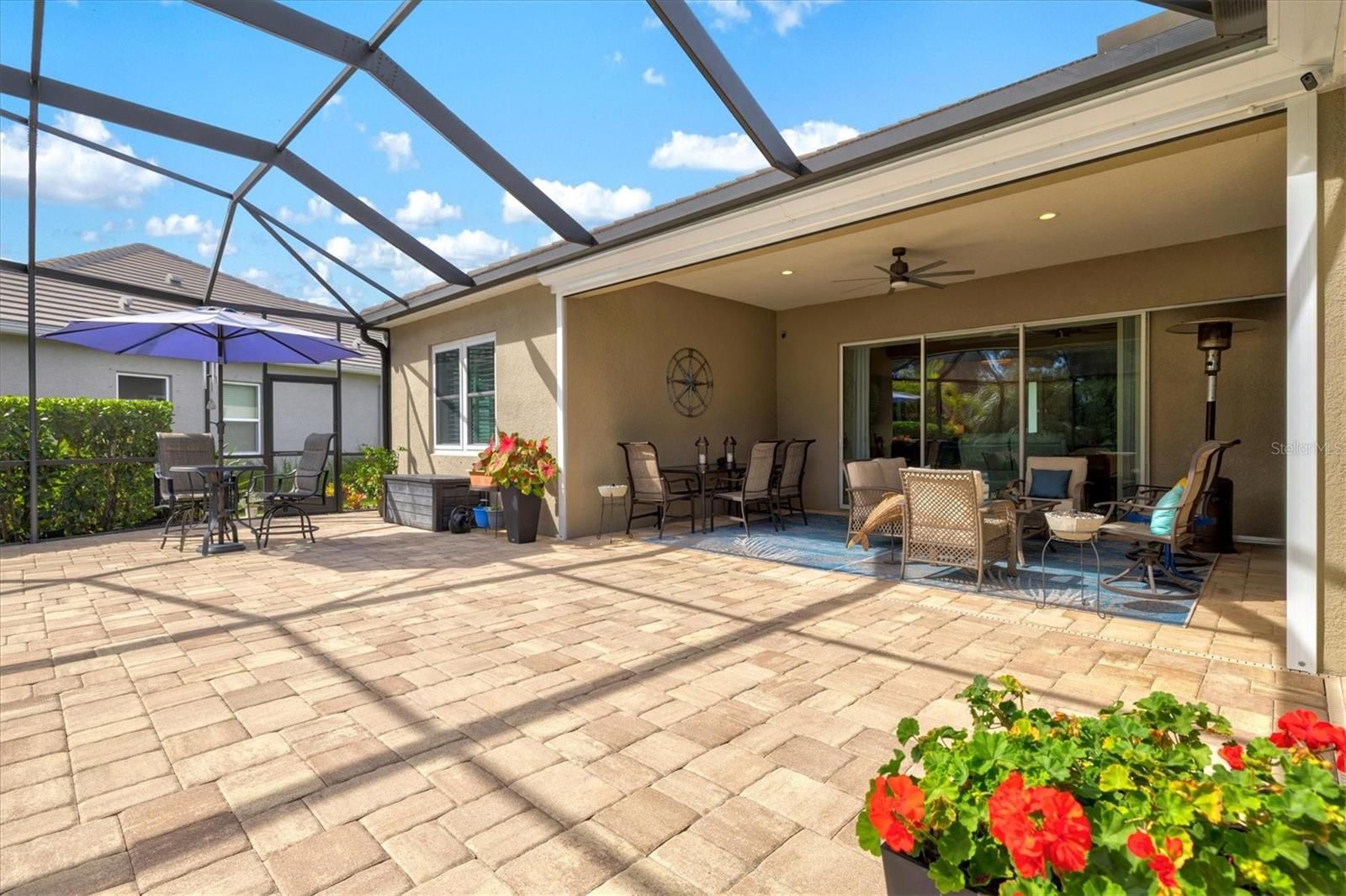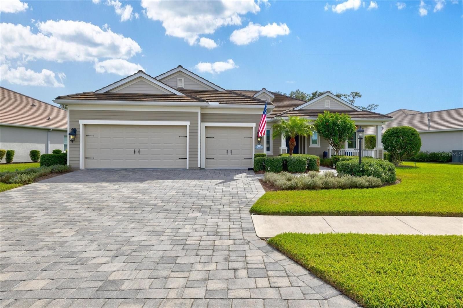 Welcome to Grand Palm, a premier resort-style, natural gas community just minutes from Historic Downtown Venice, Gulf beaches, Wellen Park, and I-75. This original-owner home sits on an oversized, private lot and is not in a flood zone. One of Neal Communities’ most desired floor plans, the Sanibel, offers just over 2,500 interior square feet and 3,883 total square feet under roof, featuring three bedrooms, three full bathrooms, and a club room or den with an open and functional design. Curb appeal stands out with beautiful landscaping, a paver driveway and walkway, a covered front porch sitting area, a tile roof, and perfectly manicured grounds. Inside, the gourmet kitchen showcases quartz countertops, a tile backsplash, 42-inch shaker cabinets, soft-close drawers, pull-out shelving, a natural gas range with stainless vent hood, convection oven, motion-activated faucet, stainless steel appliances, and a walk-in pantry with custom shelving. The spacious primary suite features two large walk-in closets, dual vanities, a soaking tub, a walk-in shower, and elegant finishes. Custom closets are found throughout the home, including the pantry, providing exceptional organization and storage. Step outside to your private outdoor retreat featuring a fully screened lanai built in 2020 with a custom WaterScapes pool and spa, both gas heated and surrounded by pavers, overlooking a peaceful preserve and pond with mature landscaping that provides complete privacy. The lanai is also plumbed for an outdoor kitchen, perfect for entertaining or relaxing with your morning coffee. Additional highlights include plantation shutters, custom window treatments, roller and accordion blinds, ceramic tile flooring, engineered hardwood in the den, overhead storage in the three-car garage, new hurricane-impact windows, power Kevlar storm screens on the lanai, and a whole-house natural gas generator. This home has been impeccably maintained and is move-in ready, offering the perfect blend of luxury, comfort, and peace of mind. Residents enjoy a vibrant, amenity-rich community with a fitness center, dog park, splash pad, tennis, pickleball, bocce, volleyball, kayaking, fishing, and miles of walking and biking trails. The on-site activities director plans regular events including live music, food trucks, trivia nights, and movie nights, creating a true sense of connection and fun.