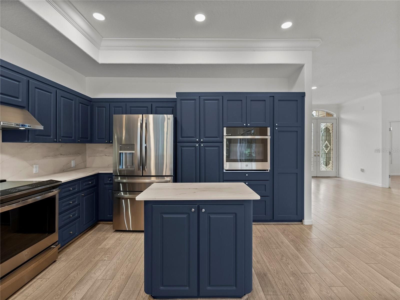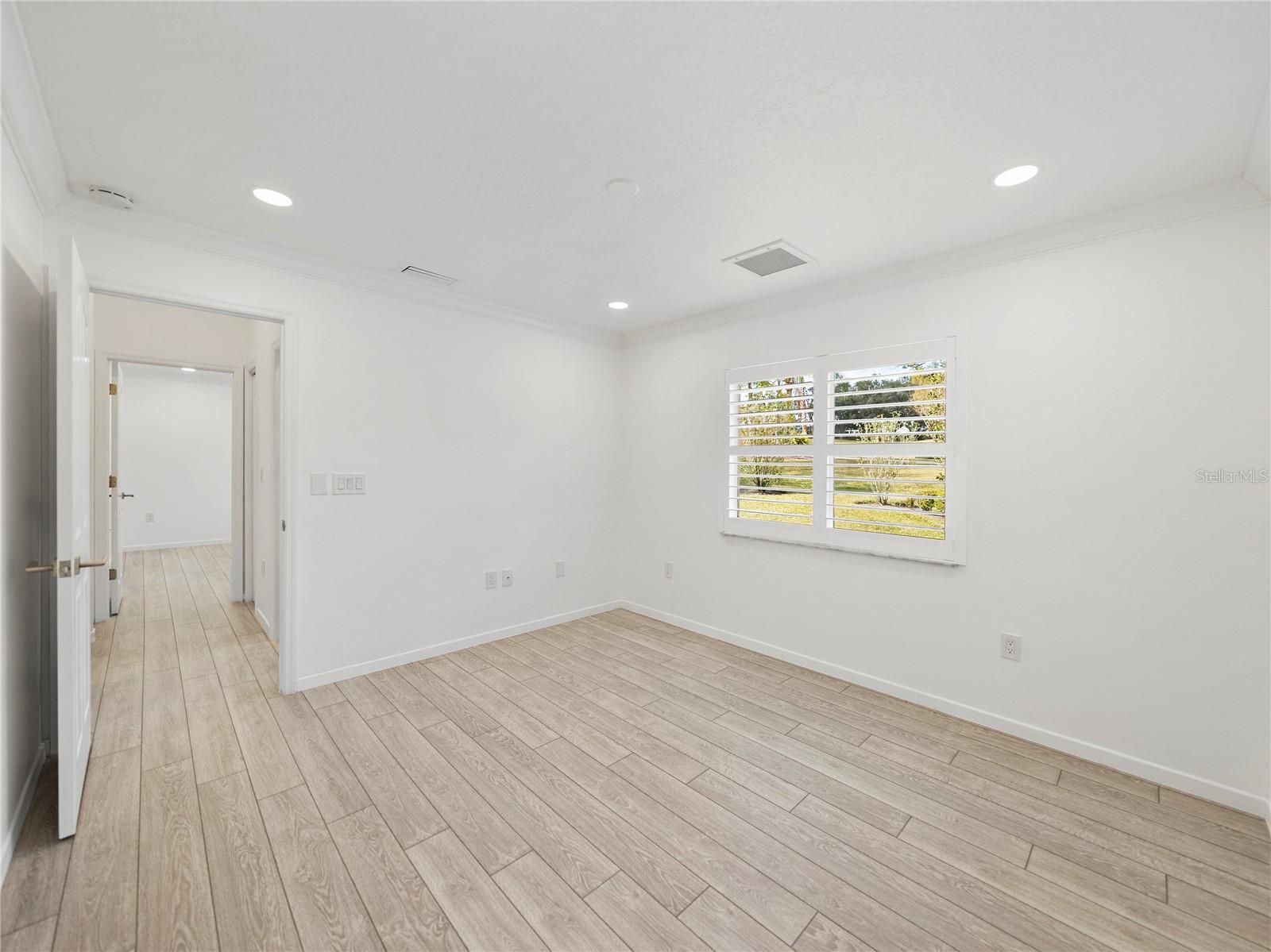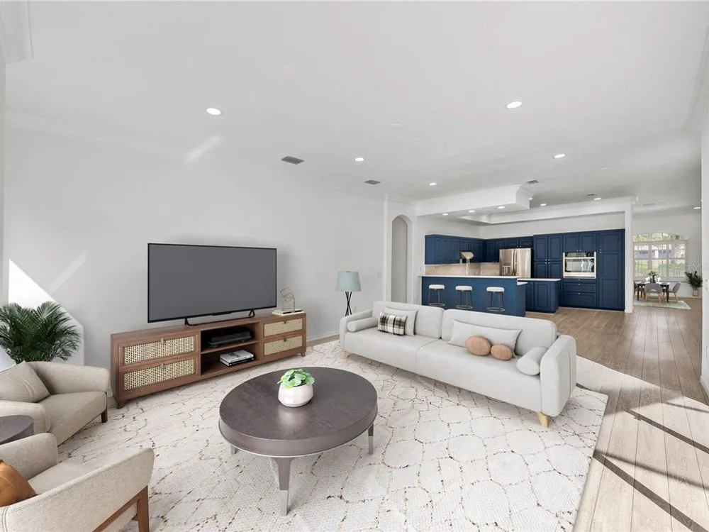 - Crown Molding, Eat-in Kitchen, High Ceilings, Kitchen/Family Room Combo, Living/Dining Room, Open Floorplan, Main Level Primary, Solid-Wood Cabinets, Split Bedrooms, Stone Counters, Walk-In Closet(s)