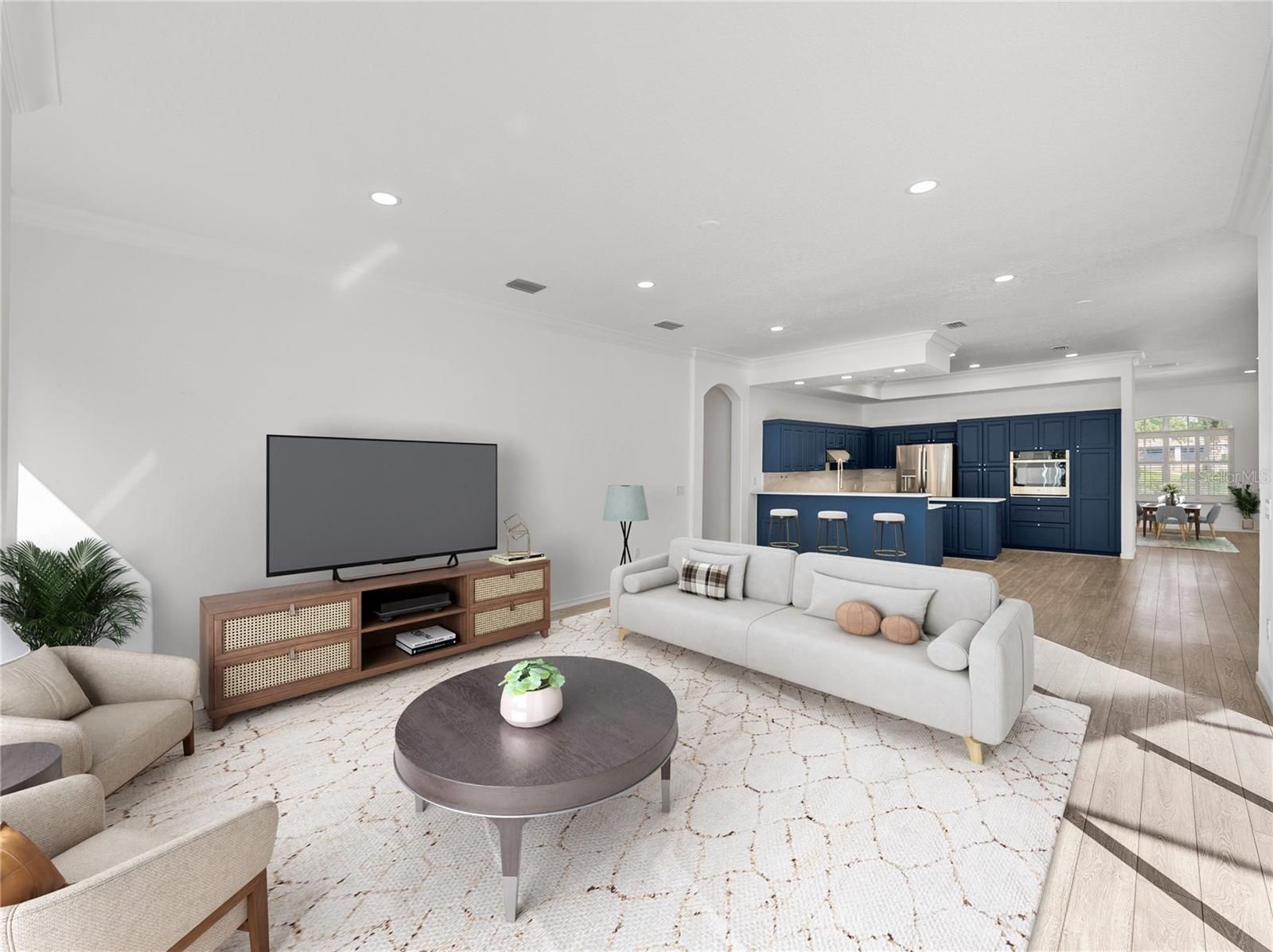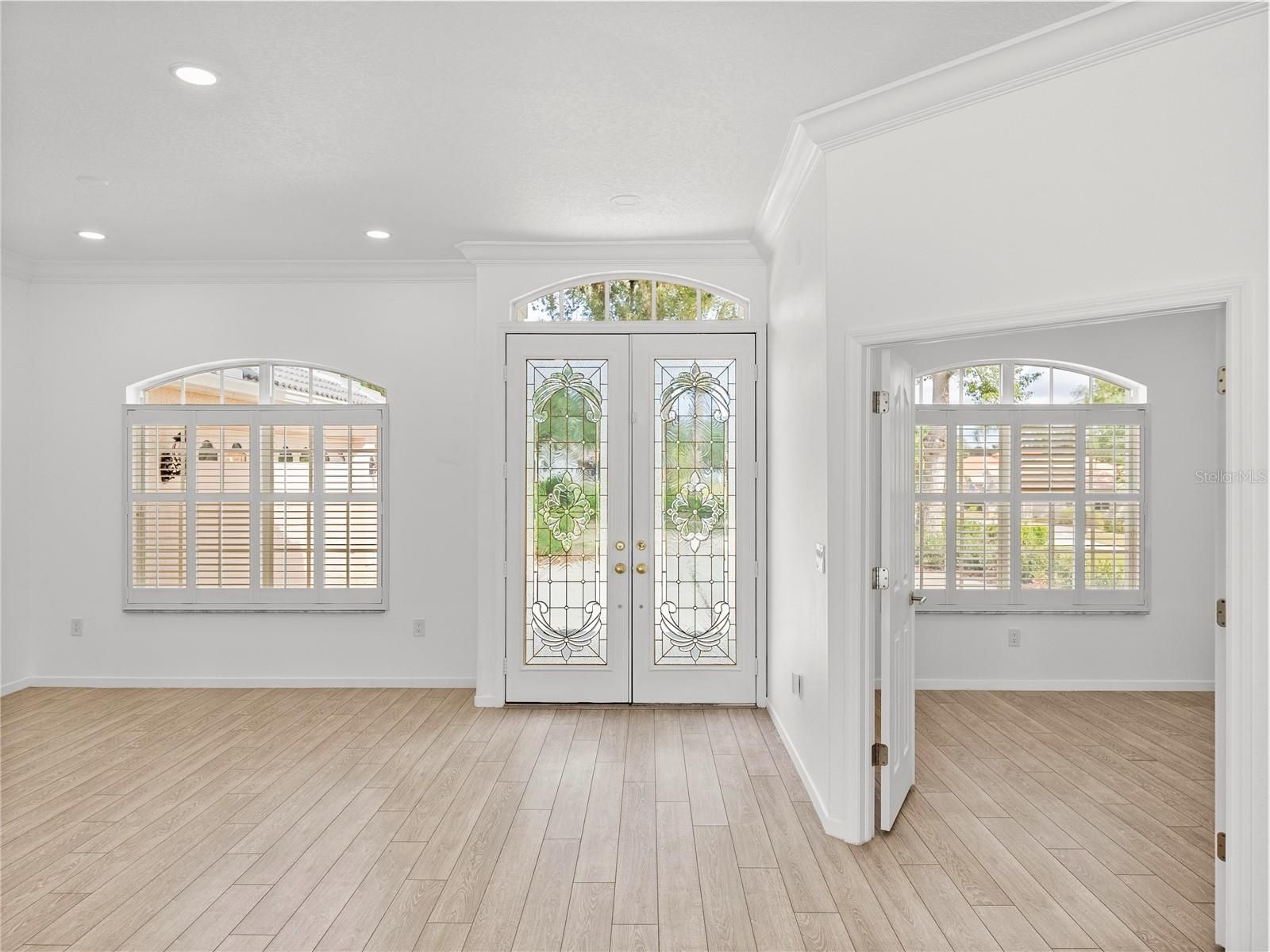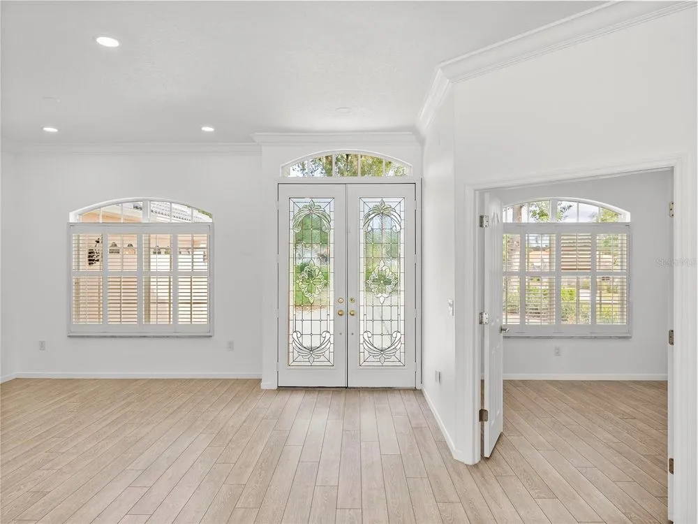 - Crown Molding, Eat-in Kitchen, High Ceilings, Kitchen/Family Room Combo, Living/Dining Room, Open Floorplan, Main Level Primary, Solid-Wood Cabinets, Split Bedrooms, Stone Counters, Walk-In Closet(s)