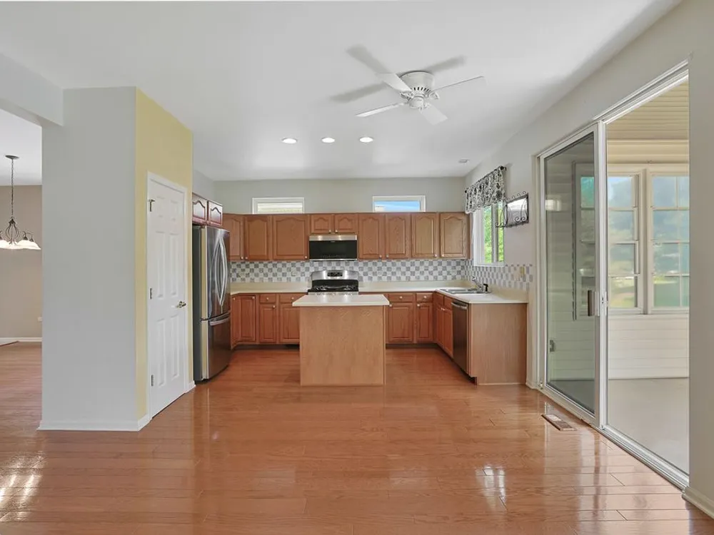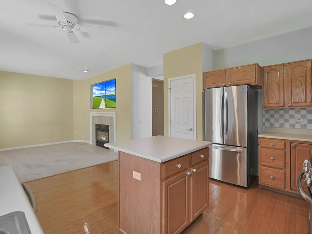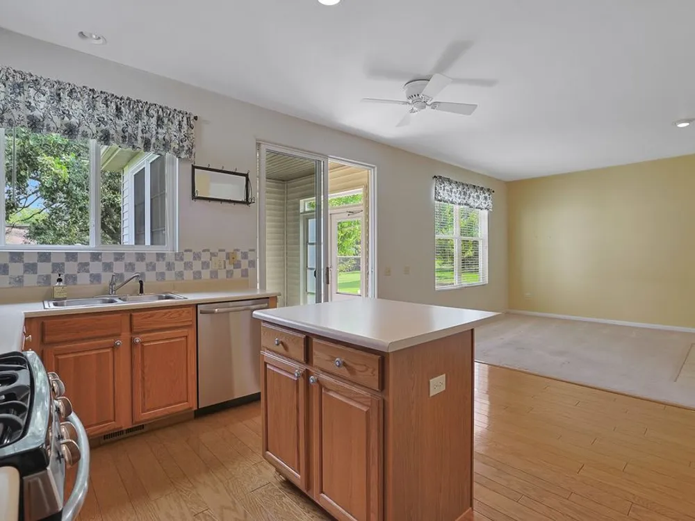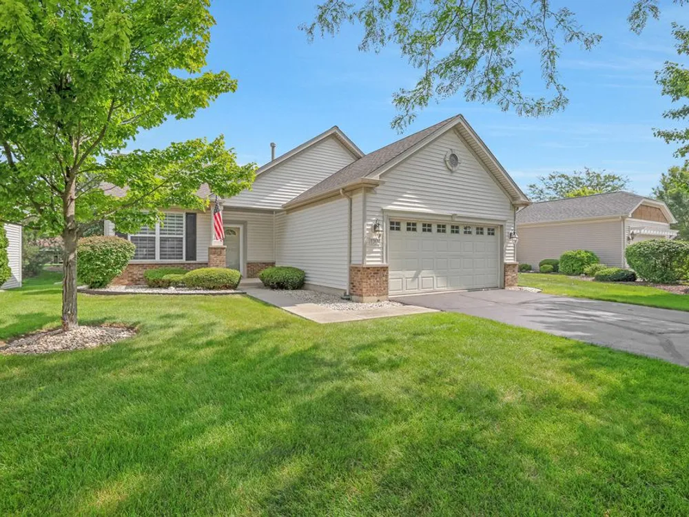 Del Webb original Manistee. One owner. Includes 3 season room off kitchen. Newer roof, furnace,A/C. Hot water heater and garbage disposal. Wood laminate floor in walkway in Living and Dining areas, and in kitchen. Newer Stainless steel in kitchen. Newer washer & dryer 2021, Fireplace in family room. 75" OLED TV in family room (on wall) to remain with home. Porch at front, Enlarged Paver patio in back.Large back yard with berm. Home has been well cared for but is being offered AS-IS. Easy access to Rt. 47 and 90. Come enjoy life at Del Webb over 55 community, Show with confidence.