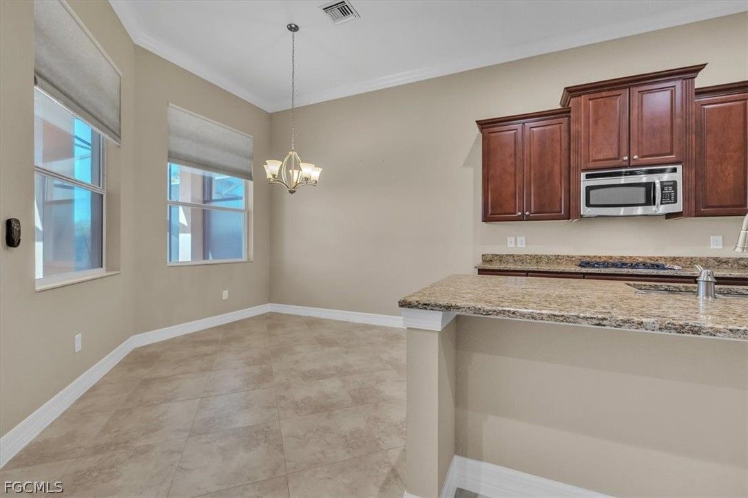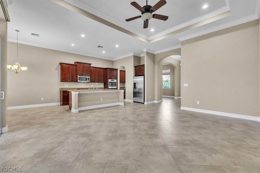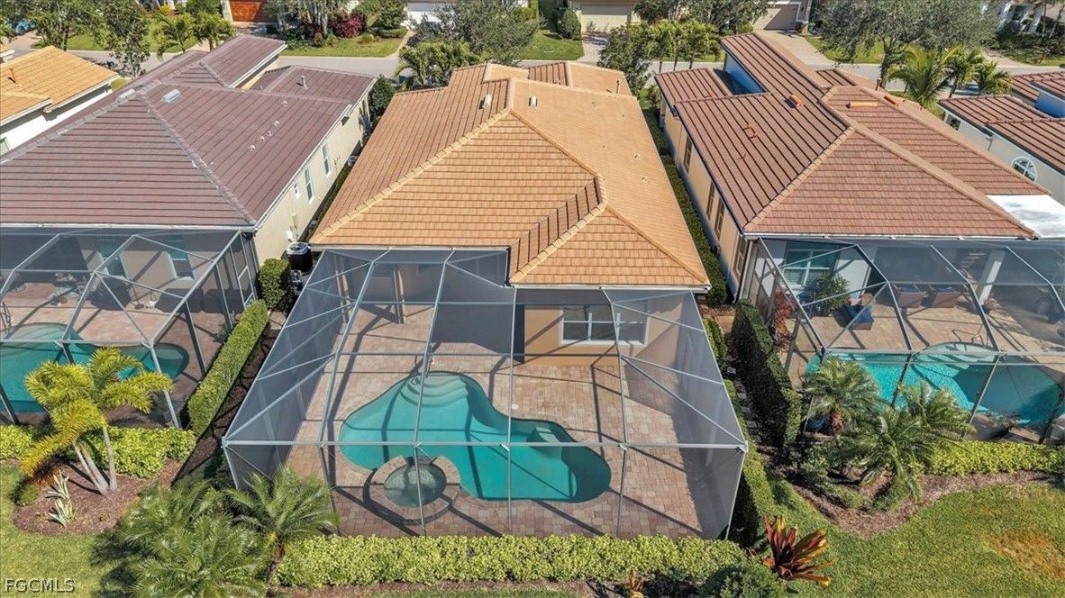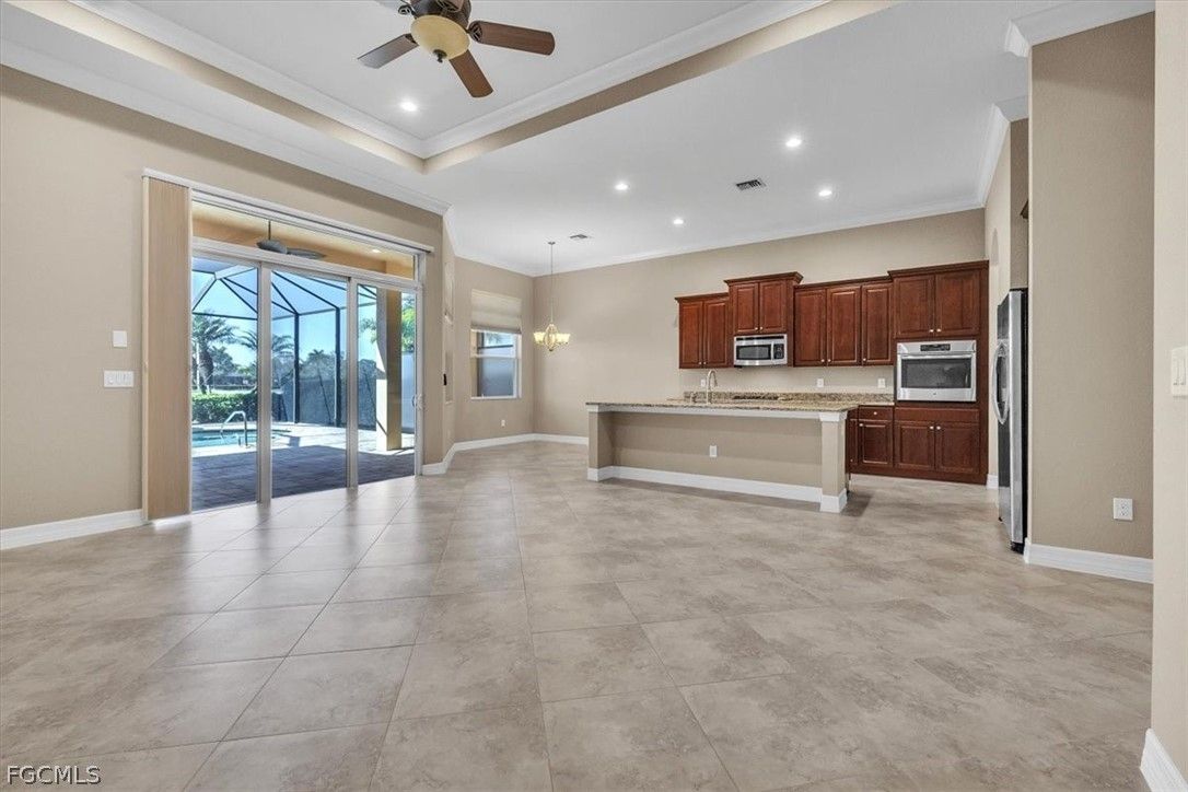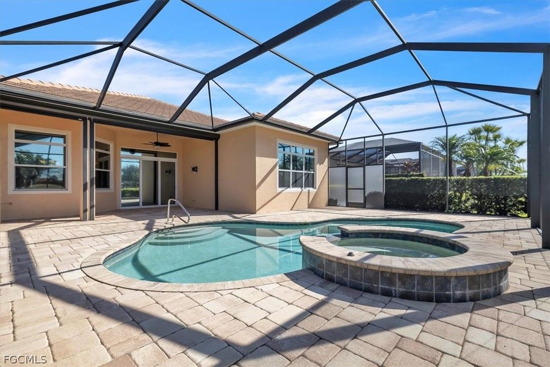 Come and see this stunning 3-bedroom, 2.5-bathroom, a formal dining room adjacent to the kitchen that can be converted into a sitting area or den; home boasting 2020 sq. ft. of living space. The Anna model, built by Kolter, is located in the highly sought-after Gated Verandah Community. From the moment you drive up to the stone front elevation, you will be captivated by the beauty of this home. Upon entering, you are welcomed by a spacious foyer leading to a large dining room with a butler's pantry adjacent to the kitchen. The open floor plan flows seamlessly into the family room and kitchen area. The kitchen is equipped with ample cooking space, granite countertops, large cabinets, and a nearby pantry. The breakfast nook offers a breathtaking view of the Golf course, creating a cozy atmosphere. The primary bedroom, located off the family room, overlooks the Golf Course and features dual closets, dual sinks one with a vanity, a separate shower and tub, and plenty of natural light. The guest bedrooms are well-sized and separated from the master suite for added privacy. This home boasts 14-foot high ceilings with crown molding, elegant tray ceilings in the main living areas and primary bedroom, diagonal tile flooring throughout, and newly installed LVP flooring in all bedrooms. It also includes impact glass windows and doors with electric storm shutters in the lanai area. The appliances are newer, with the AC replaced in '21 and the pool heater in '23. The outdoor space offers ample room under roof for relaxing with family and friends and also has several other areas for sunbathing or sitting in the lanai. The saltwater heated pool and spa provide a stunning view of the Golf Course, #11 on Whispering Oaks while maintaining privacy from cart and golfer traffic. Verandah is a vibrant community with 36 holes of Championship Golf designed by Bob Cupp and Jack Nicklaus, a fitness center, tennis courts, pickleball, bocce, kayaks, playground, dog park, 9 miles of walking and jogging paths, multiple restaurants one of which has a view of the Orange River, and an active social and event calendar that can satisfy everyone's needs. Rarely do homes of this caliber become available in such a desirable neighborhood and community at such an attractive price. Don't miss this opportunity to secure your place in Paradise. Come and see it before it's gone.