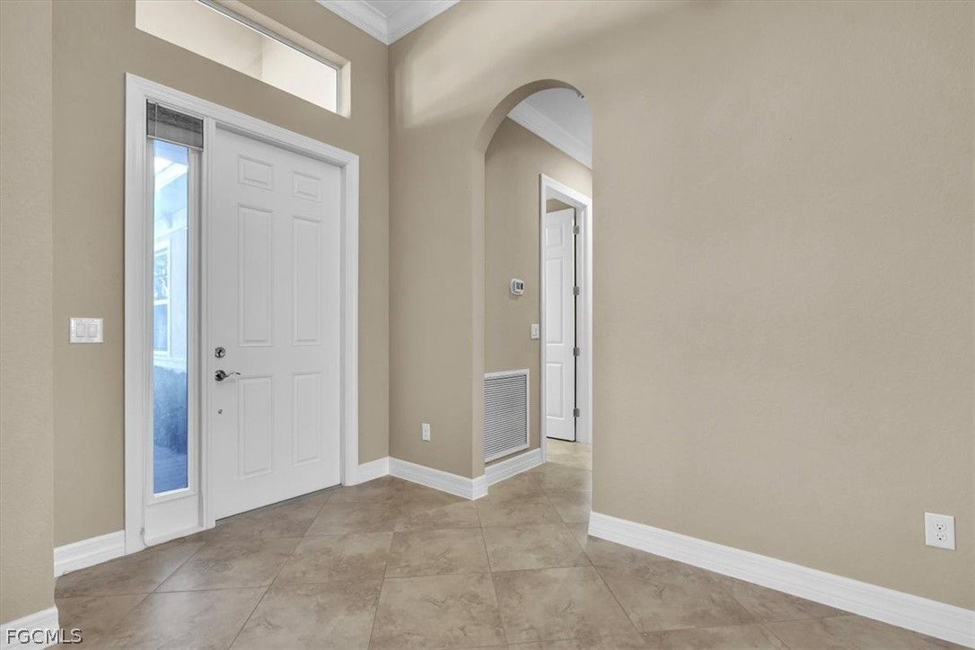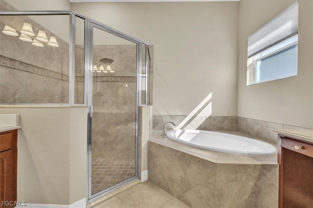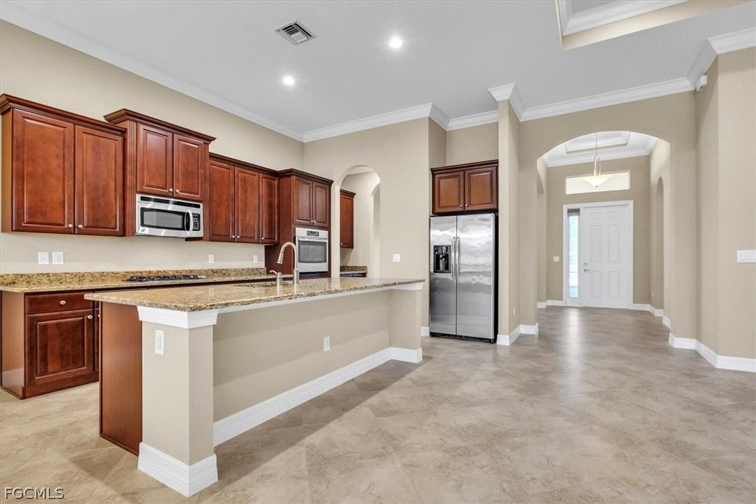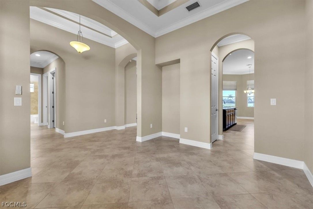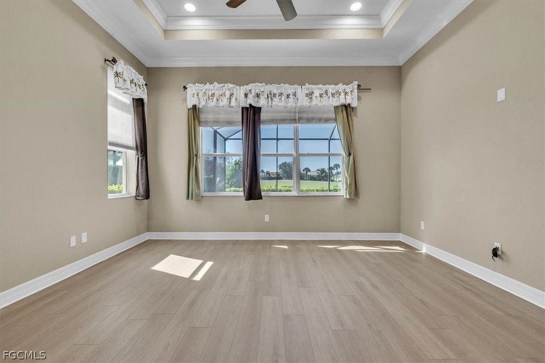 Come and see this stunning 3-bedroom, 2.5-bathroom, a formal dining room adjacent to the kitchen that can be converted into a sitting area or den; home boasting 2020 sq. ft. of living space. The Anna model, built by Kolter, is located in the highly sought-after Gated Verandah Community. From the moment you drive up to the stone front elevation, you will be captivated by the beauty of this home. Upon entering, you are welcomed by a spacious foyer leading to a large dining room with a butler's pantry adjacent to the kitchen. The open floor plan flows seamlessly into the family room and kitchen area. The kitchen is equipped with ample cooking space, granite countertops, large cabinets, and a nearby pantry. The breakfast nook offers a breathtaking view of the Golf course, creating a cozy atmosphere. The primary bedroom, located off the family room, overlooks the Golf Course and features dual closets, dual sinks one with a vanity, a separate shower and tub, and plenty of natural light. The guest bedrooms are well-sized and separated from the master suite for added privacy. This home boasts 14-foot high ceilings with crown molding, elegant tray ceilings in the main living areas and primary bedroom, diagonal tile flooring throughout, and newly installed LVP flooring in all bedrooms. It also includes impact glass windows and doors with electric storm shutters in the lanai area. The appliances are newer, with the AC replaced in '21 and the pool heater in '23. The outdoor space offers ample room under roof for relaxing with family and friends and also has several other areas for sunbathing or sitting in the lanai. The saltwater heated pool and spa provide a stunning view of the Golf Course, #11 on Whispering Oaks while maintaining privacy from cart and golfer traffic. Verandah is a vibrant community with 36 holes of Championship Golf designed by Bob Cupp and Jack Nicklaus, a fitness center, tennis courts, pickleball, bocce, kayaks, playground, dog park, 9 miles of walking and jogging paths, multiple restaurants one of which has a view of the Orange River, and an active social and event calendar that can satisfy everyone's needs. Rarely do homes of this caliber become available in such a desirable neighborhood and community at such an attractive price. Don't miss this opportunity to secure your place in Paradise. Come and see it before it's gone.