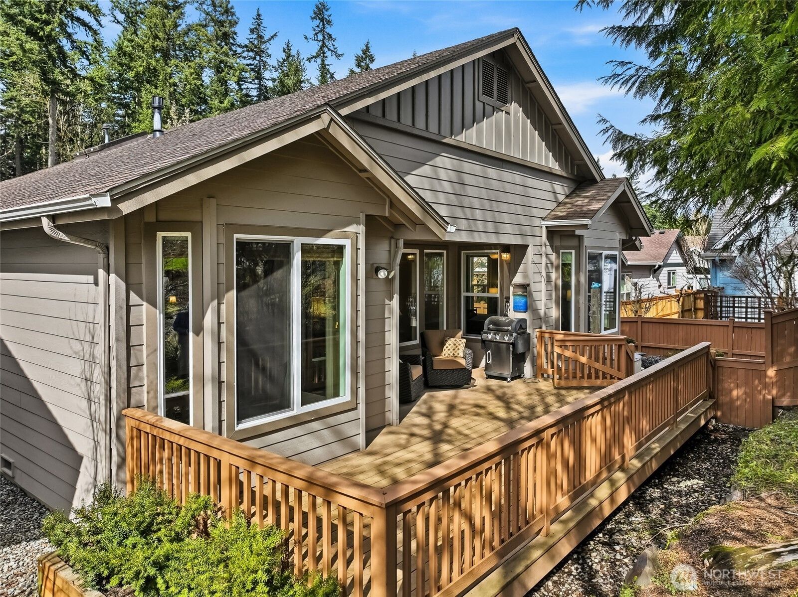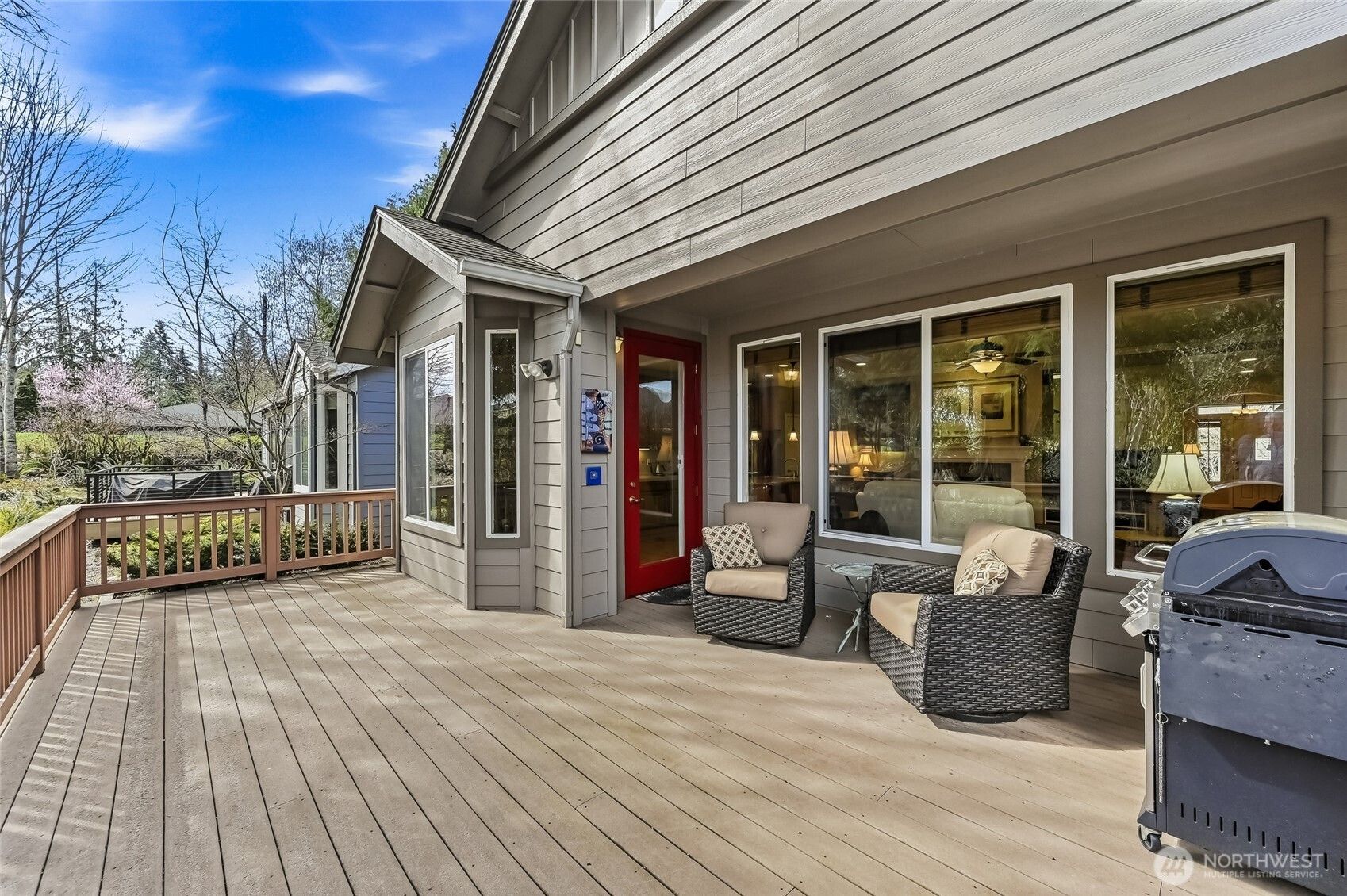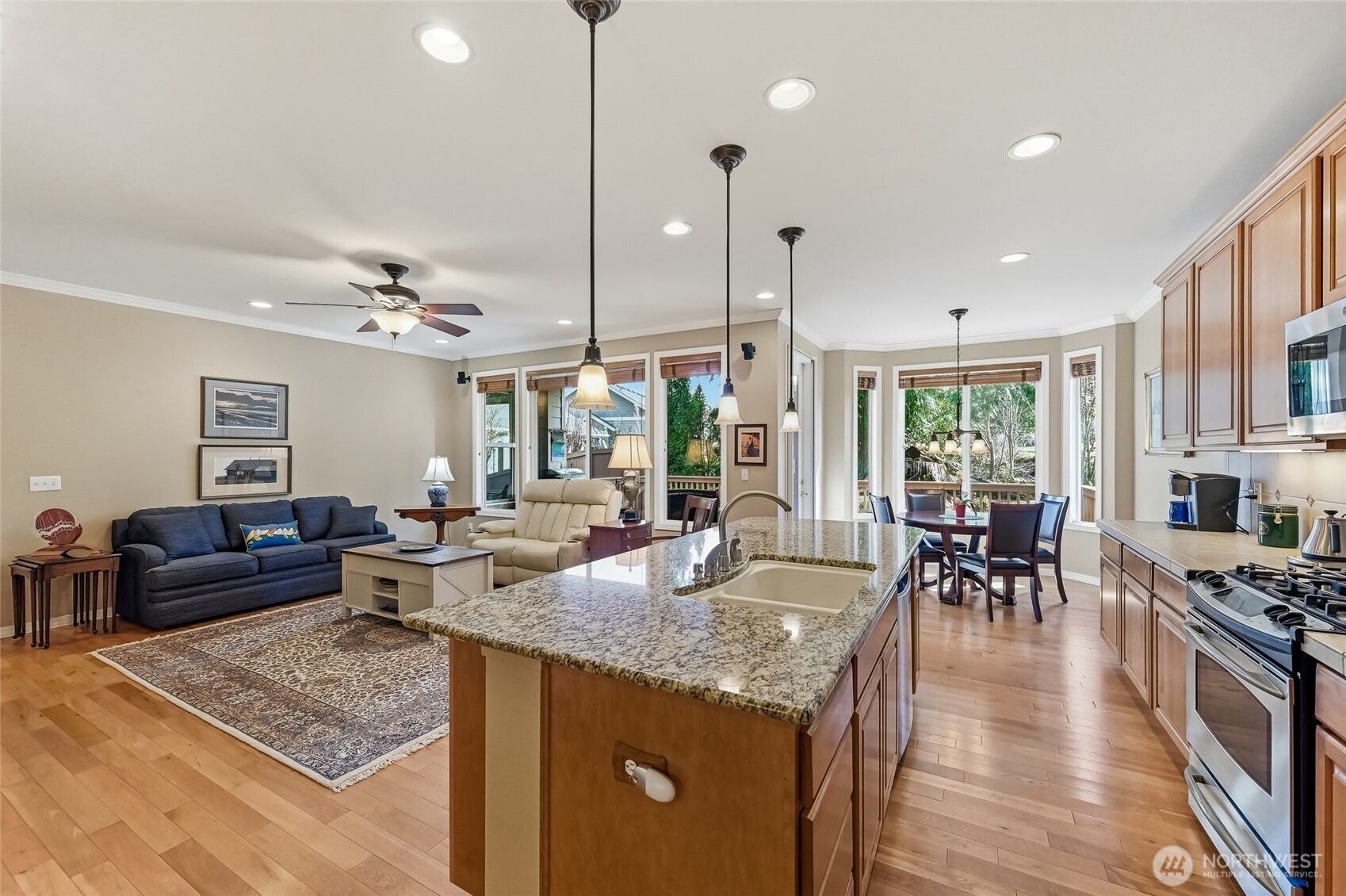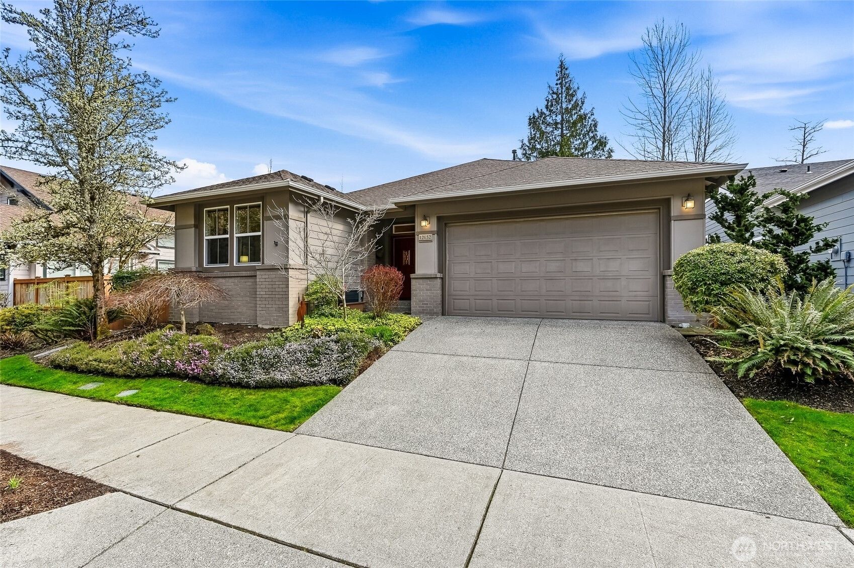 Captivating greenspace views that expand out to the golf course from this beautiful Bainbridge home. Enjoy easy living in this one level home with a peaceful & private setting just a couple of level blocks to the clubhouse. Warm hardwood floors run through the main living areas and there are distinctive architectural design elements such as crown molding, the curved wall and four panel skylight. The great room works perfectly for today’s lifestyles & has a surround sound system that includes a Denon amplifier and Sony speakers. The dining room seats 12 and is a wonderful space for holiday and special occasions dinners. Island kitchen with extra cabinets + pull-out shelves, wine fridge and a convenient day desk. Handsome office with gorgeous wood bookcases, cabinets, desk spaces and glass doors. Primary bedroom w/a ¾ bath, linen cabinet & walk-in closet w/organizers. Guest bedroom & full bath. Brand new W/D plus a utility sink in the laundry room. Generous garage w/work bench and shelving. Fully fenced backyard, nice deck and brick patio w/an included gas BBQ. New attic insulation, H20 tank & recirc hot water pump. Air con for hot summer days. A short jaunt to the clubhouse, the hub of Trilogy activities! Pre-inspected. Ages 55+