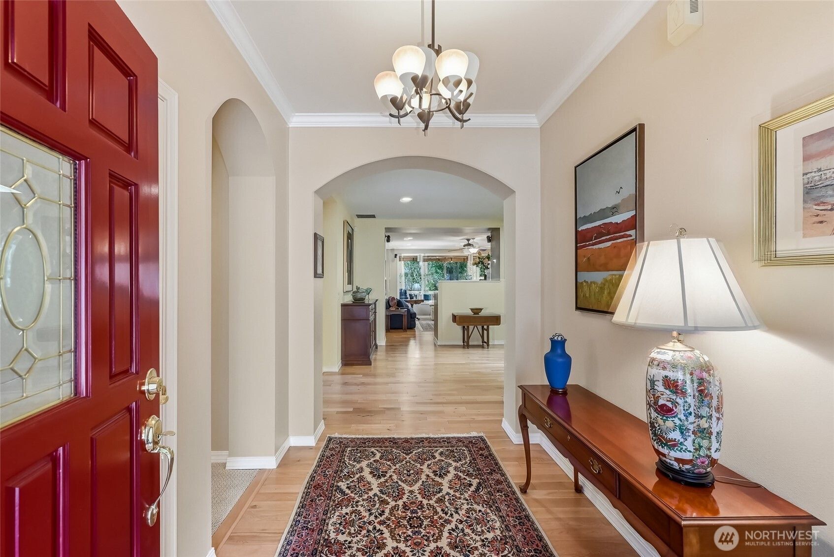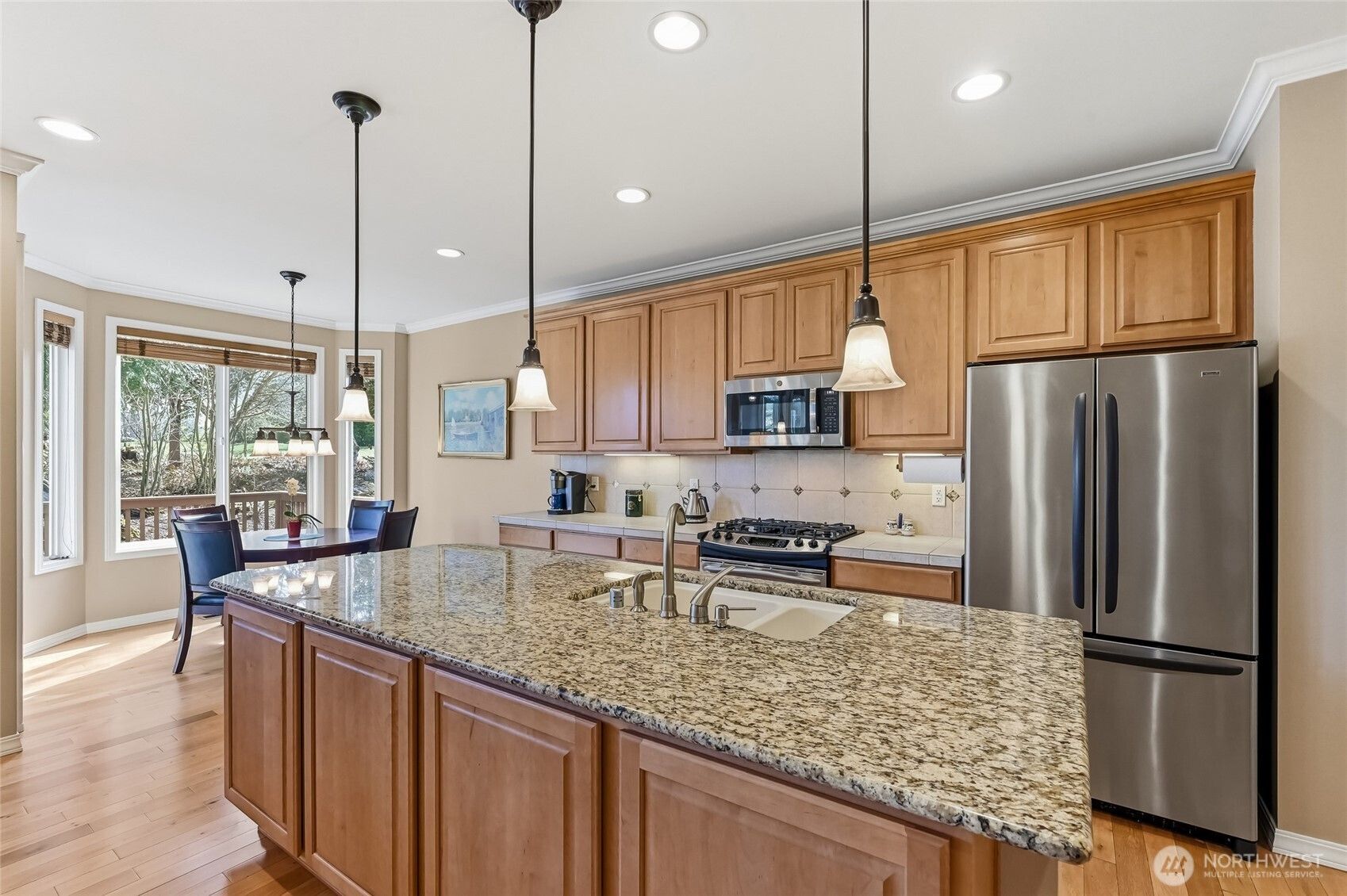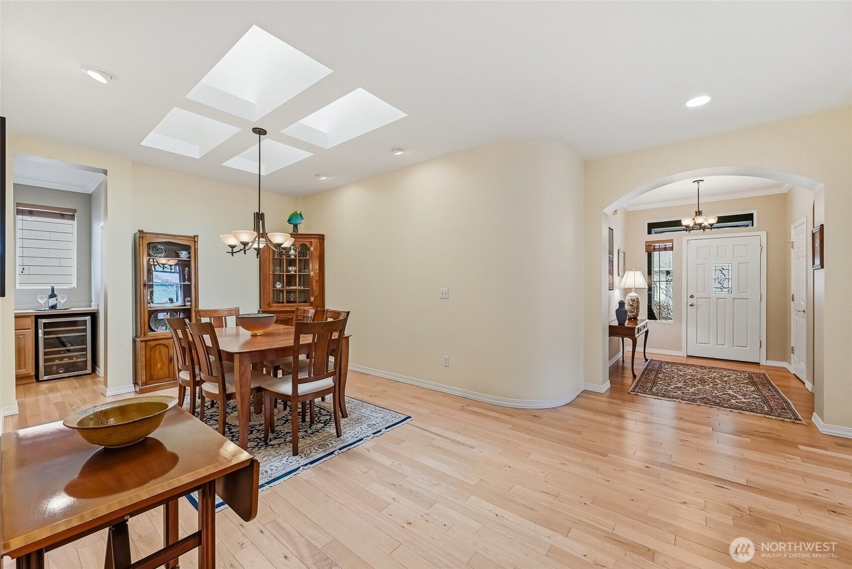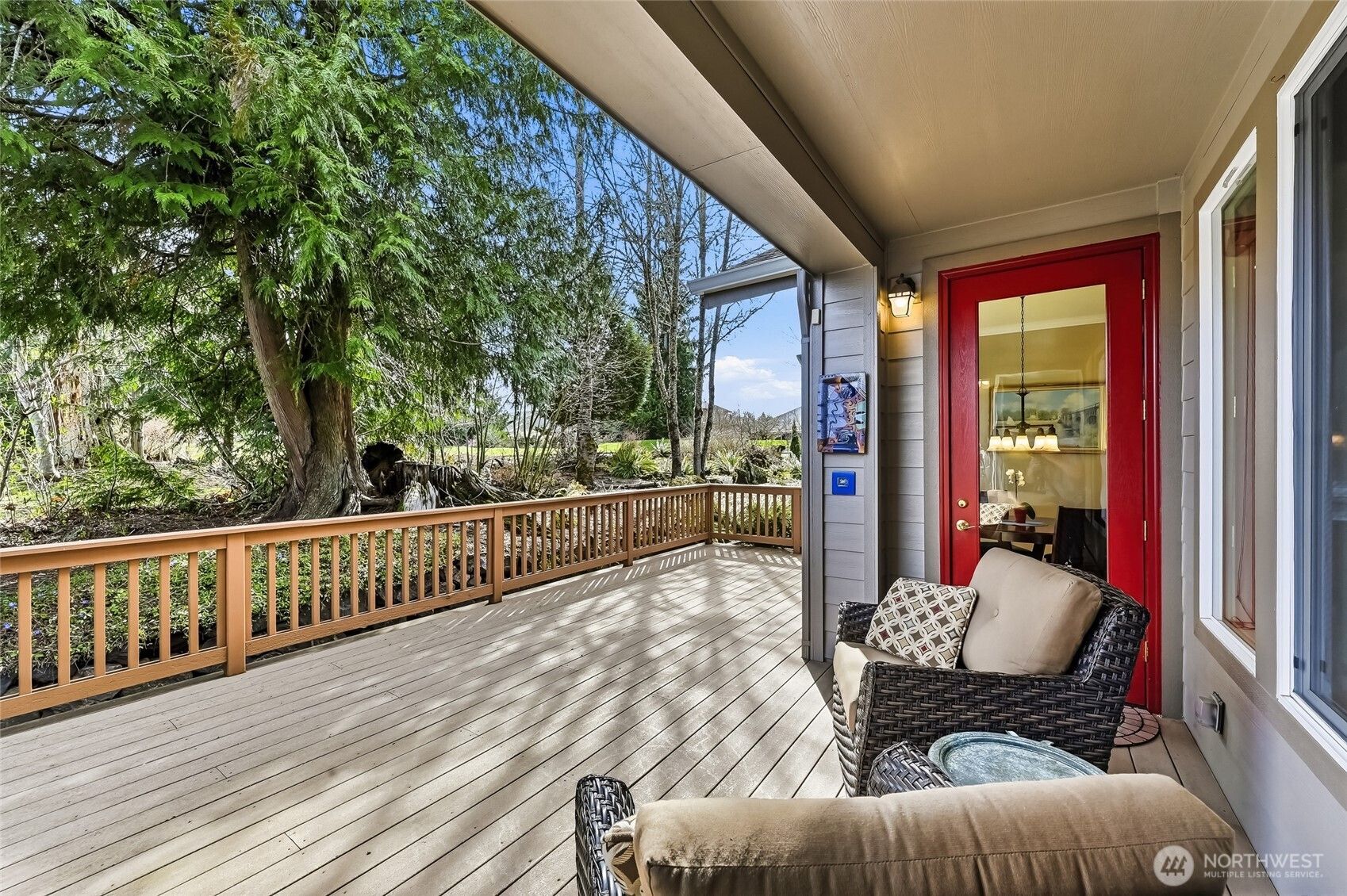 Captivating greenspace views that expand out to the golf course from this beautiful Bainbridge home. Enjoy easy living in this one level home with a peaceful & private setting just a couple of level blocks to the clubhouse. Warm hardwood floors run through the main living areas and there are distinctive architectural design elements such as crown molding, the curved wall and four panel skylight. The great room works perfectly for today’s lifestyles & has a surround sound system that includes a Denon amplifier and Sony speakers. The dining room seats 12 and is a wonderful space for holiday and special occasions dinners. Island kitchen with extra cabinets + pull-out shelves, wine fridge and a convenient day desk. Handsome office with gorgeous wood bookcases, cabinets, desk spaces and glass doors. Primary bedroom w/a ¾ bath, linen cabinet & walk-in closet w/organizers. Guest bedroom & full bath. Brand new W/D plus a utility sink in the laundry room. Generous garage w/work bench and shelving. Fully fenced backyard, nice deck and brick patio w/an included gas BBQ. New attic insulation, H20 tank & recirc hot water pump. Air con for hot summer days. A short jaunt to the clubhouse, the hub of Trilogy activities! Pre-inspected. Ages 55+