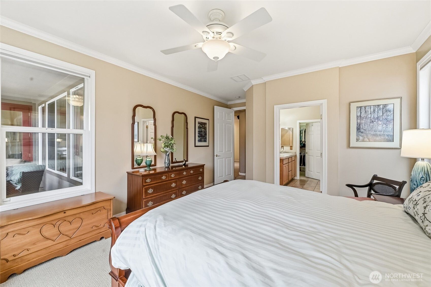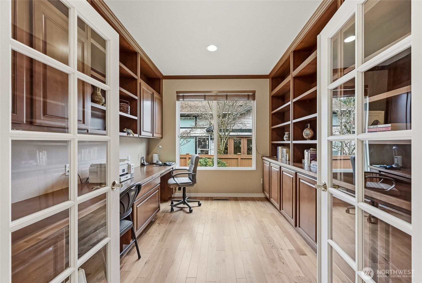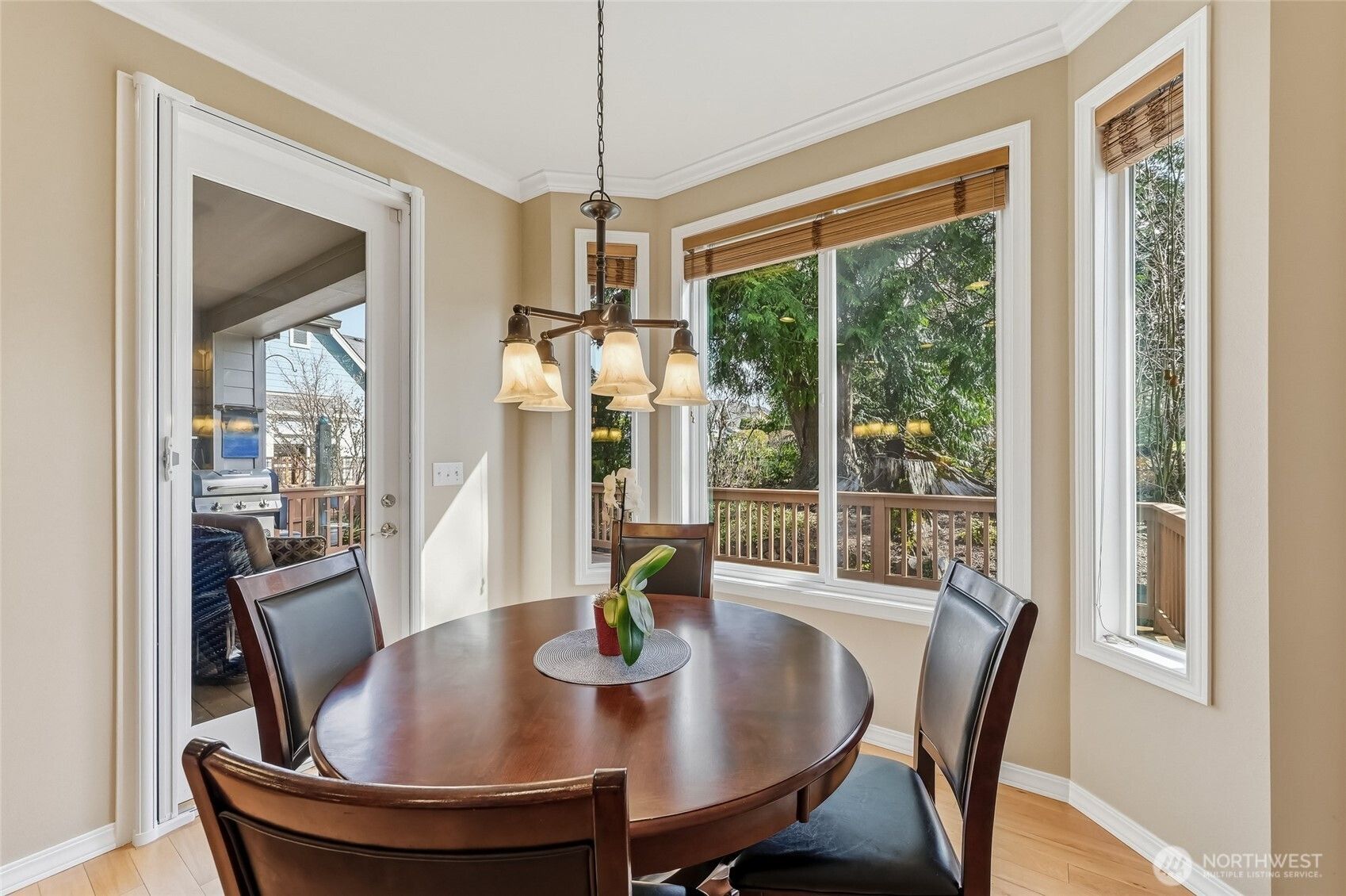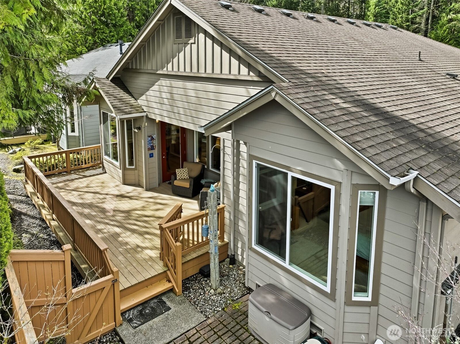 Captivating greenspace views that expand out to the golf course from this beautiful Bainbridge home. Enjoy easy living in this one level home with a peaceful & private setting just a couple of level blocks to the clubhouse. Warm hardwood floors run through the main living areas and there are distinctive architectural design elements such as crown molding, the curved wall and four panel skylight. The great room works perfectly for today’s lifestyles & has a surround sound system that includes a Denon amplifier and Sony speakers. The dining room seats 12 and is a wonderful space for holiday and special occasions dinners. Island kitchen with extra cabinets + pull-out shelves, wine fridge and a convenient day desk. Handsome office with gorgeous wood bookcases, cabinets, desk spaces and glass doors. Primary bedroom w/a ¾ bath, linen cabinet & walk-in closet w/organizers. Guest bedroom & full bath. Brand new W/D plus a utility sink in the laundry room. Generous garage w/work bench and shelving. Fully fenced backyard, nice deck and brick patio w/an included gas BBQ. New attic insulation, H20 tank & recirc hot water pump. Air con for hot summer days. A short jaunt to the clubhouse, the hub of Trilogy activities! Pre-inspected. Ages 55+