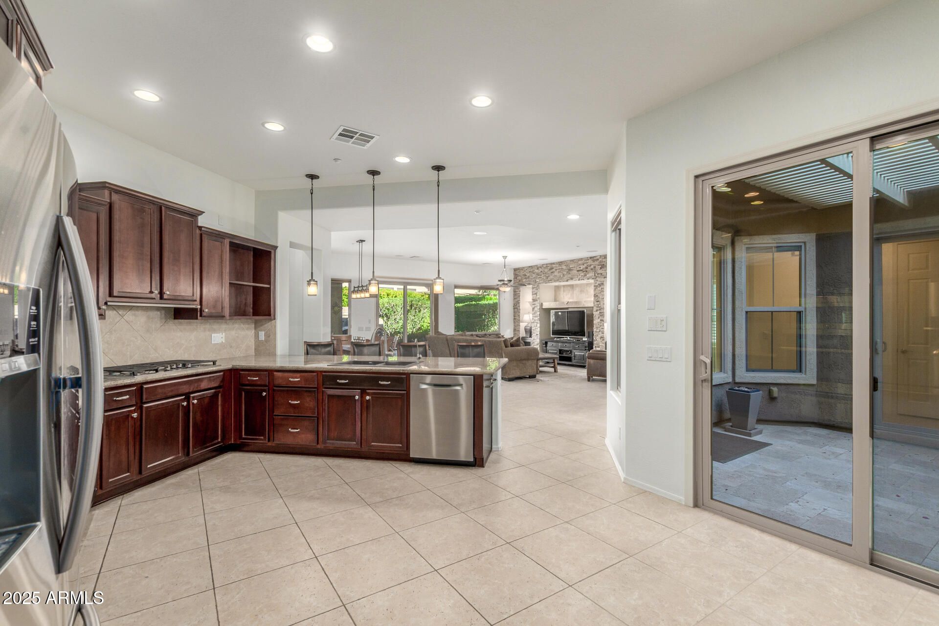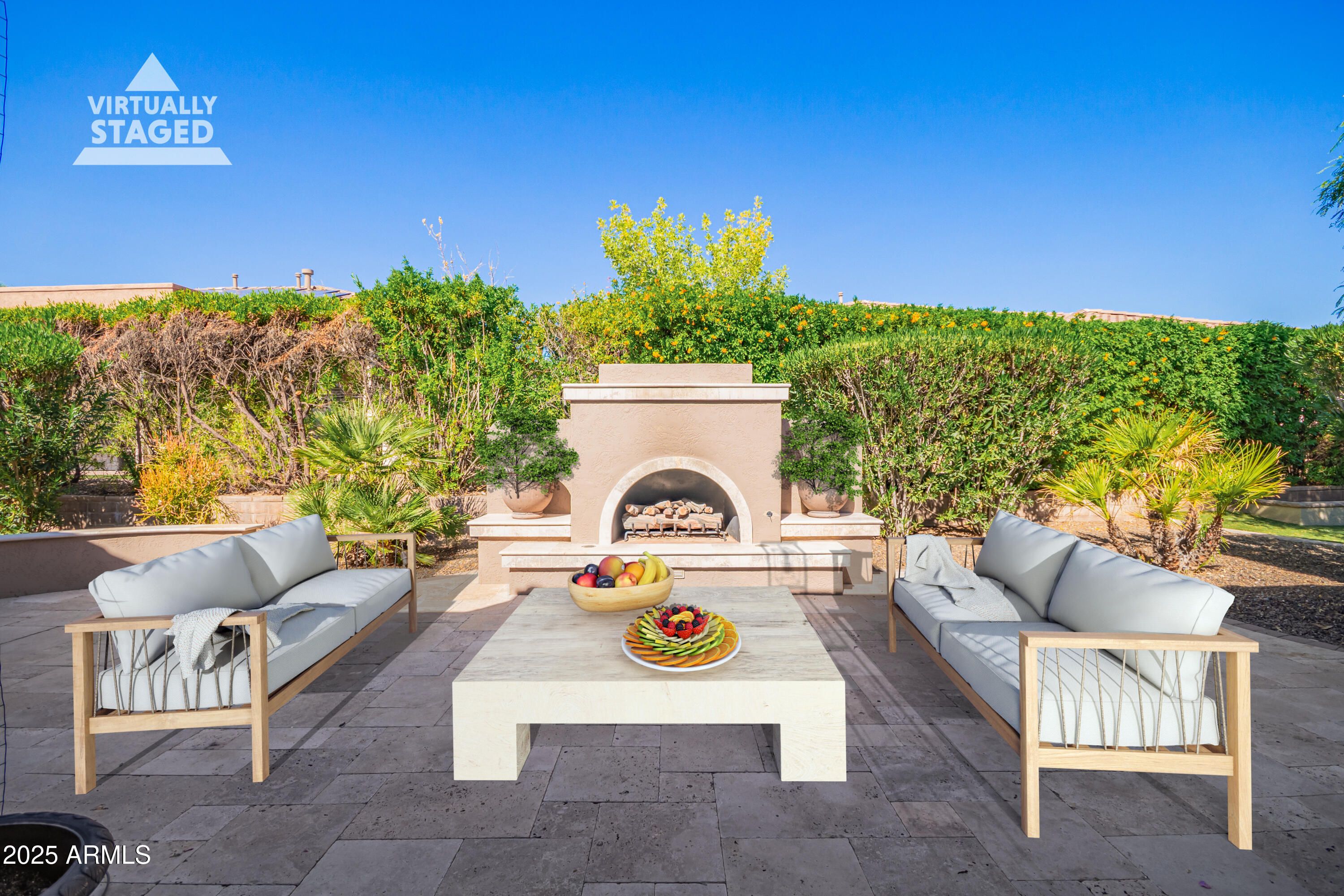 Step into this exquisite Civitas model, where style meets serenity in a beautifully designed private backyard oasis complete with a built-in BBQ, elegant gas fireplace, and timeless travertine pavers—perfect for relaxing evenings or effortless entertaining. A welcoming travertine courtyard leads you inside to a tastefully updated home featuring gorgeous tile flooring throughout, plantation shutters, and refreshed bathrooms with refined finishes. The chef-inspired kitchen is both functional and beautiful, offering stainless steel appliances, a gas cooktop, new Bosch dishwasher, R/O system, and convenient roll-out shelving—an ideal space for cooking, gathering, and creating memories. The split floor plan ensures comfort and privacy, giving guests their own inviting suite. Enjoy peace of mind with thoughtful upgrades including a new washer & dryer (2023) and a new HVAC unit (2025). This home is the ultimate turnkey opportunity fully furnished and truly move-in ready. Simply bring your suitcase and start enjoying the lifestyle you've been dreaming of.