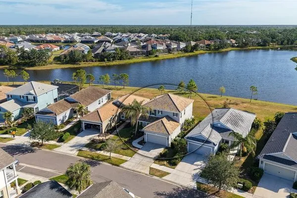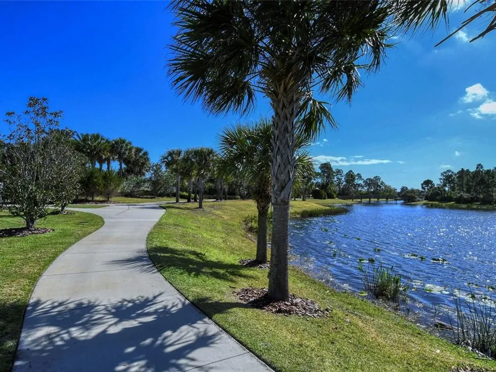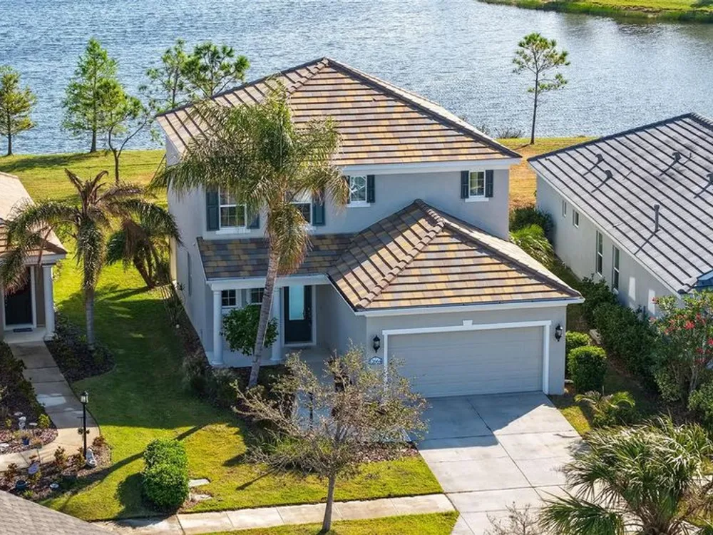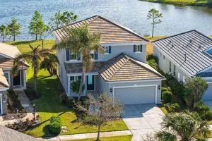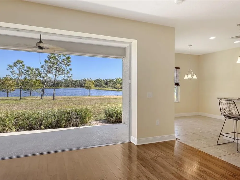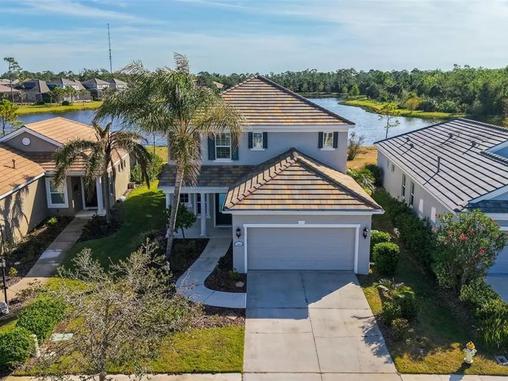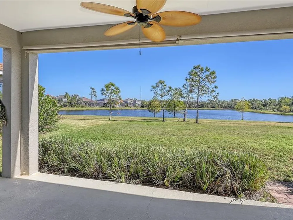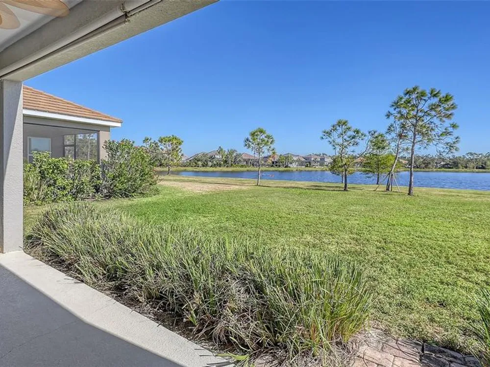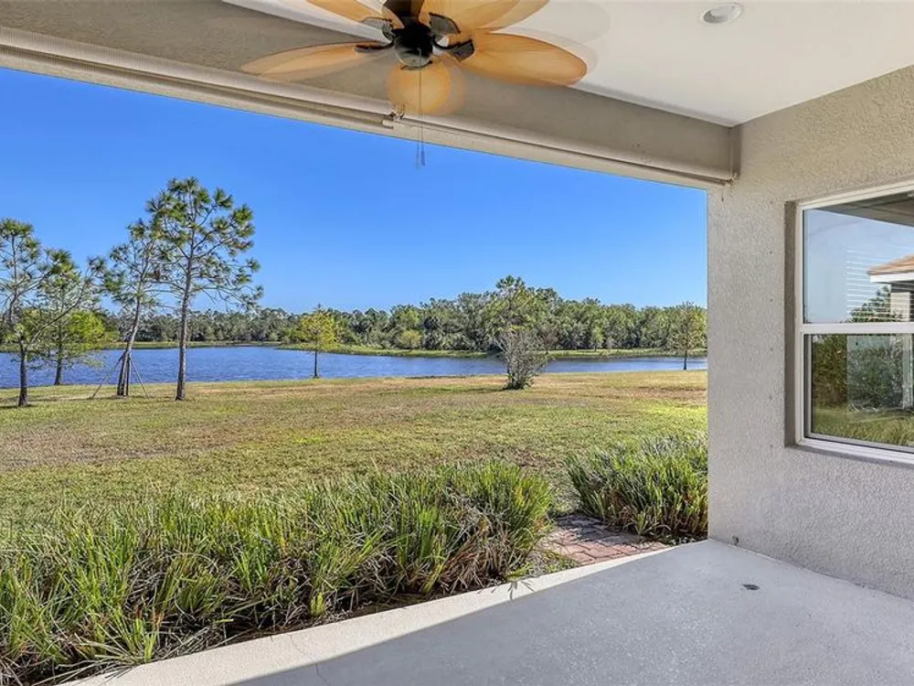 One or more photo(s) has been virtually staged. Short Sale. SHORT SALE. Discover this stunning 4-bedroom, 2.5-bath, 2-car garage, 2-story *LAKEFRONT* home nestled in the vibrant gated community of Grand Palm in Venice. As you step inside, you will be welcomed by an open floor plan featuring high ceilings, warm tones, and new laminate flooring. A picturesque setting of serene water views is set when you walk through the front entrance. Just slide open the 3 door pocket slider in living room to bring in fresh air. Step outside to the covered lanai, where you can savor the tranquility of the large private backyard with eastern exposure and even enjoy your morning coffee while watching the sunrise over the lake.The kitchen has cherrywood cabinets, granite countertops, stainless steel appliances, and a breakfast bar. Create dishes like a pro with the gas range stove. The formal dining room and casual dining area provide a perfect setting for both intimate gatherings and lively meals. The dining room is a flex space and could be used as an office or secondary sitting area.