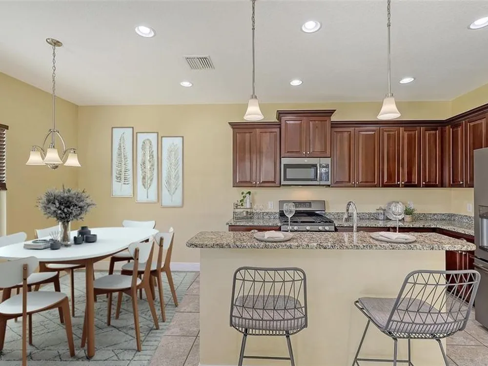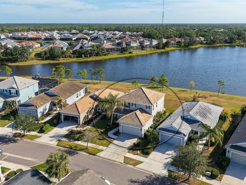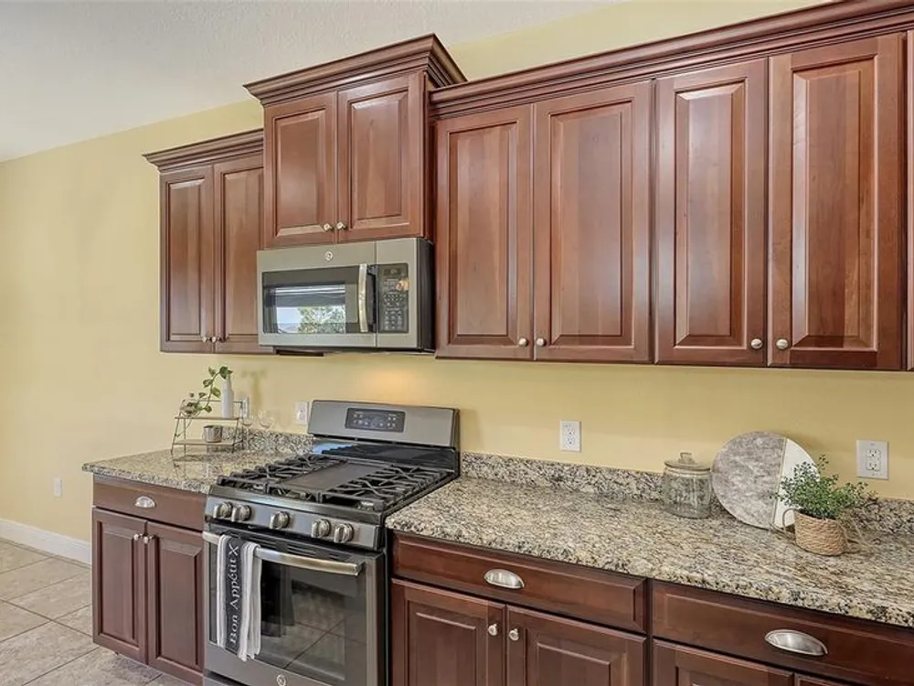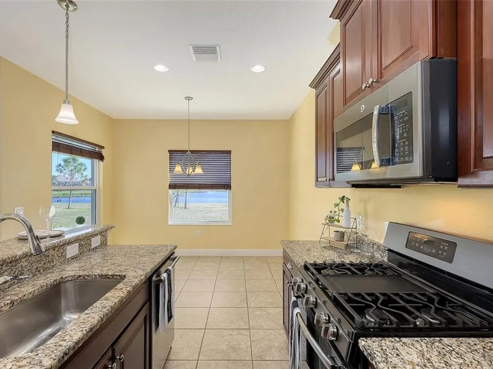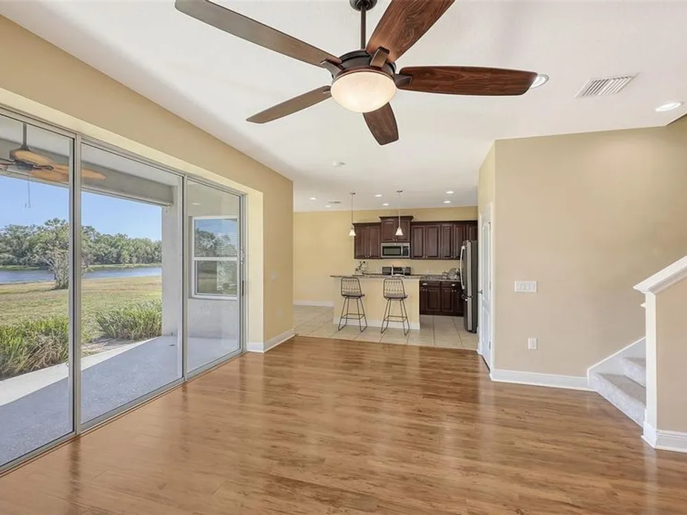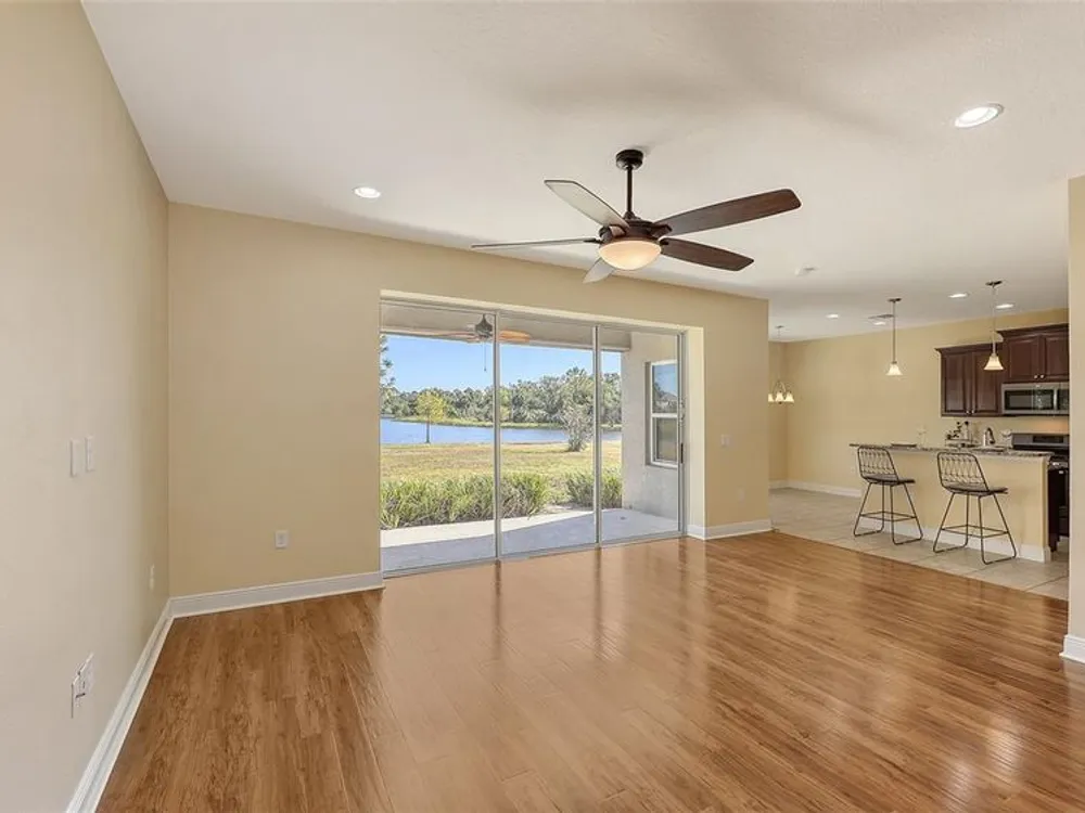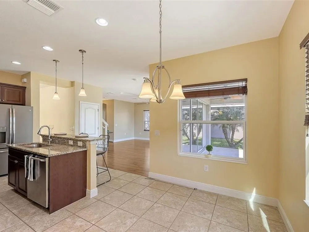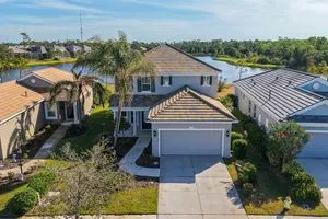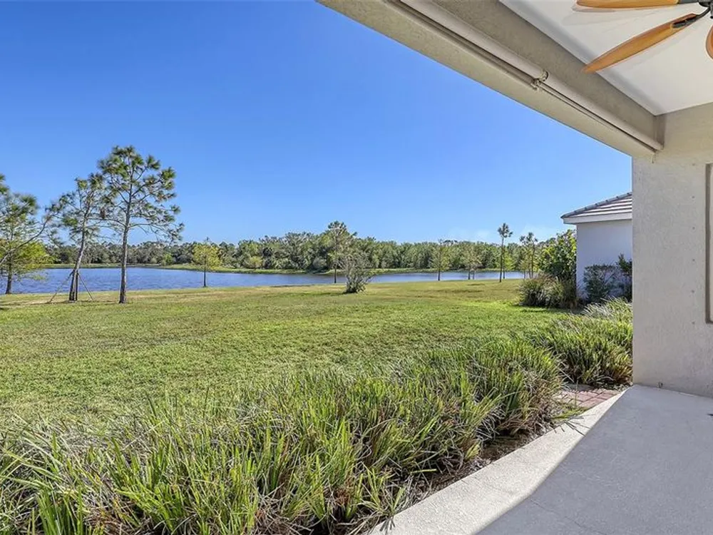 One or more photo(s) has been virtually staged. Short Sale. SHORT SALE. Discover this stunning 4-bedroom, 2.5-bath, 2-car garage, 2-story *LAKEFRONT* home nestled in the vibrant gated community of Grand Palm in Venice. As you step inside, you will be welcomed by an open floor plan featuring high ceilings, warm tones, and new laminate flooring. A picturesque setting of serene water views is set when you walk through the front entrance. Just slide open the 3 door pocket slider in living room to bring in fresh air. Step outside to the covered lanai, where you can savor the tranquility of the large private backyard with eastern exposure and even enjoy your morning coffee while watching the sunrise over the lake.The kitchen has cherrywood cabinets, granite countertops, stainless steel appliances, and a breakfast bar. Create dishes like a pro with the gas range stove. The formal dining room and casual dining area provide a perfect setting for both intimate gatherings and lively meals. The dining room is a flex space and could be used as an office or secondary sitting area.