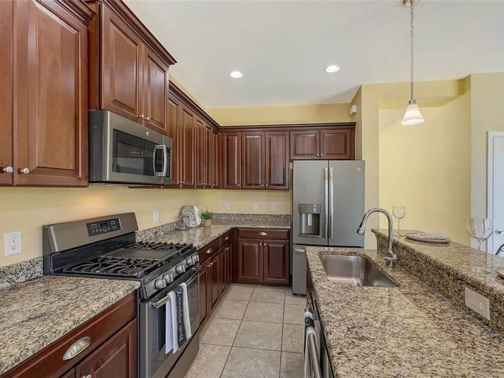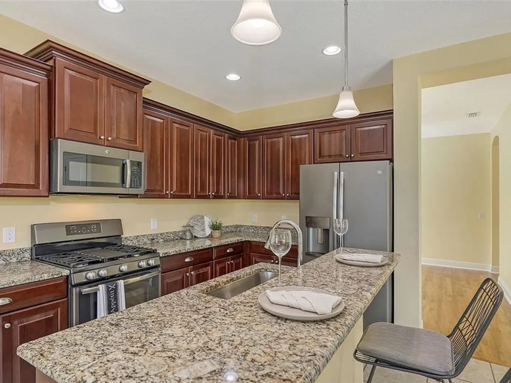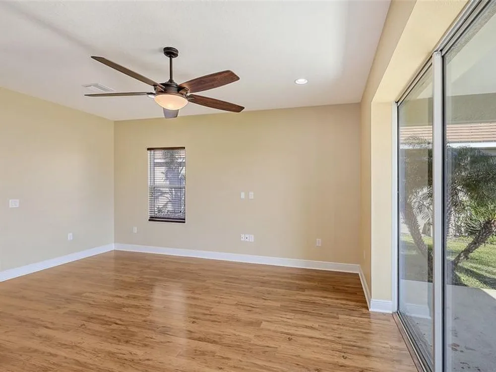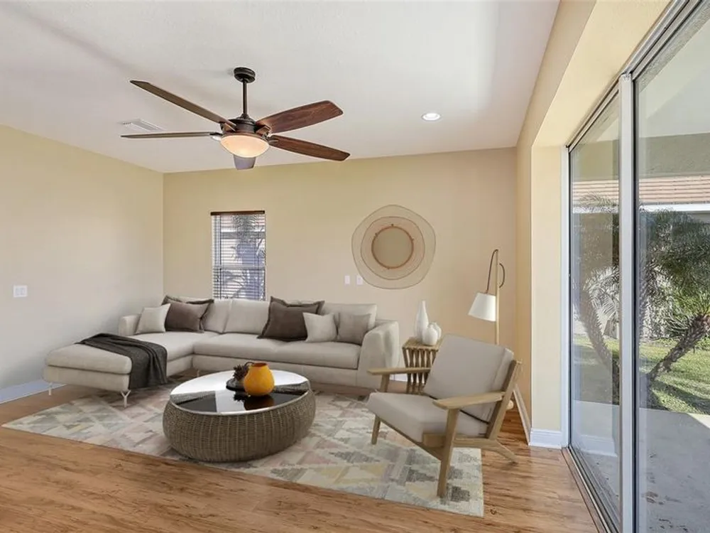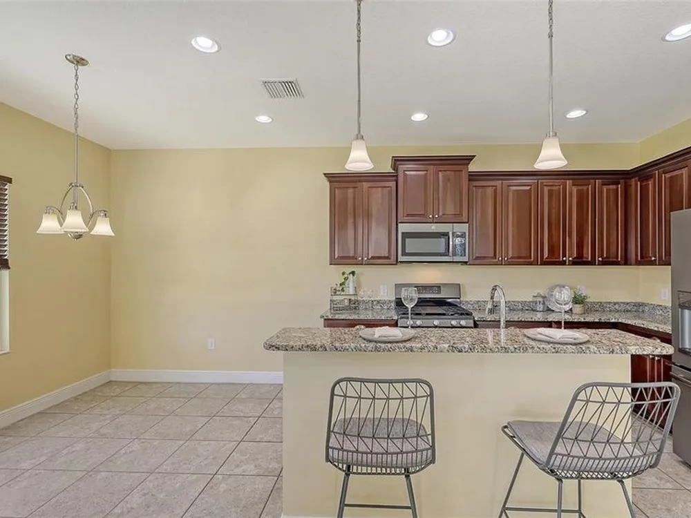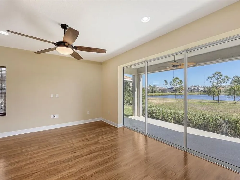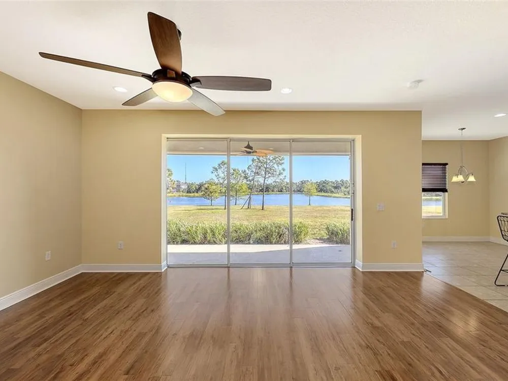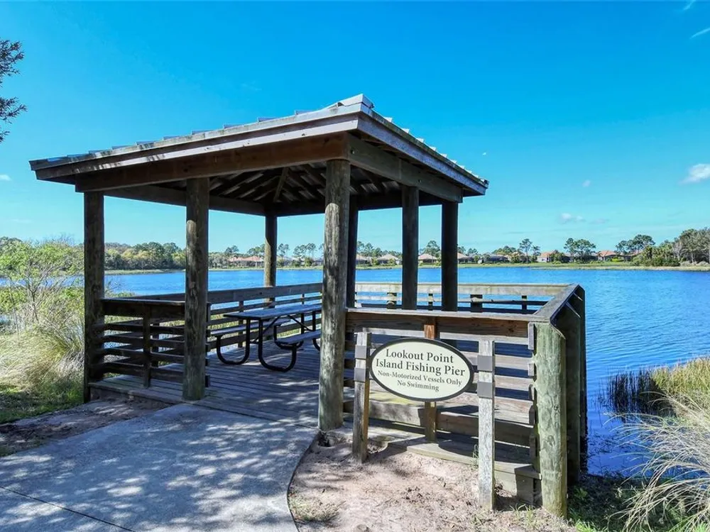 One or more photo(s) has been virtually staged. Short Sale. SHORT SALE. Discover this stunning 4-bedroom, 2.5-bath, 2-car garage, 2-story *LAKEFRONT* home nestled in the vibrant gated community of Grand Palm in Venice. As you step inside, you will be welcomed by an open floor plan featuring high ceilings, warm tones, and new laminate flooring. A picturesque setting of serene water views is set when you walk through the front entrance. Just slide open the 3 door pocket slider in living room to bring in fresh air. Step outside to the covered lanai, where you can savor the tranquility of the large private backyard with eastern exposure and even enjoy your morning coffee while watching the sunrise over the lake.The kitchen has cherrywood cabinets, granite countertops, stainless steel appliances, and a breakfast bar. Create dishes like a pro with the gas range stove. The formal dining room and casual dining area provide a perfect setting for both intimate gatherings and lively meals. The dining room is a flex space and could be used as an office or secondary sitting area.