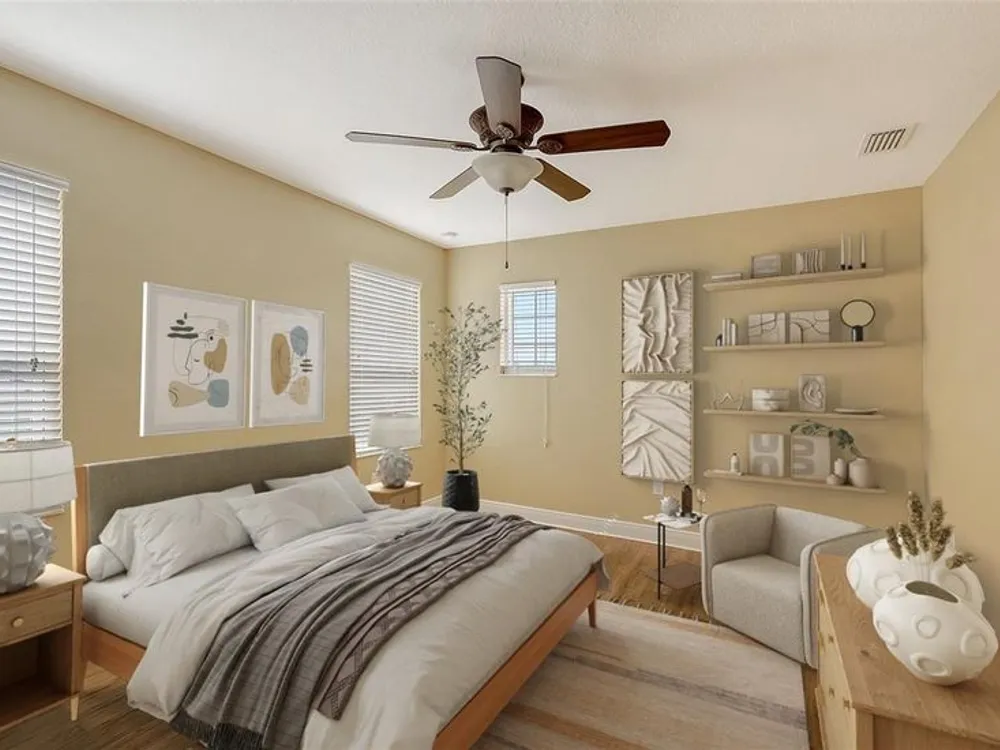 - Ceiling Fan(s), Eat-in Kitchen, High Ceilings, Kitchen/Family Room Combo, Open Floorplan, Solid-Wood Cabinets, Stone Counters, Thermostat, Walk-In Closet(s), Window Treatments