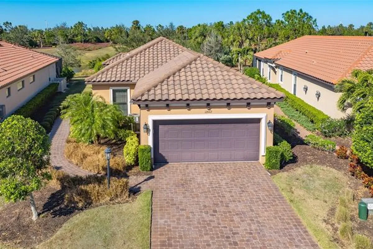 Discover an exceptional opportunity to own a single-family residence with a deeded golf membership in Esplanade Golf and Country Club. Built in 2018 and used only part of the year, this natural light-filled Roma model offers 1,685 square feet of thoughtfully designed living space. The open floor plan features 8-foot doors, tray ceilings, two spacious bedrooms, two full baths, a versatile den with glass French doors and a separate dining area. The kitchen is designed for style and functionality, showcasing 42-inch off-white cabinetry, quartz countertops, a subway tile backsplash, stainless steel appliances and a breakfast bar. A pantry and ample storage add convenience. Crown moldings enhance the tray ceilings in the great room, primary suite and dining area, creating a refined atmosphere. The primary bedroom includes a bay window, ample room for a king-size bed, a walk-in closet, and an en-suite bath with dual vanities, a private water closet and a rimless glass shower. The guest bedroom, also able to accommodate a king bed, is across the home, and features a walk-in closet. The den provides flexibility for a study or additional guest space. Outdoor living is effortless on the extended screened paver lanai, which is plumbed for natural gas and ideal for a future outdoor kitchen. The home’s exterior includes a paver driveway, a two-car garage with attic storage and landscape maintenance with irrigation service included. Furnishings are available.