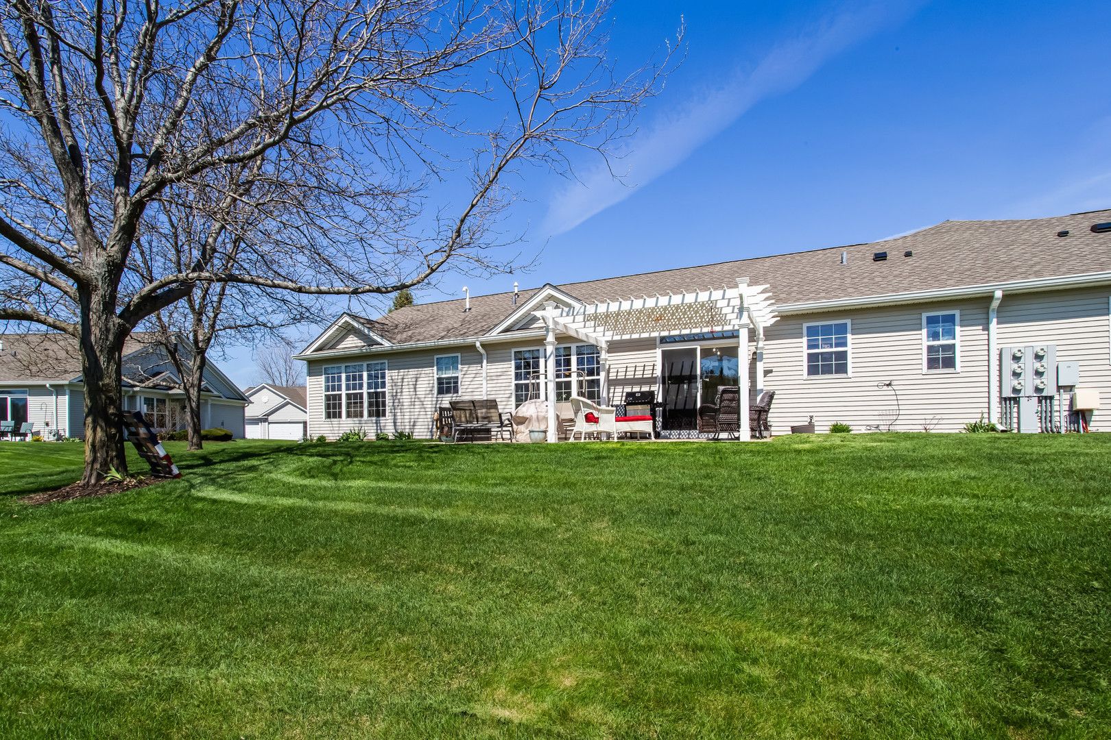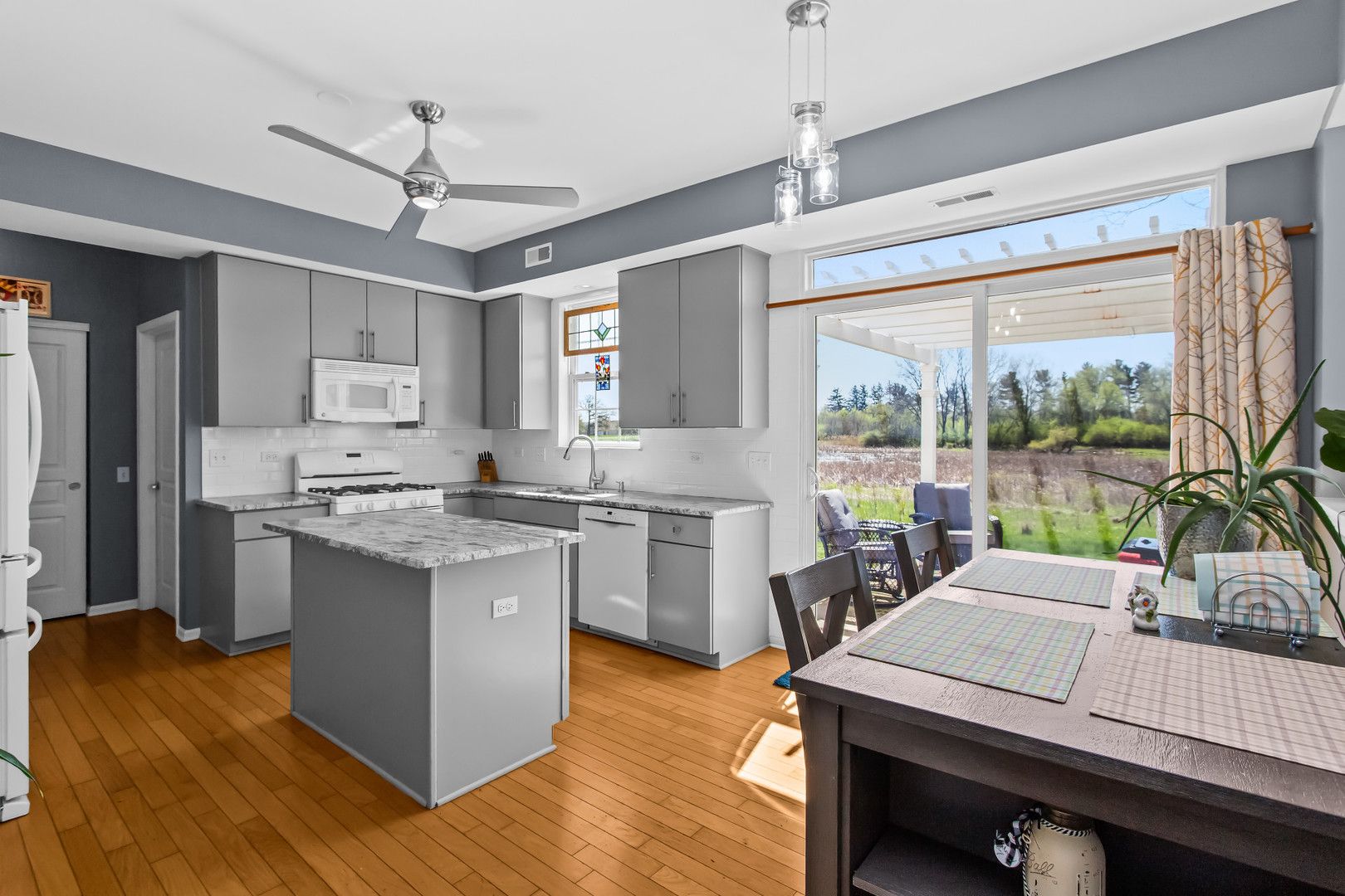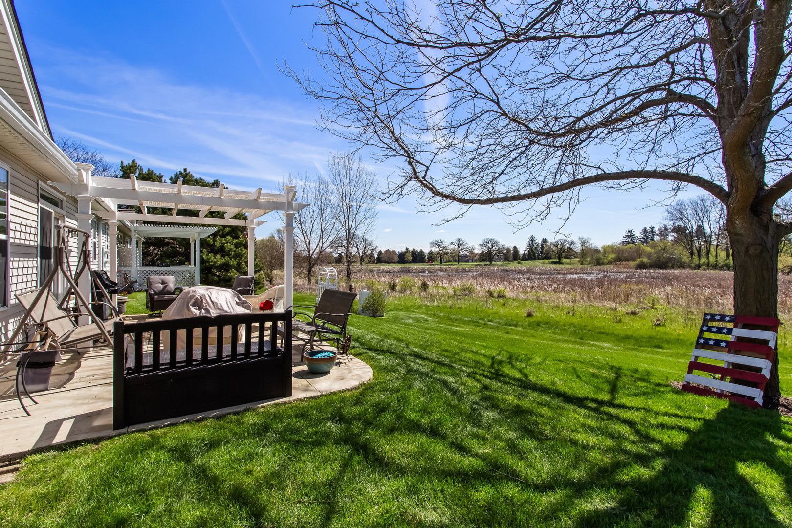 Experience resort-style living with one of the best views in this vibrant 55+ community-right from your expansive patio featuring a pergola and fire pit. Inside, an open-concept layout with hardwood floors throughout creates a seamless and inviting flow. The south-facing orientation fills the family room, dining area, and updated kitchen with abundant natural light. The kitchen is designed for both function and style, offering granite countertops, an island, a casual eating area, and professionally painted cabinetry. The primary suite has a walk-in closet, raised double vanity with quartz countertops, comfort-height toilet, a spacious shower with bench seating, and updated lighting and fixtures. A second bedroom provides guest space, while a conveniently located den or office just off the family room adds flexibility for work, crafting, or relaxation. Recent updates include a furnace (2021), water heater (2022), and a new roof, making this home truly move-in ready. Set within a premier active adult community spanning over 2,300 acres with more than 5,400 homes, residents enjoy an unmatched lifestyle. Amenities include golf, tennis, and pickleball, along with a 94,000-square-foot clubhouse featuring both indoor and outdoor pools and a 20-person whirlpool spa. Additional spaces include a grand ballroom, card room, ceramics and arts studios, sewing room, and computer lab. A second 20,000-square-foot lodge offers a full fitness center, aerobics and dance studios, meeting rooms, and another outdoor pool. Over one-third of the community is dedicated to protected open space and nature preserves, including the expansive Wildflower Park, home to miles of walking and biking trails surrounding a scenic 19-acre fishing lake. Come and enjoy everything this community has to offer!