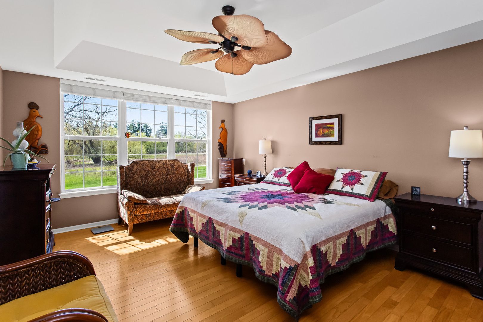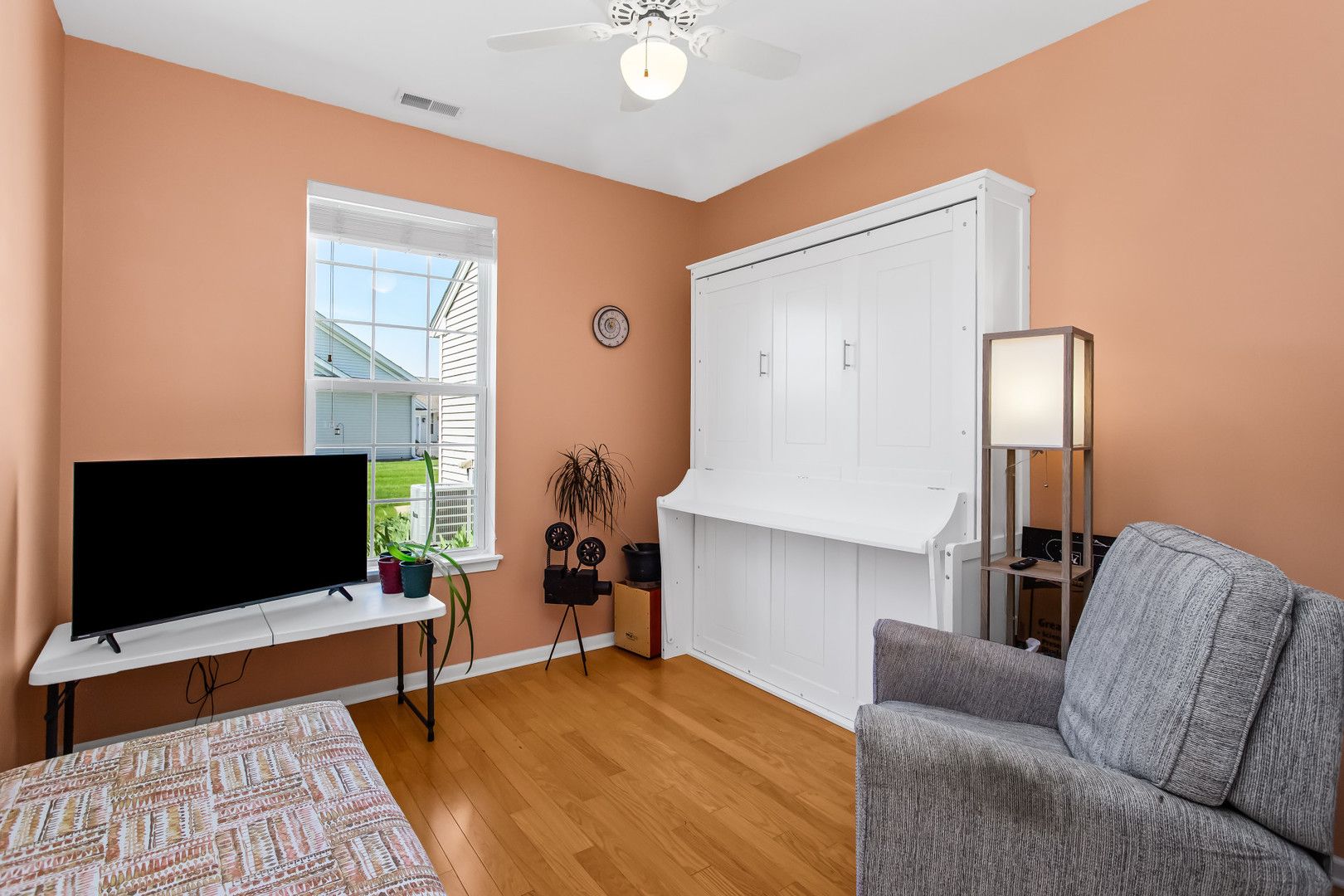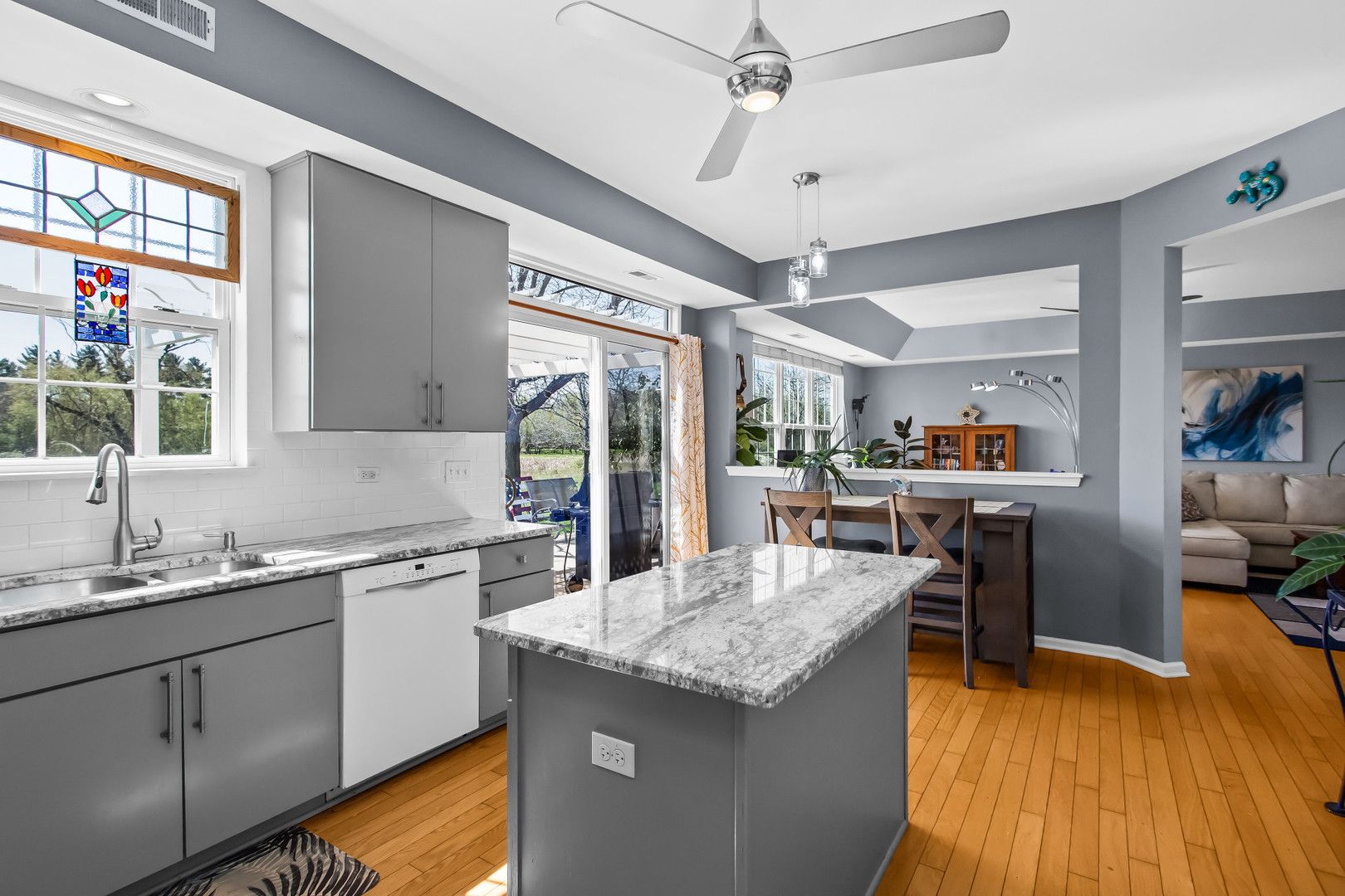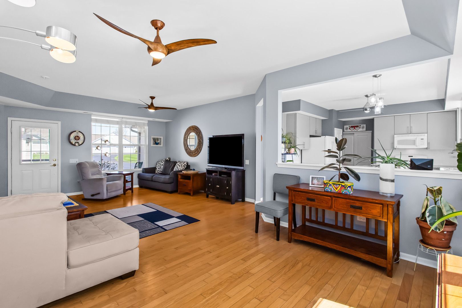 Experience resort-style living with one of the best views in this vibrant 55+ community-right from your expansive patio featuring a pergola and fire pit. Inside, an open-concept layout with hardwood floors throughout creates a seamless and inviting flow. The south-facing orientation fills the family room, dining area, and updated kitchen with abundant natural light. The kitchen is designed for both function and style, offering granite countertops, an island, a casual eating area, and professionally painted cabinetry. The primary suite has a walk-in closet, raised double vanity with quartz countertops, comfort-height toilet, a spacious shower with bench seating, and updated lighting and fixtures. A second bedroom provides guest space, while a conveniently located den or office just off the family room adds flexibility for work, crafting, or relaxation. Recent updates include a furnace (2021), water heater (2022), and a new roof, making this home truly move-in ready. Set within a premier active adult community spanning over 2,300 acres with more than 5,400 homes, residents enjoy an unmatched lifestyle. Amenities include golf, tennis, and pickleball, along with a 94,000-square-foot clubhouse featuring both indoor and outdoor pools and a 20-person whirlpool spa. Additional spaces include a grand ballroom, card room, ceramics and arts studios, sewing room, and computer lab. A second 20,000-square-foot lodge offers a full fitness center, aerobics and dance studios, meeting rooms, and another outdoor pool. Over one-third of the community is dedicated to protected open space and nature preserves, including the expansive Wildflower Park, home to miles of walking and biking trails surrounding a scenic 19-acre fishing lake. Come and enjoy everything this community has to offer!