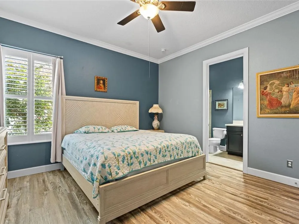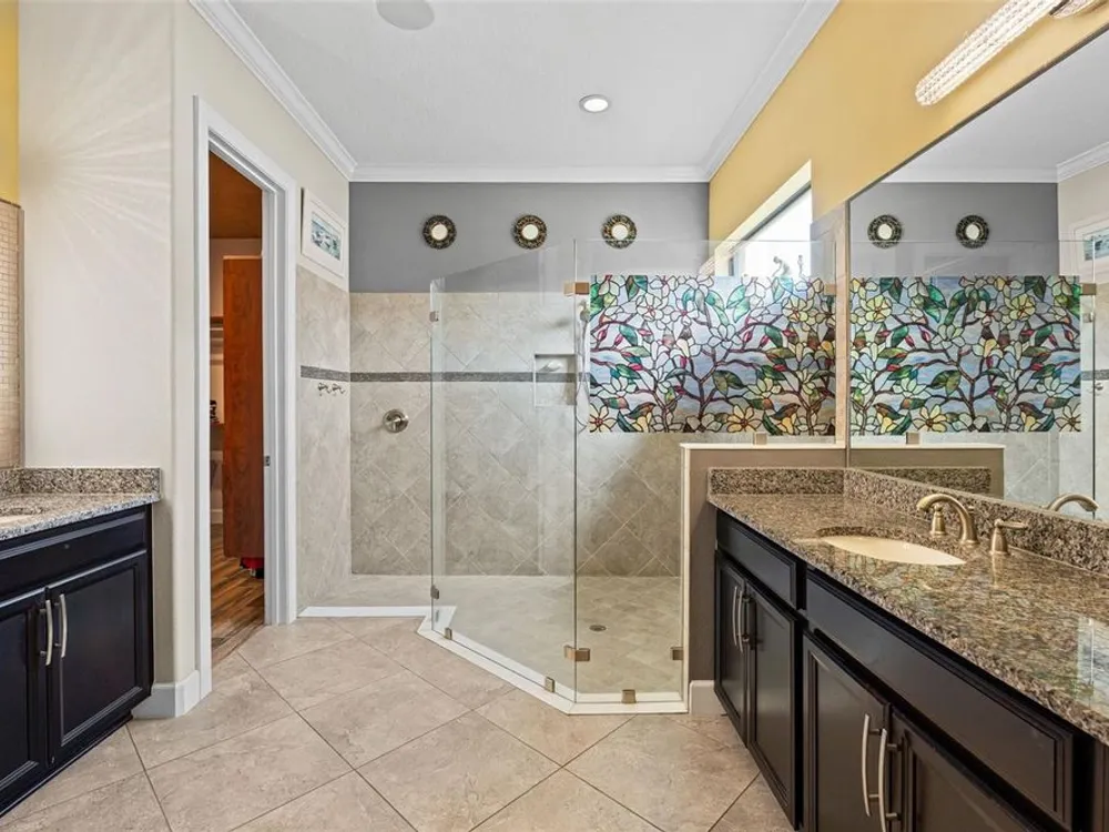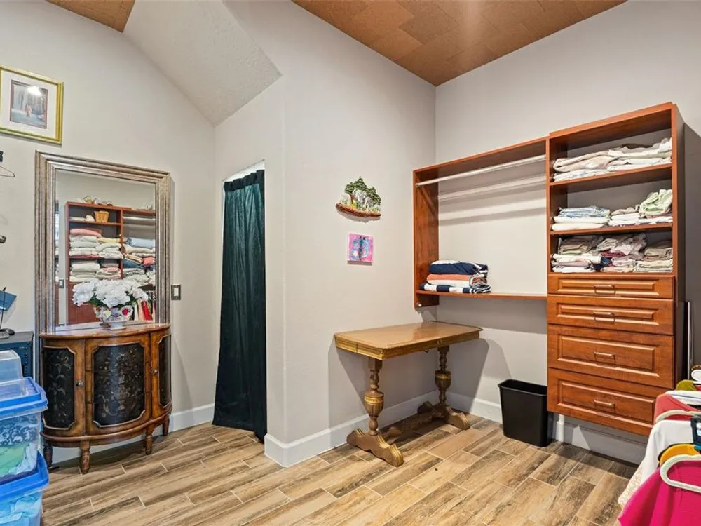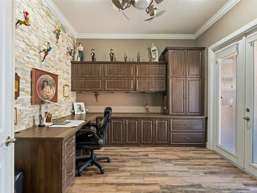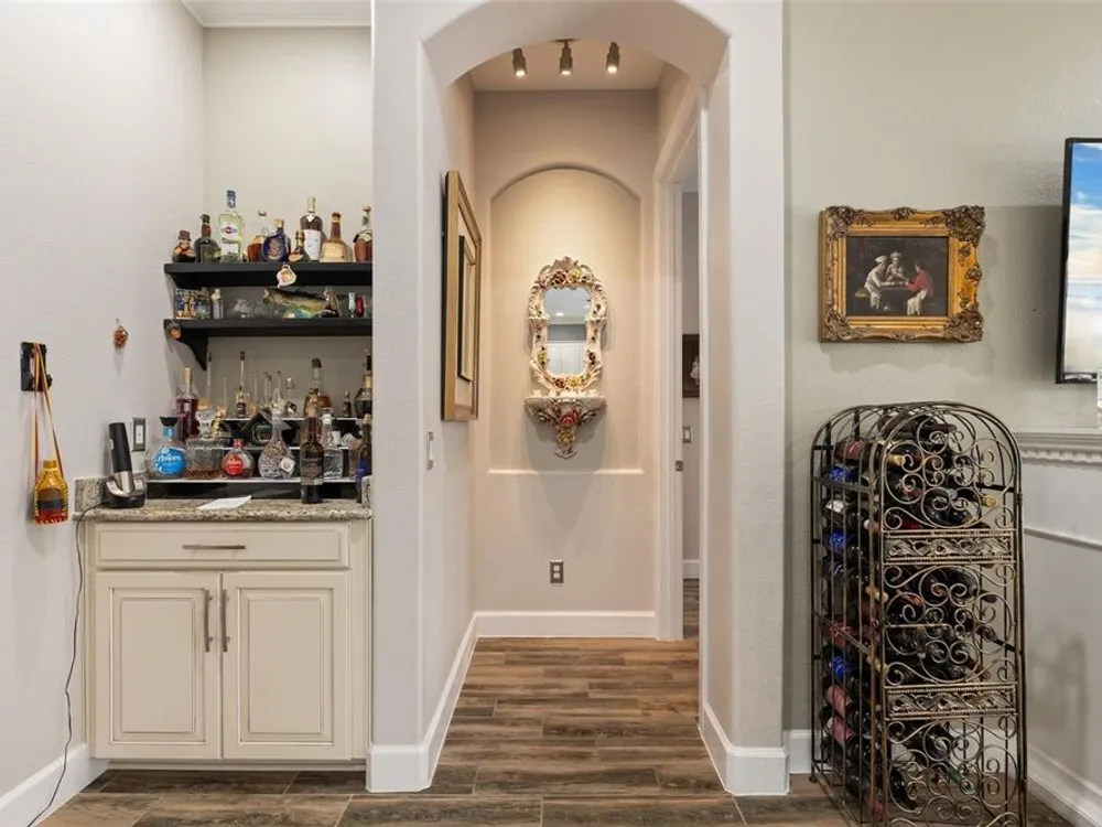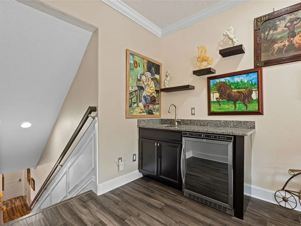 - Ceiling Fan(s), Central Vacuum, Chair Rail, Crown Molding, Dry Bar, Eat-in Kitchen, High Ceilings, Open Floorplan, Main Level Primary, Solid Surface Counters, Split Bedrooms, Walk-In Closet(s), Window Treatments